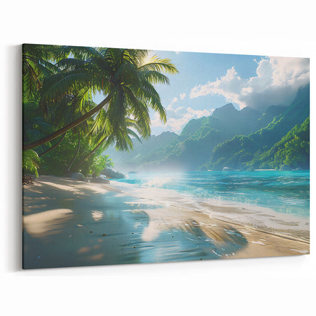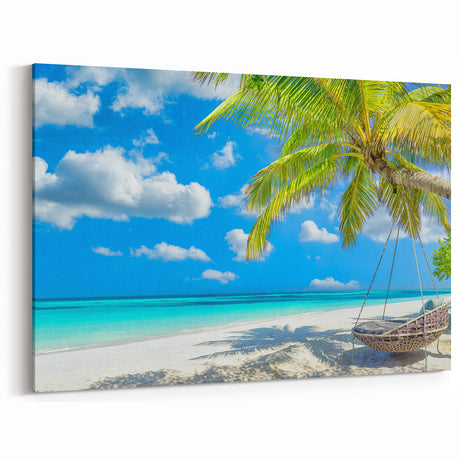 • Stretched canvas artwork showcasing a vibrant landscape of tropical beaches, with rich blue ocean hues and golden sandy shores, ideal for home decor. This artistic piece enhances any room's ambiance with its serene coastal scene, perfect for beach lovers and art enthusiasts alike.