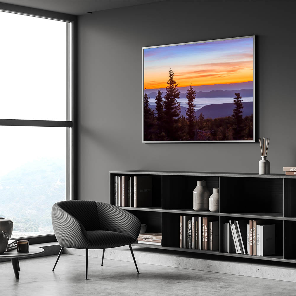 Bask in the peaceful beauty of a West Virginia sunset with this stunning wall art. The vibrant colors of the setting sun create a mesmerizing contrast with the misty mountain landscape and silhouetted trees, capturing the tranquil beauty of nature. This high-quality West Virginia nature art makes a perfect addition to your home or office, bringing a sense of serenity to any space.