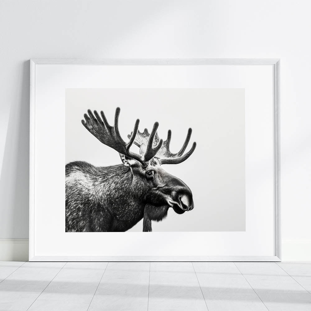 Introduce a striking piece of art to your home with this Black & White Moose Portrait. This captivating artwork features a detailed close-up of a moose, rendered in a refined black and white palette. The simplicity of the monochrome design brings out the intricate textures and powerful presence of the moose, making it a bold statement piece for any decor style.
