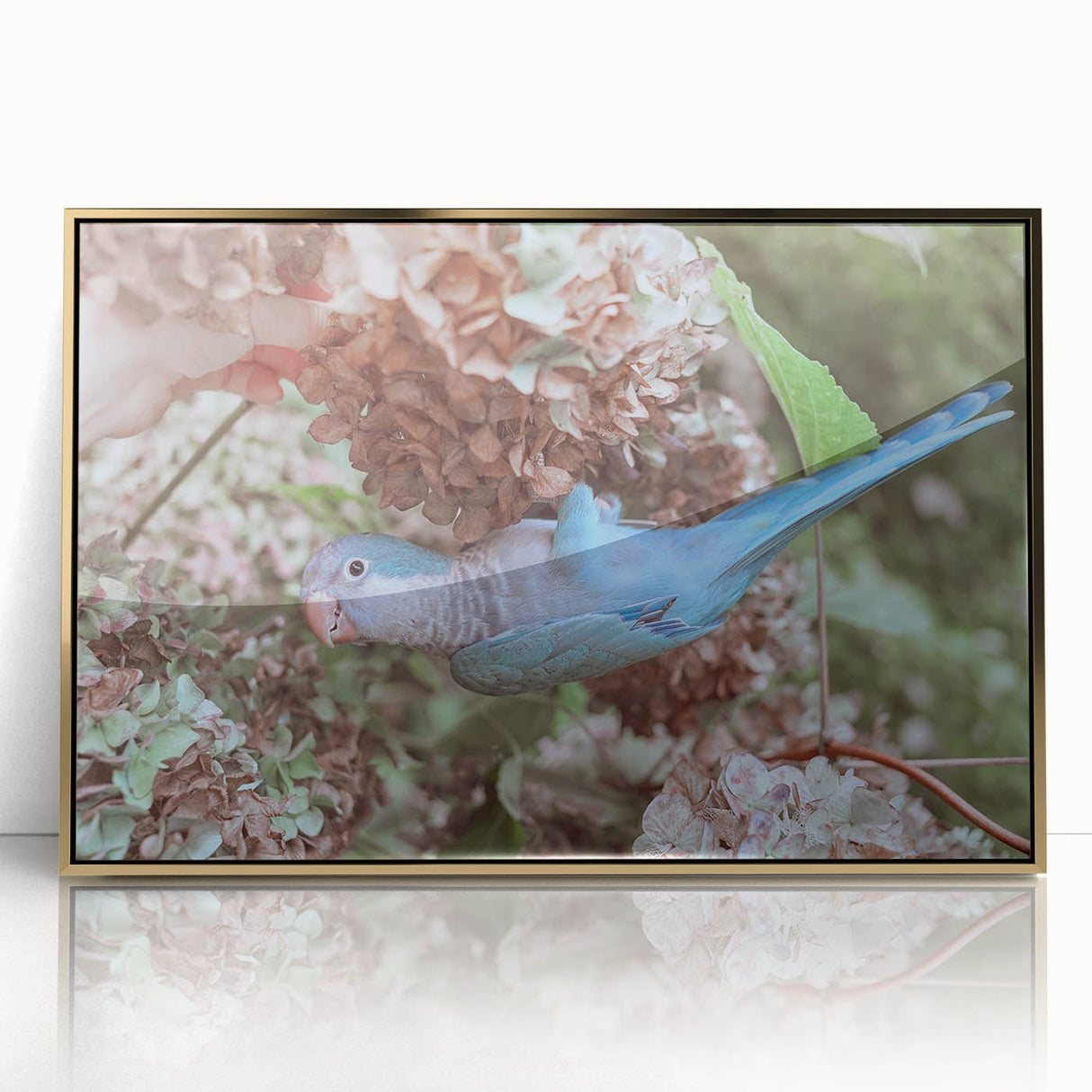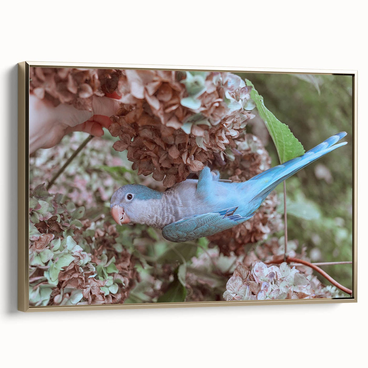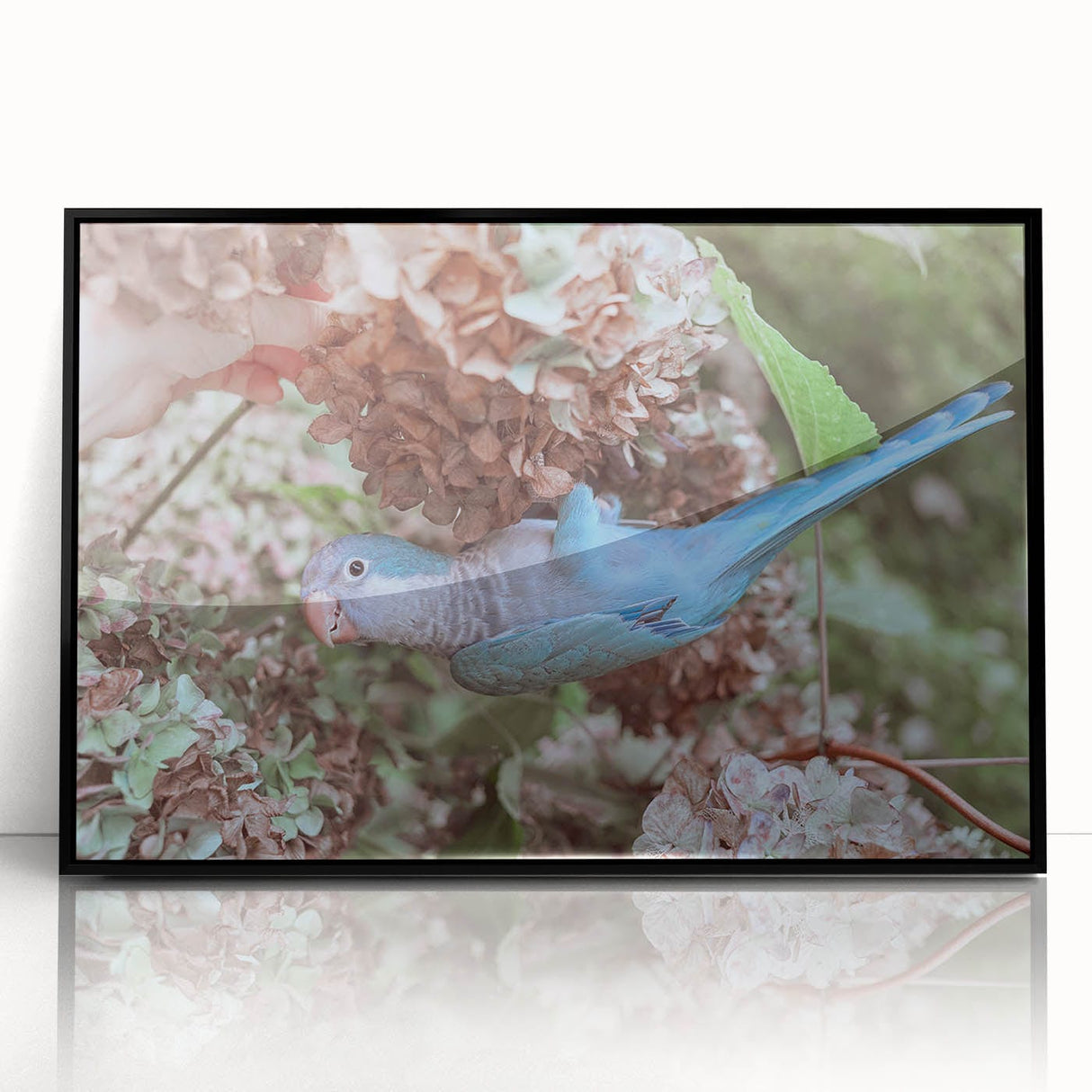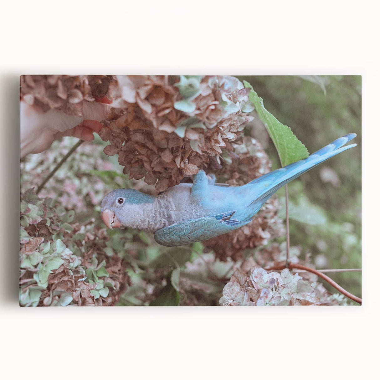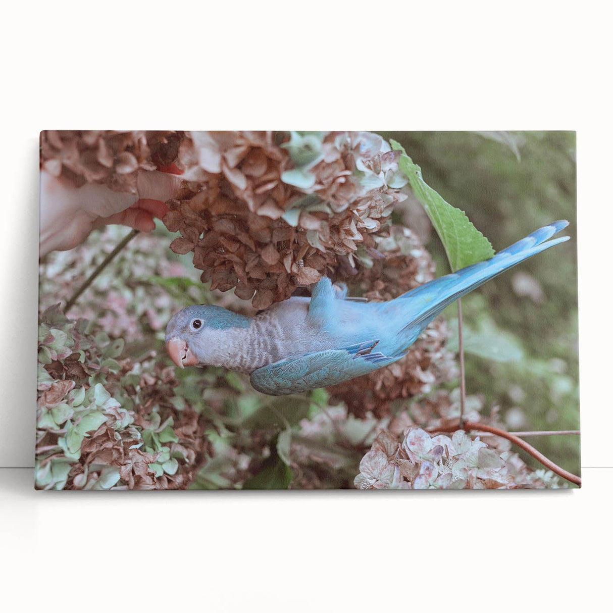 Capture the playful elegance of nature with this charming fine art photography canvas print. Featuring a delicate blue parrot nestled among hydrangea flowers, this image beautifully contrasts the soft pastel tones of the bird with the warm earthy hues of dried petals and lush green foliage.