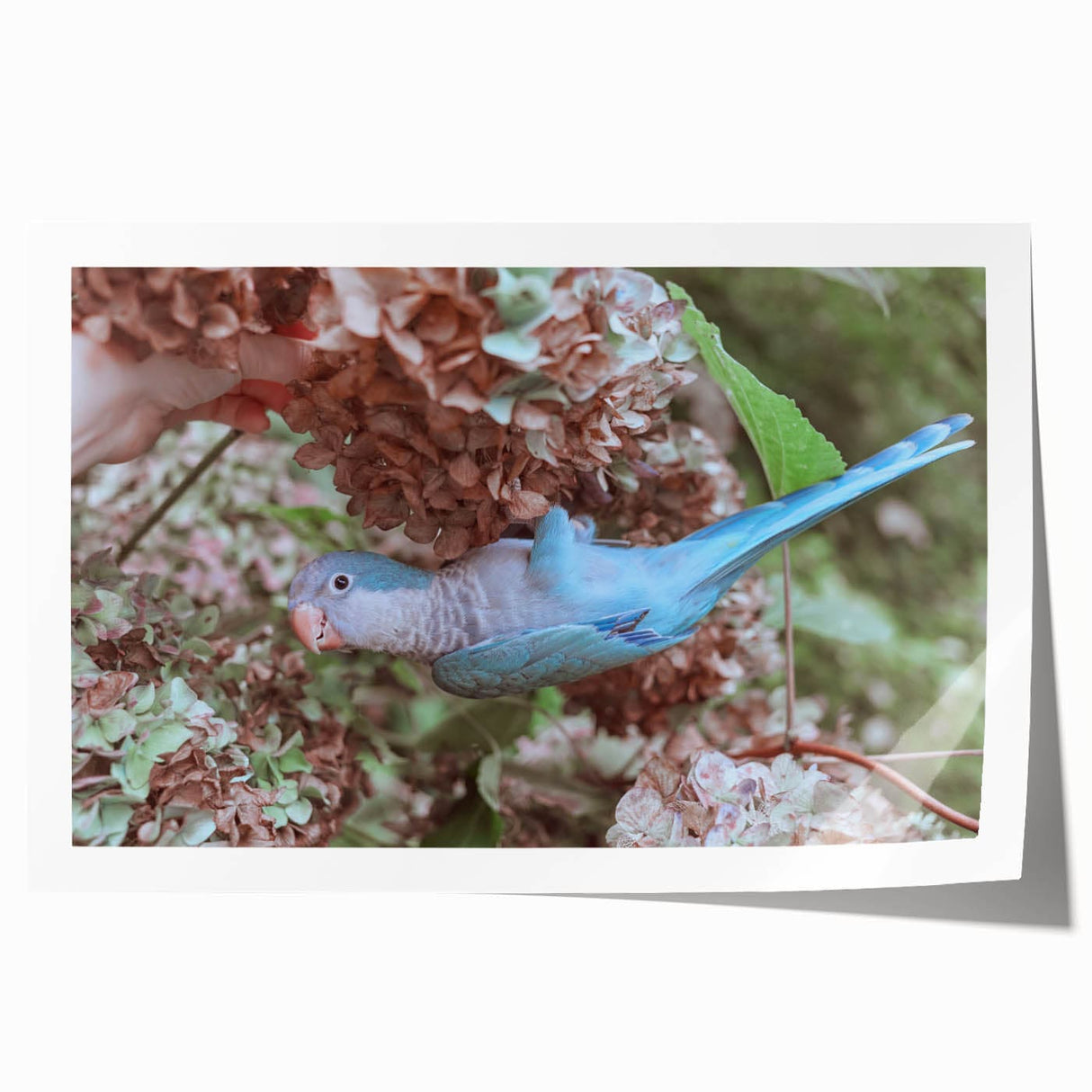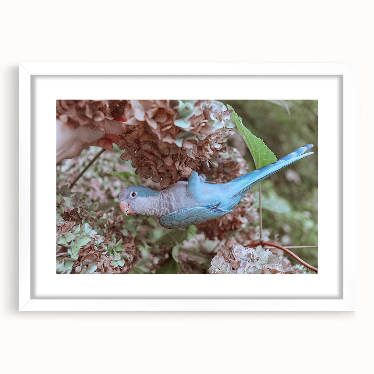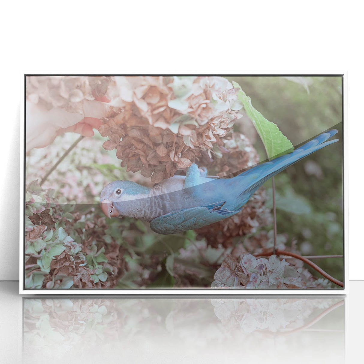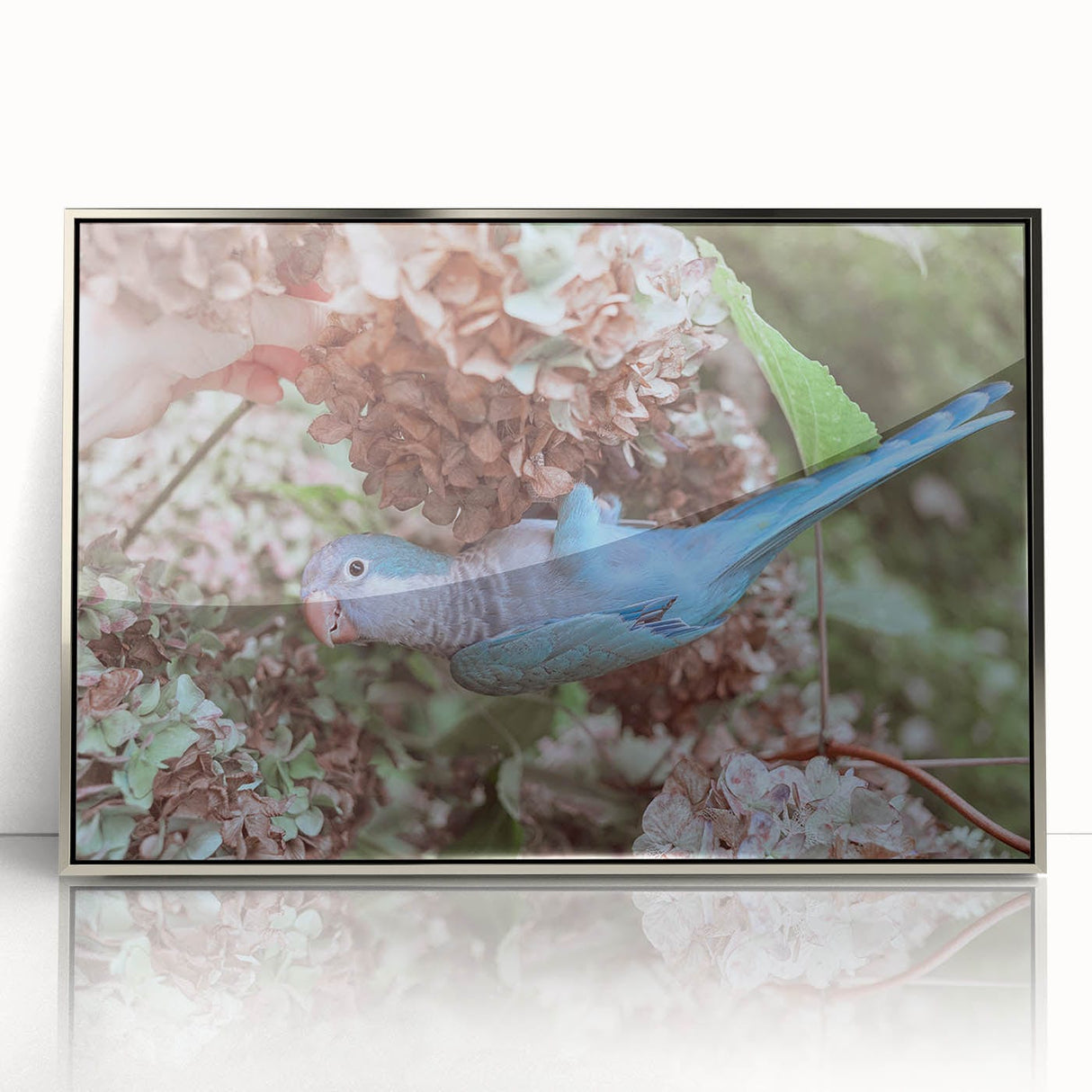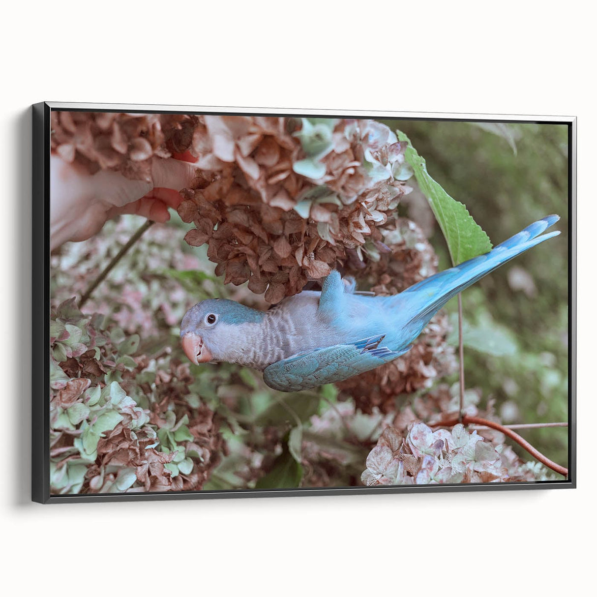 Capture the playful elegance of nature with this charming fine art photography canvas print. Featuring a delicate blue parrot nestled among hydrangea flowers, this image beautifully contrasts the soft pastel tones of the bird with the warm earthy hues of dried petals and lush green foliage.
