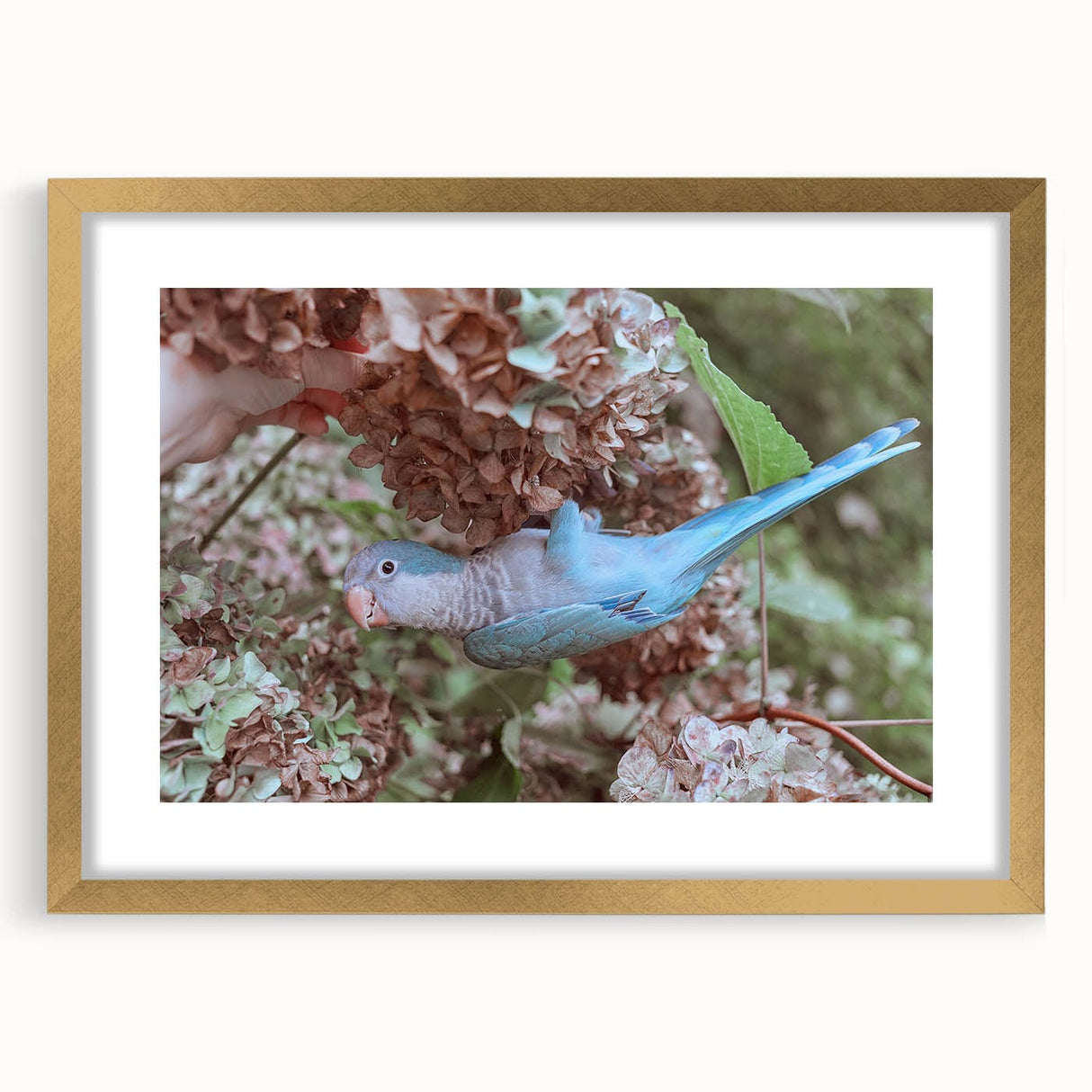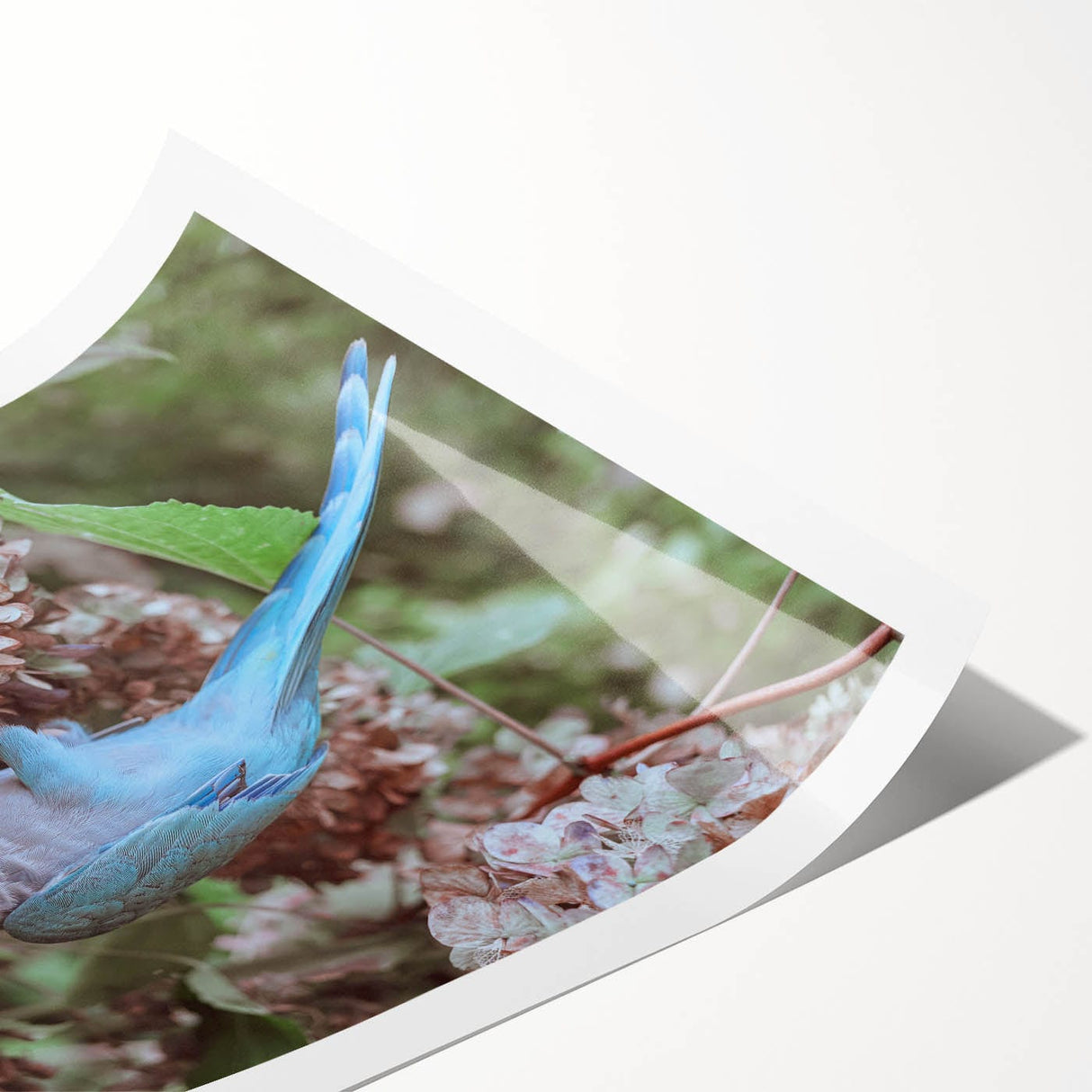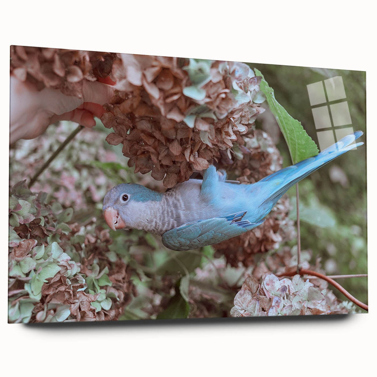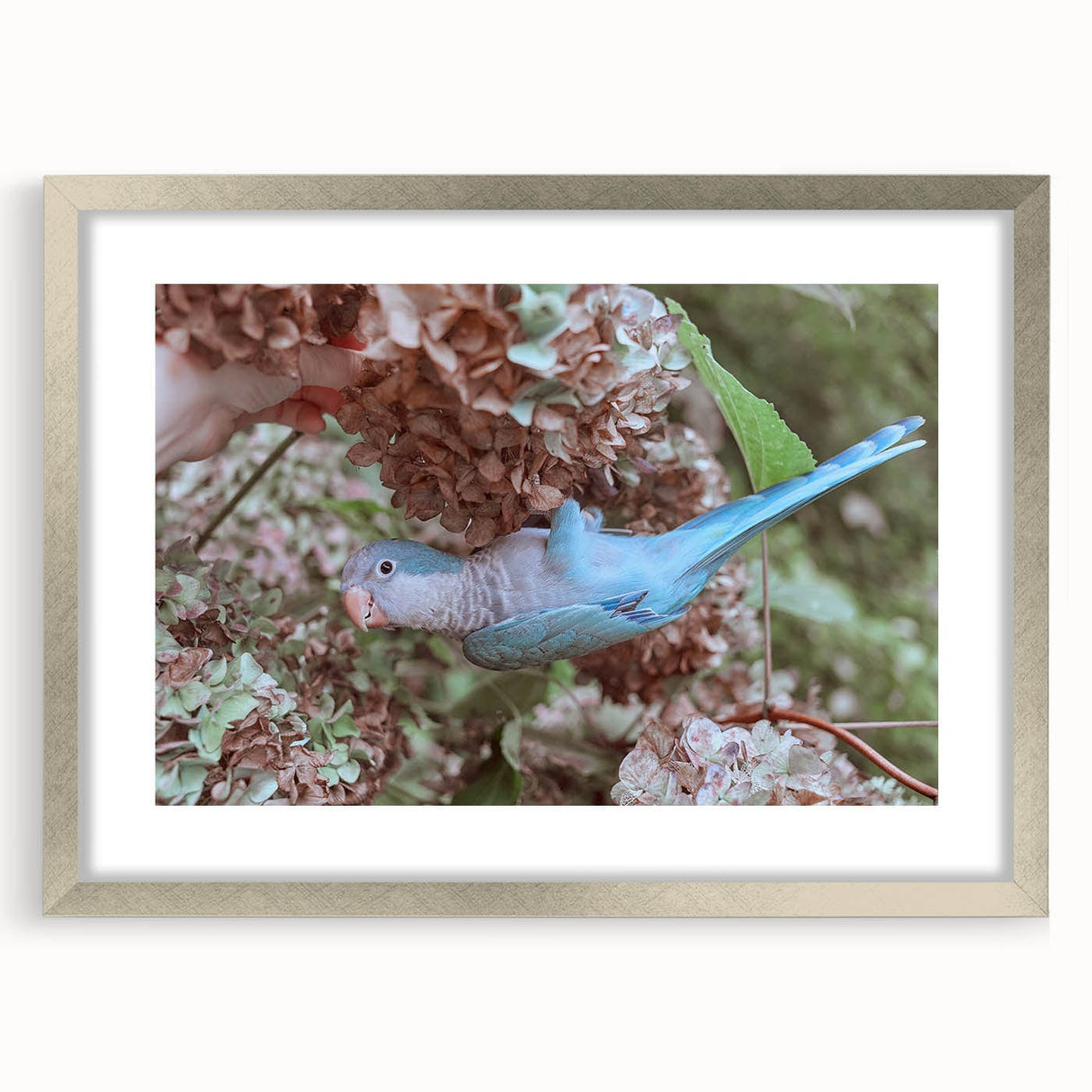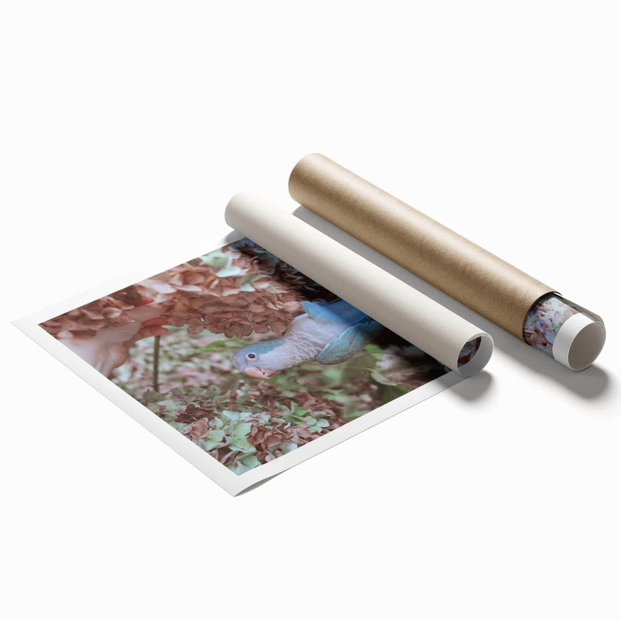 Capture the playful elegance of nature with this charming fine art photography canvas print. Featuring a delicate blue parrot nestled among hydrangea flowers, this image beautifully contrasts the soft pastel tones of the bird with the warm earthy hues of dried petals and lush green foliage.