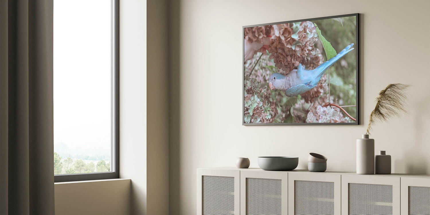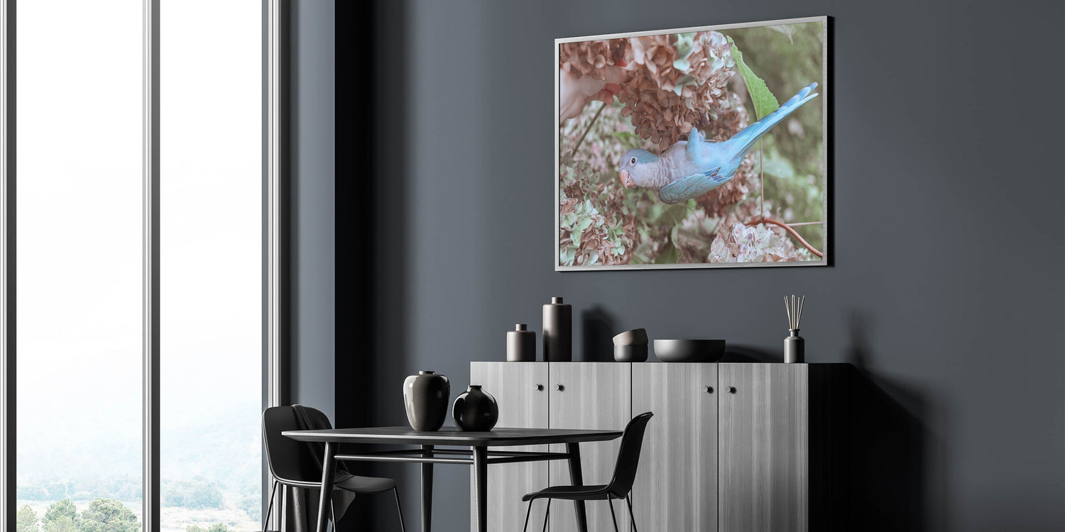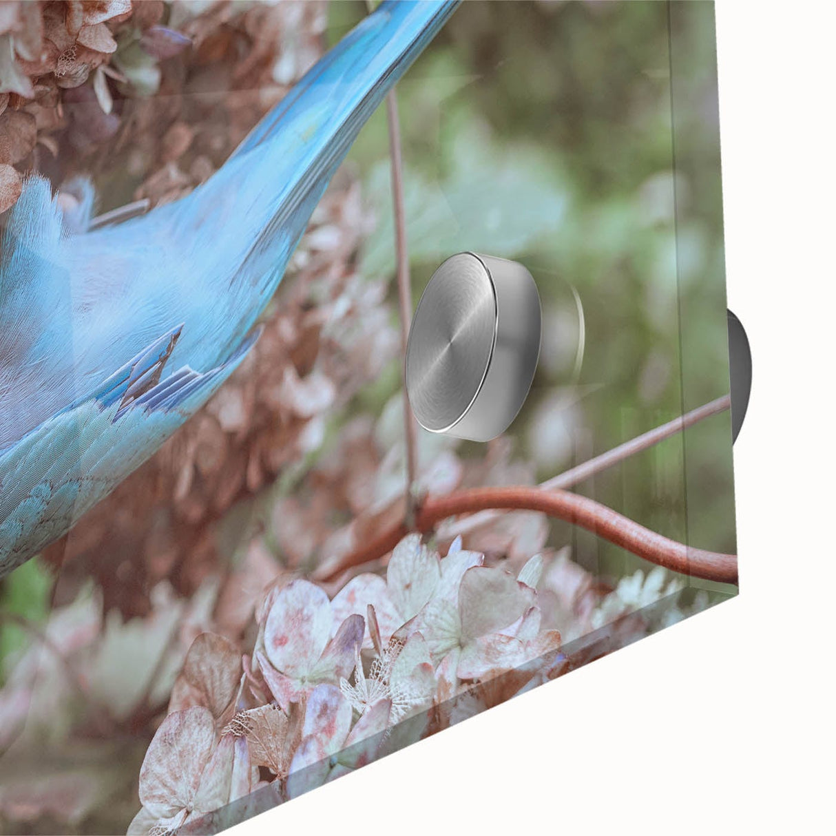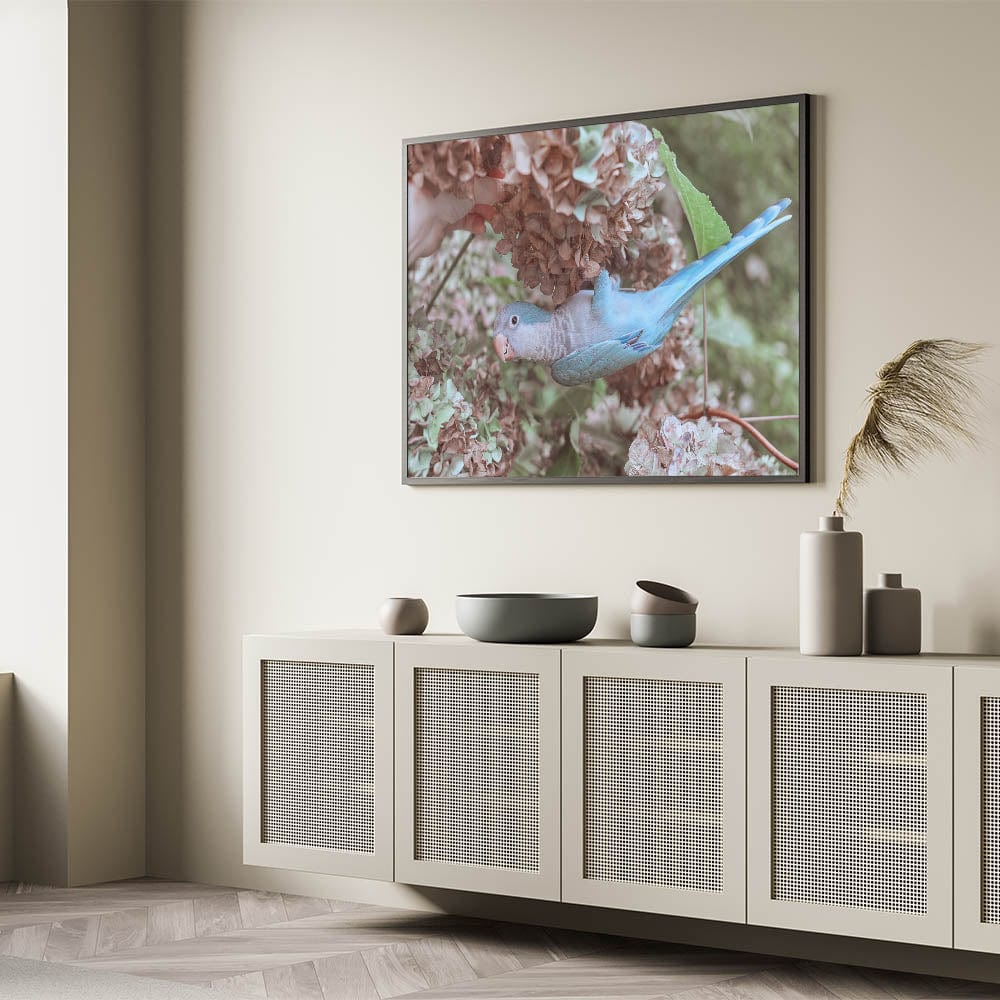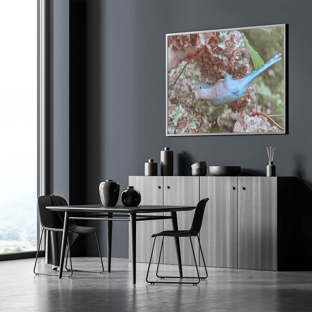 Capture the playful elegance of nature with this charming fine art photography canvas print. Featuring a delicate blue parrot nestled among hydrangea flowers, this image beautifully contrasts the soft pastel tones of the bird with the warm earthy hues of dried petals and lush green foliage.