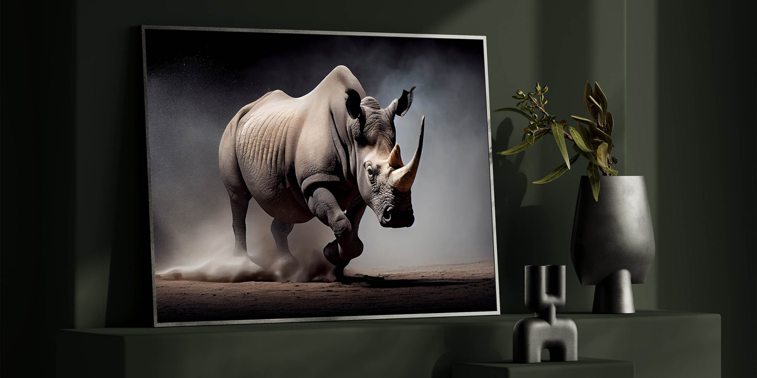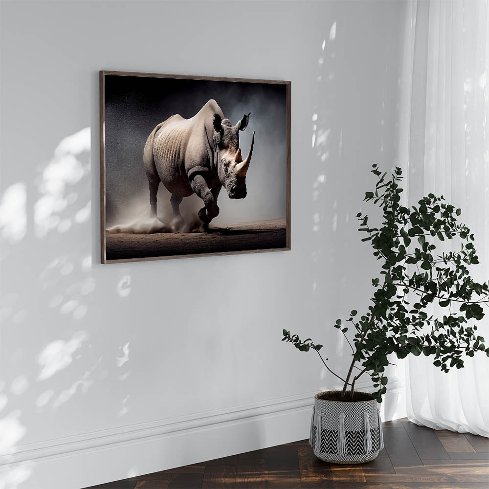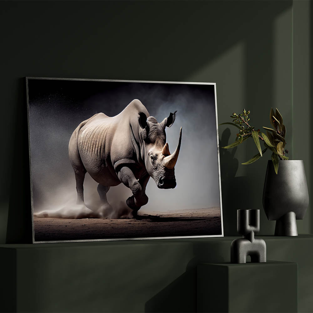 Feel the raw power and unstoppable force of the wild with this charging rhinoceros wall art. Capturing the intense energy of a rhino in motion, this artwork is perfect for those who appreciate bold and dynamic wildlife art. The dramatic lighting and dust kicked up by the charge make this piece a striking addition to any space, bringing a sense of movement and strength to your decor.