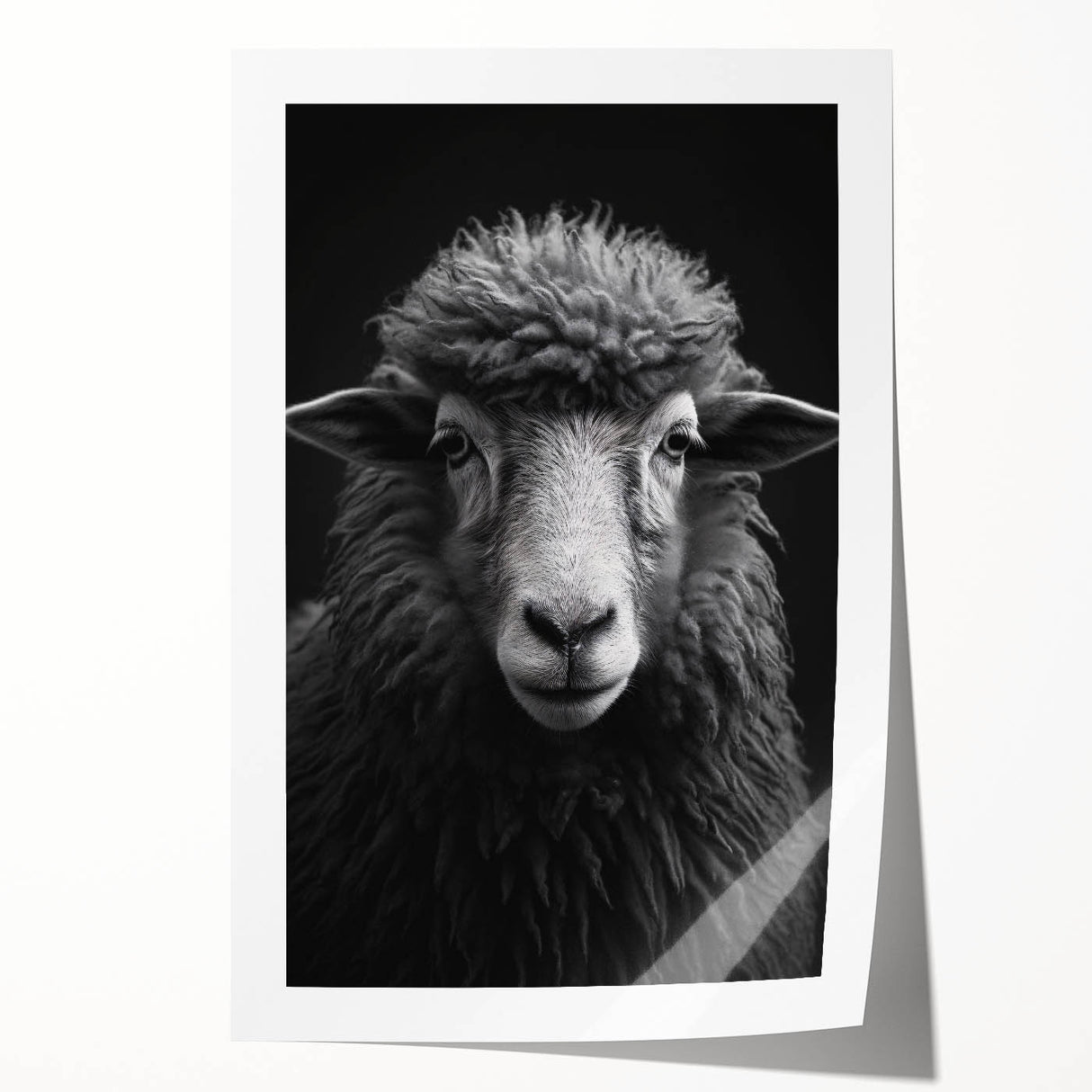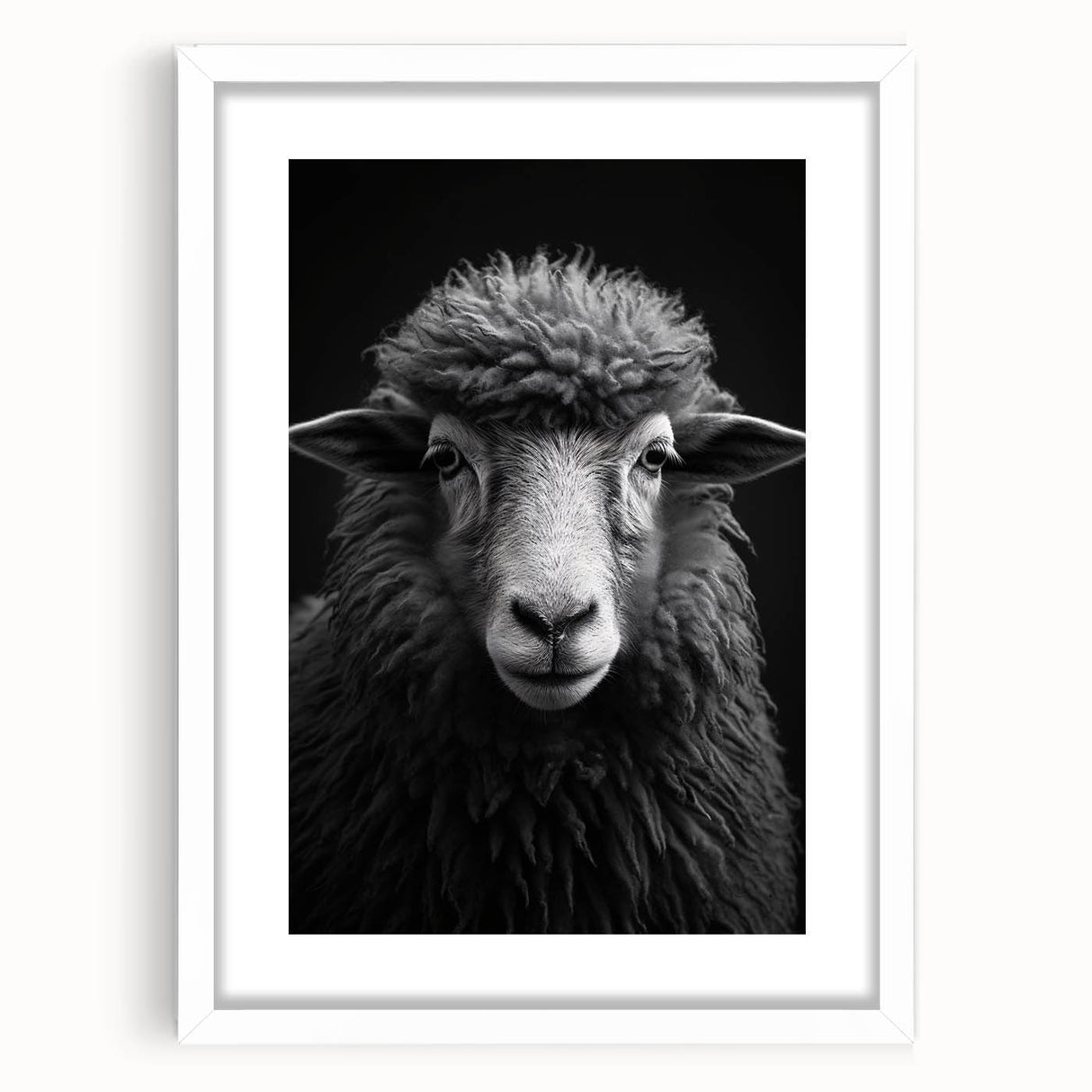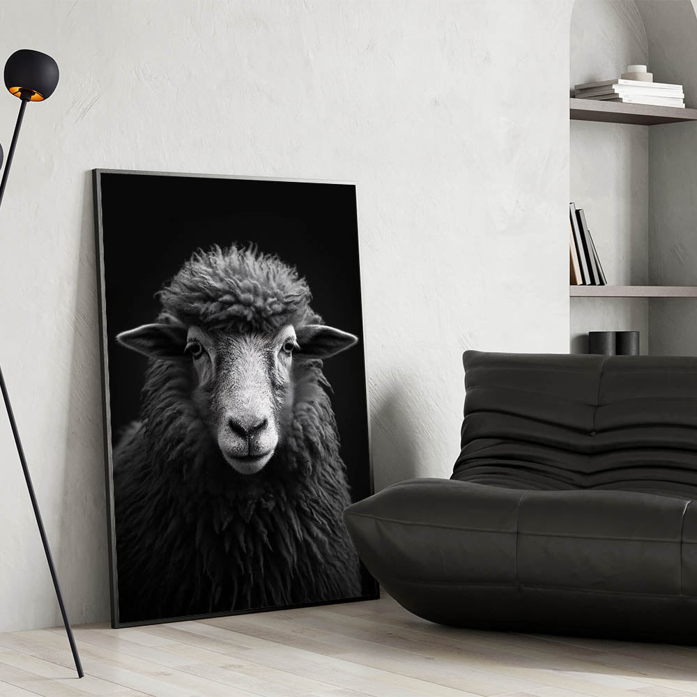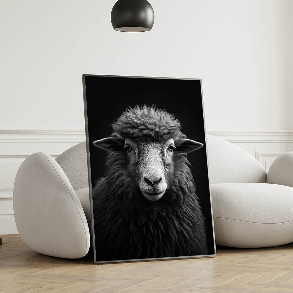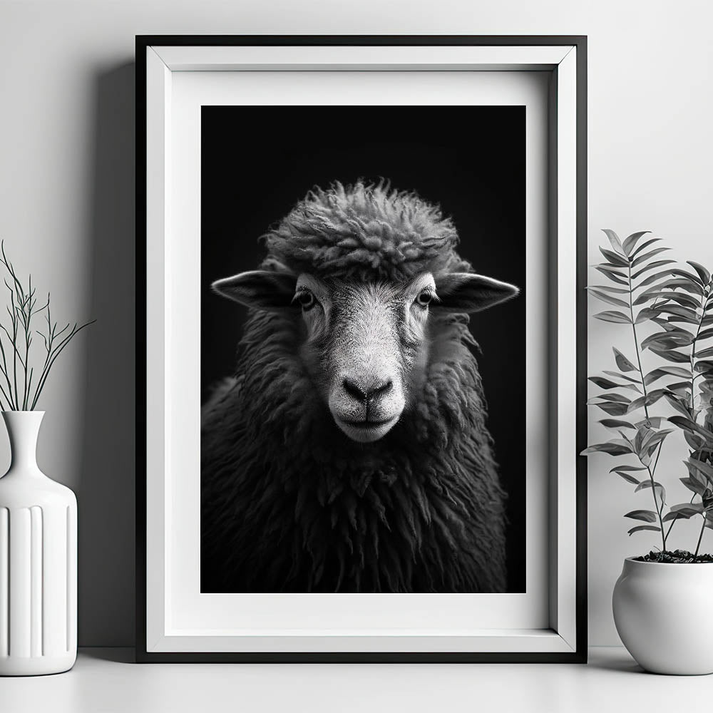 Make a bold statement with this Dramatic Sheep Wall Art. This striking black-and-white portrait captures the intense gaze of a sheep, set against a deep, dark background. The contrast between the sheep’s textured wool and the dark backdrop creates a powerful and captivating image, perfect for adding a dramatic touch to any modern or rustic decor.