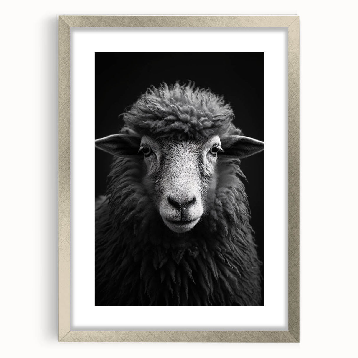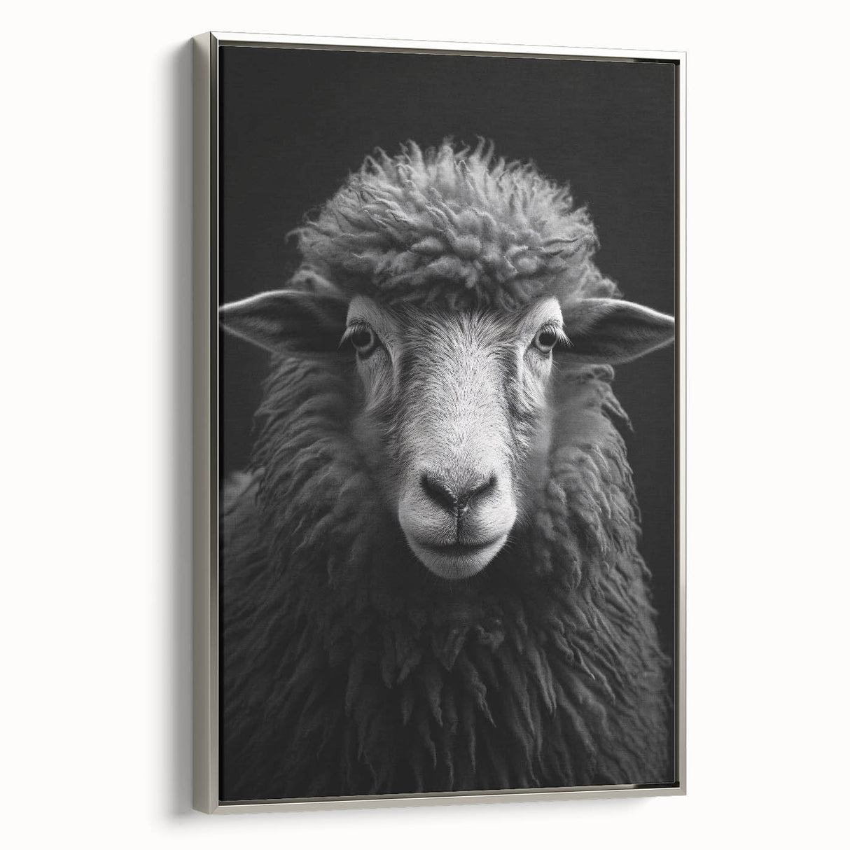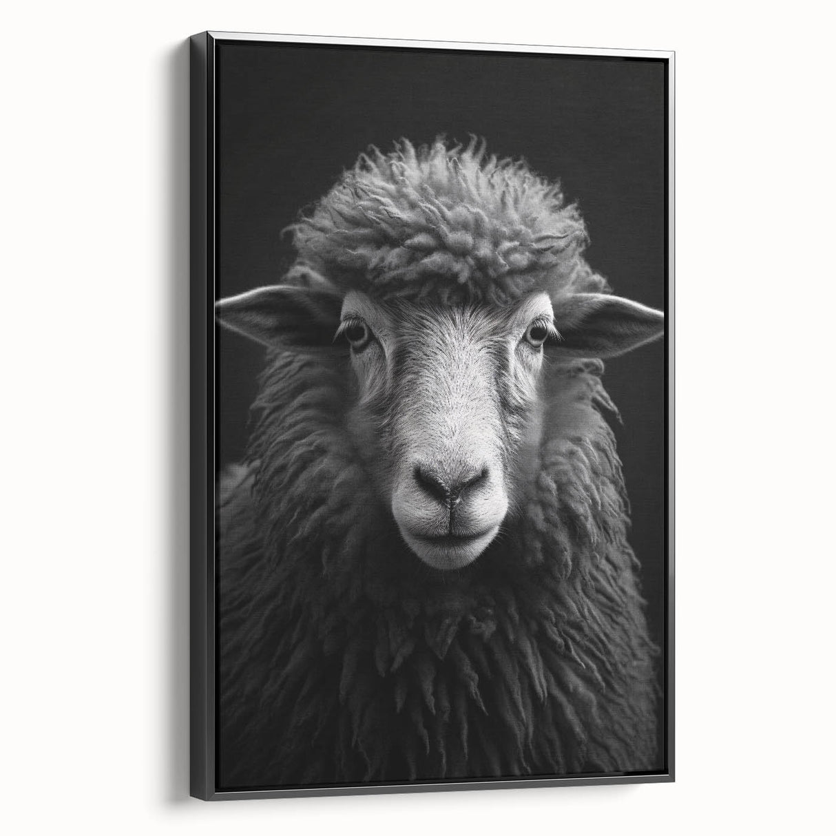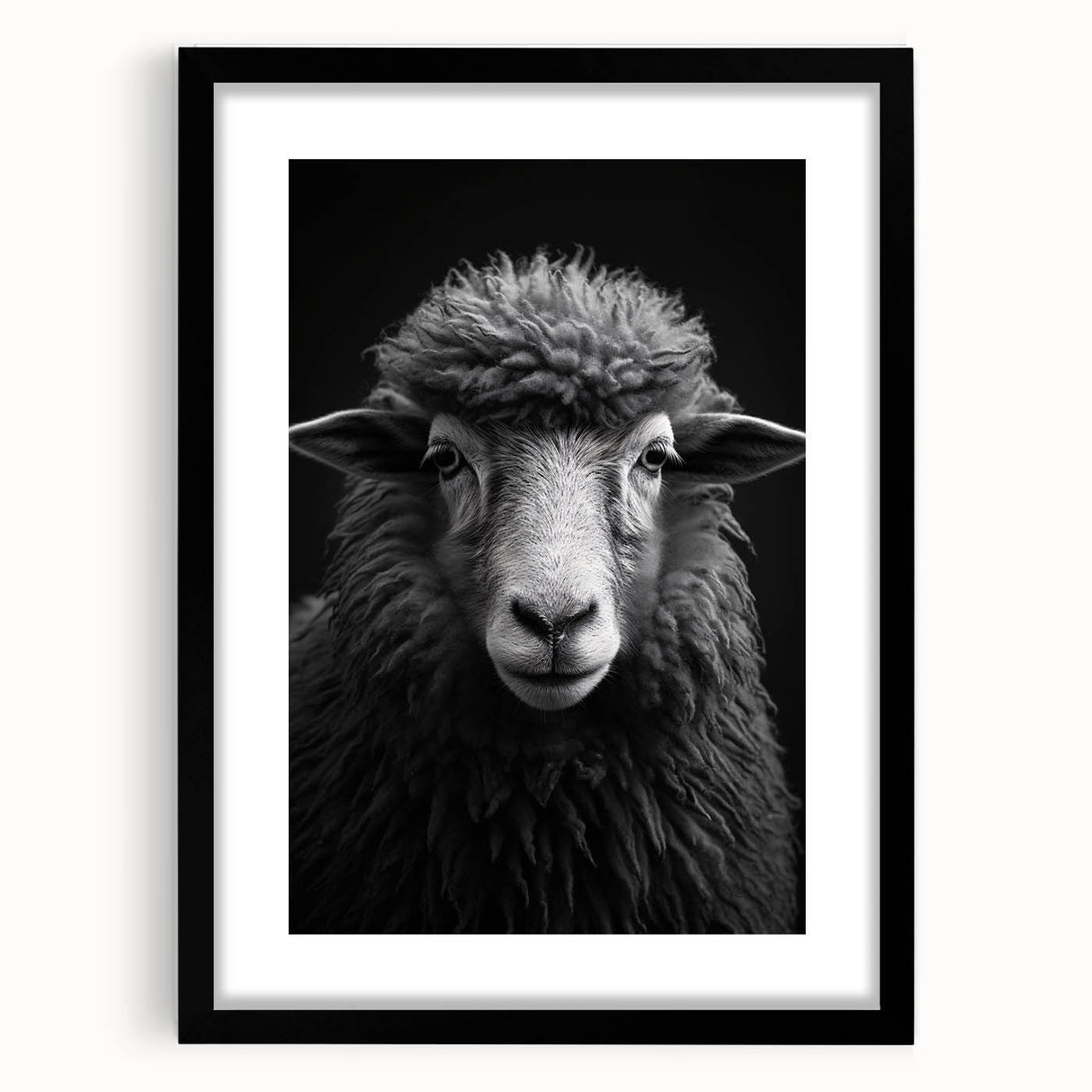 Make a bold statement with this Dramatic Sheep Wall Art. This striking black-and-white portrait captures the intense gaze of a sheep, set against a deep, dark background. The contrast between the sheep’s textured wool and the dark backdrop creates a powerful and captivating image, perfect for adding a dramatic touch to any modern or rustic decor.