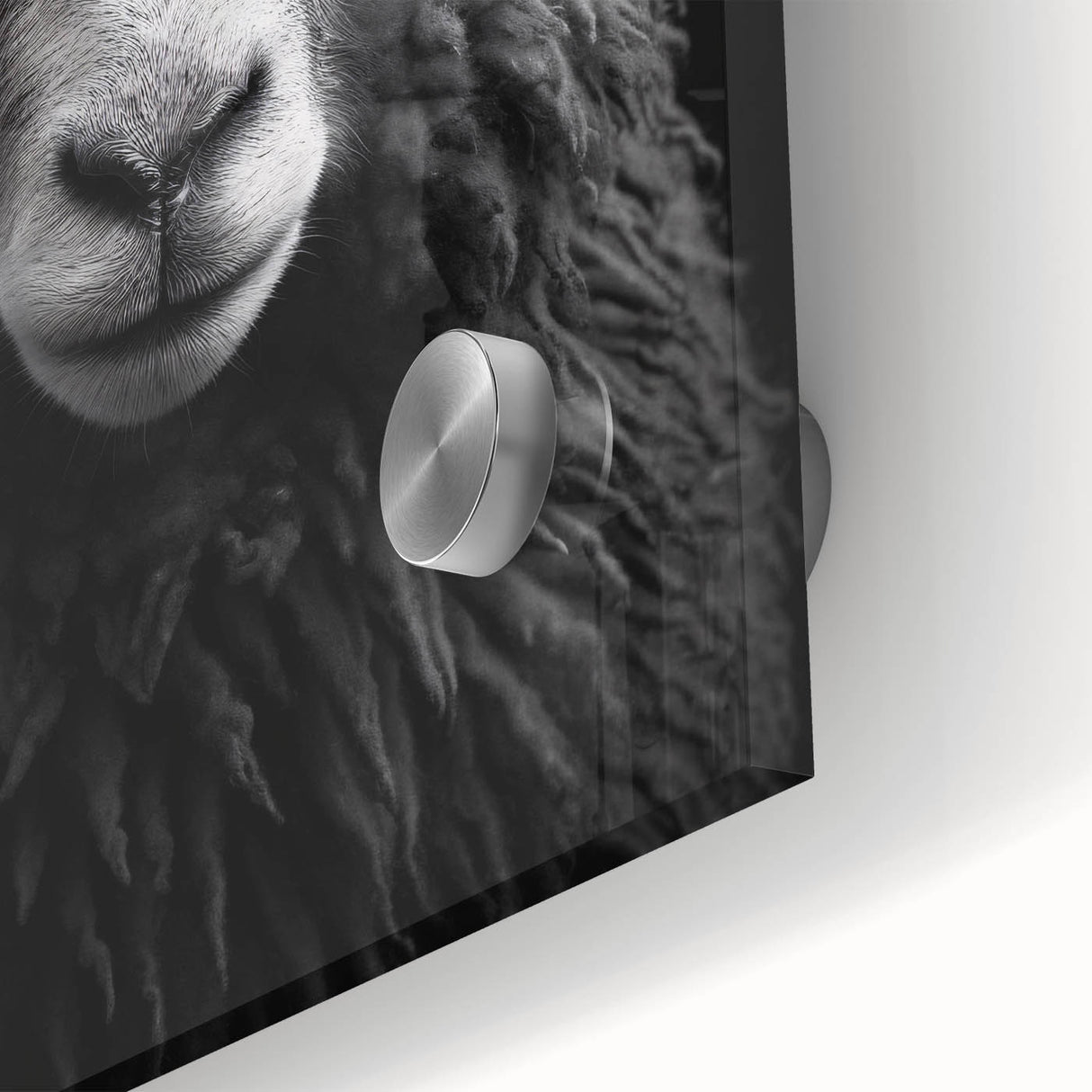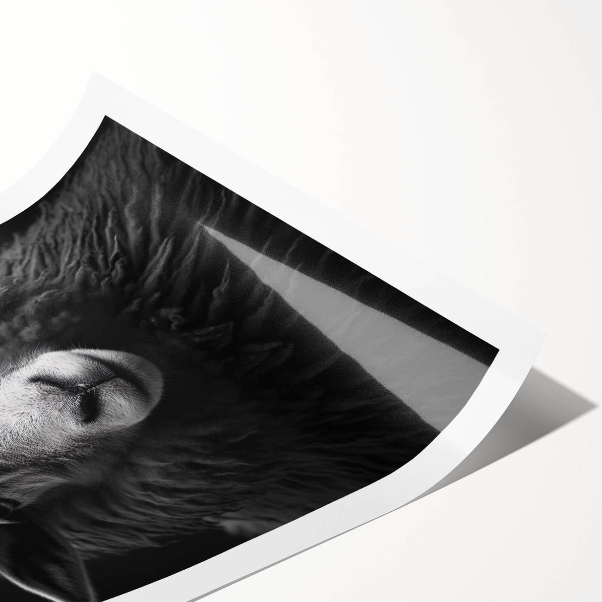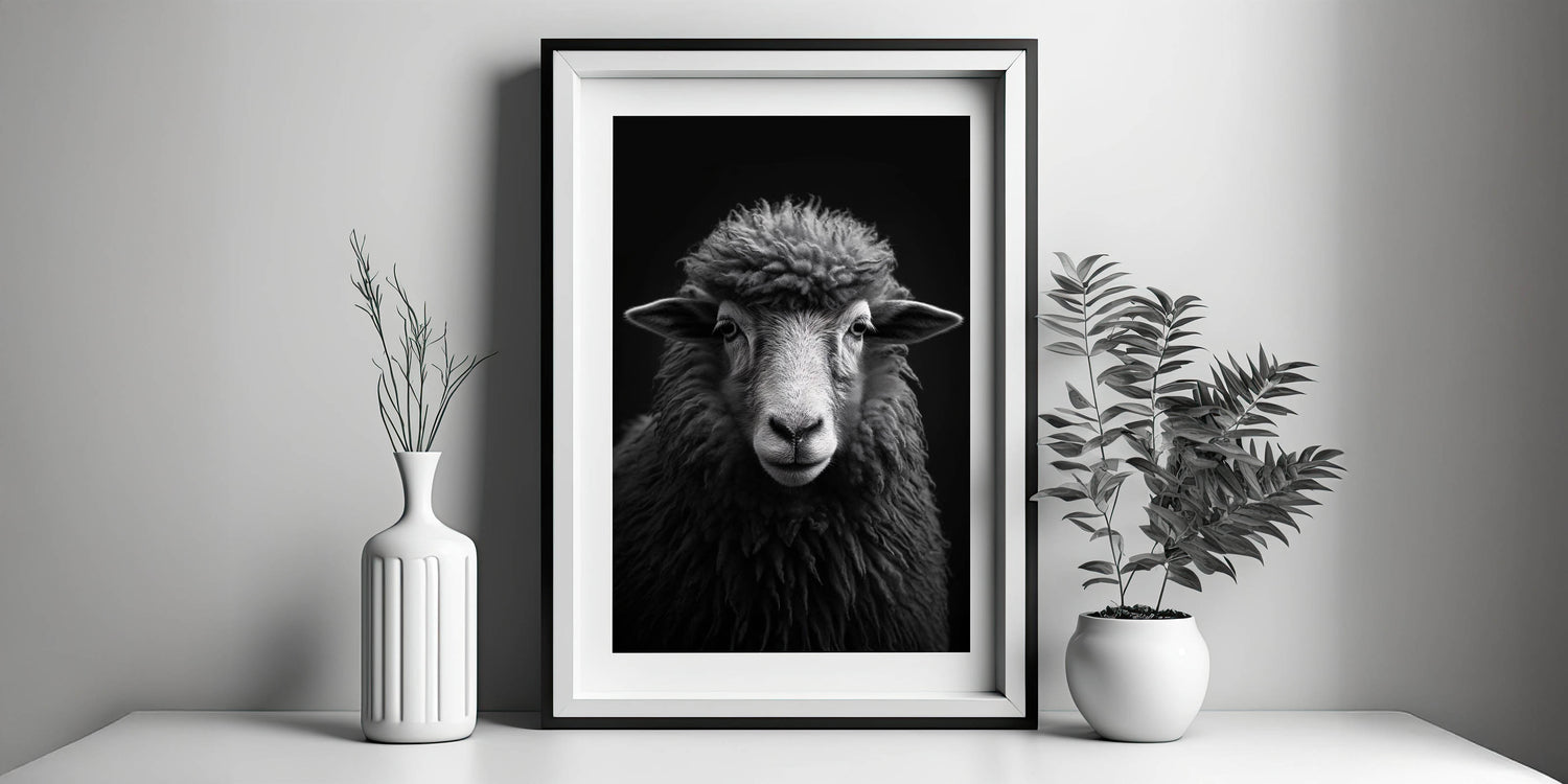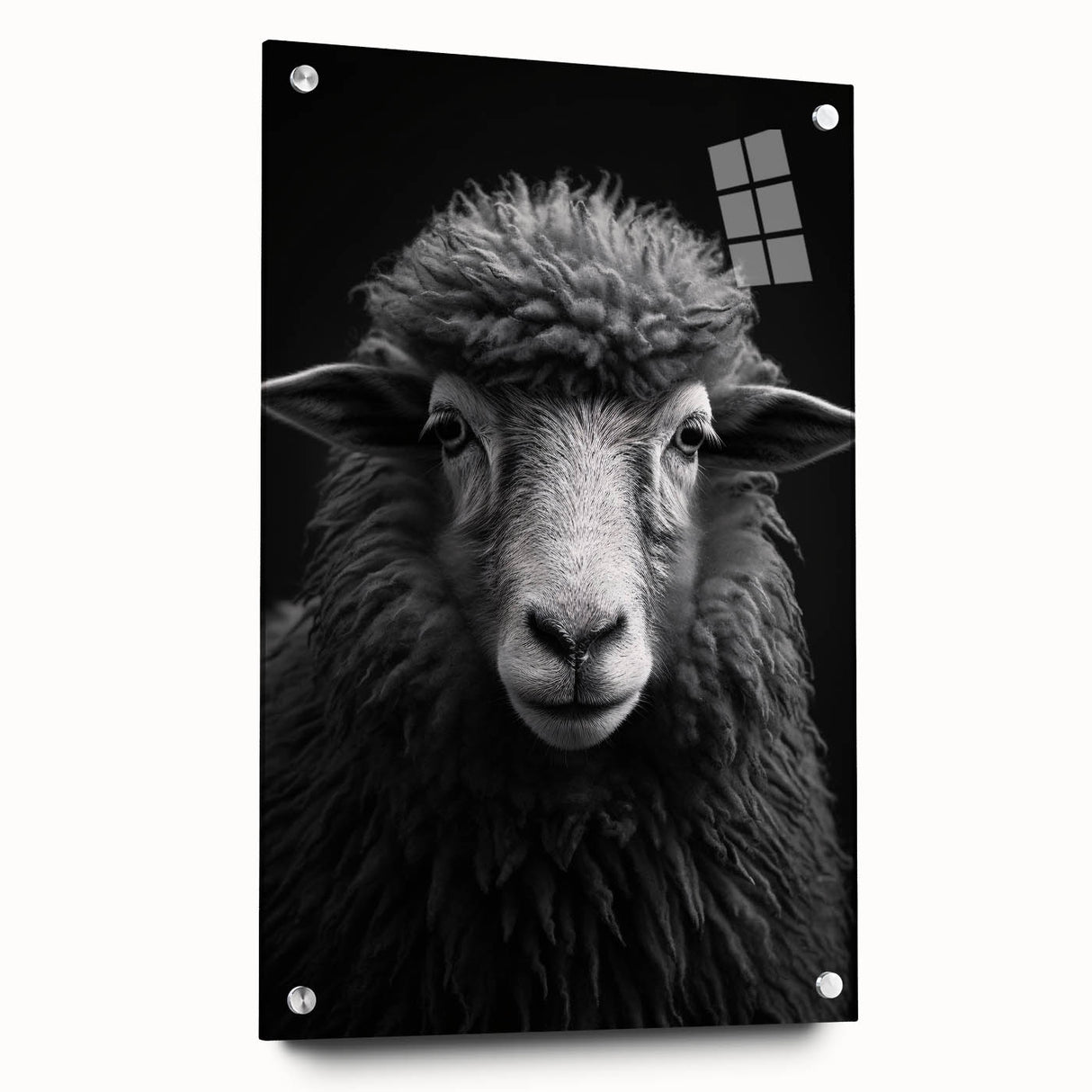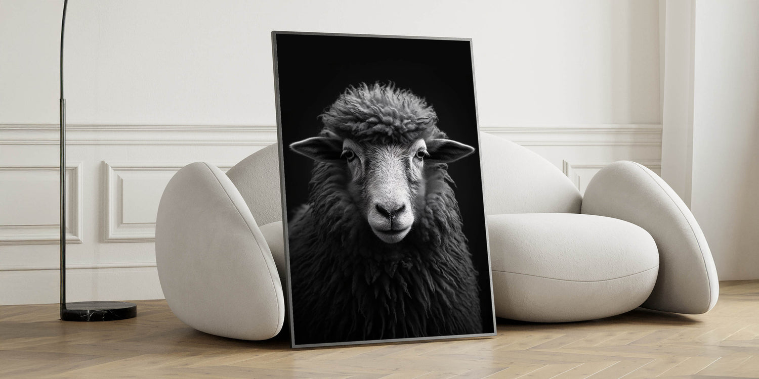 Make a bold statement with this Dramatic Sheep Wall Art. This striking black-and-white portrait captures the intense gaze of a sheep, set against a deep, dark background. The contrast between the sheep’s textured wool and the dark backdrop creates a powerful and captivating image, perfect for adding a dramatic touch to any modern or rustic decor.