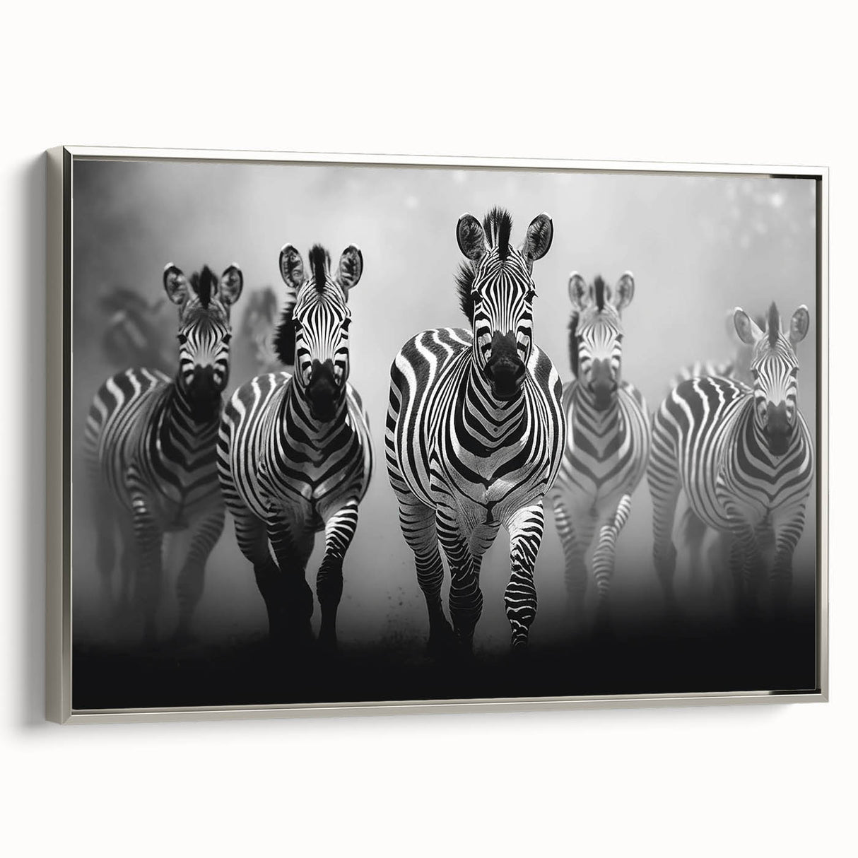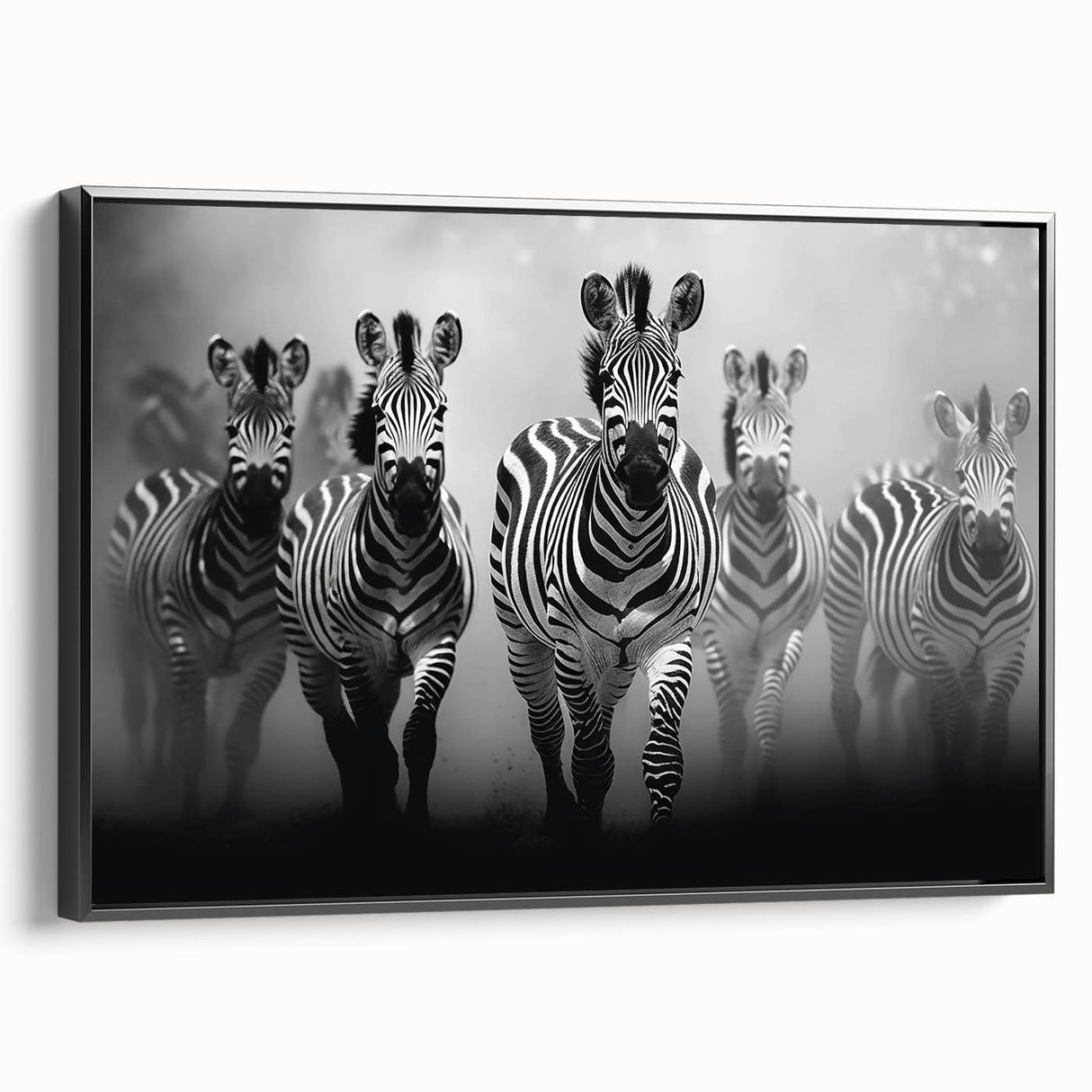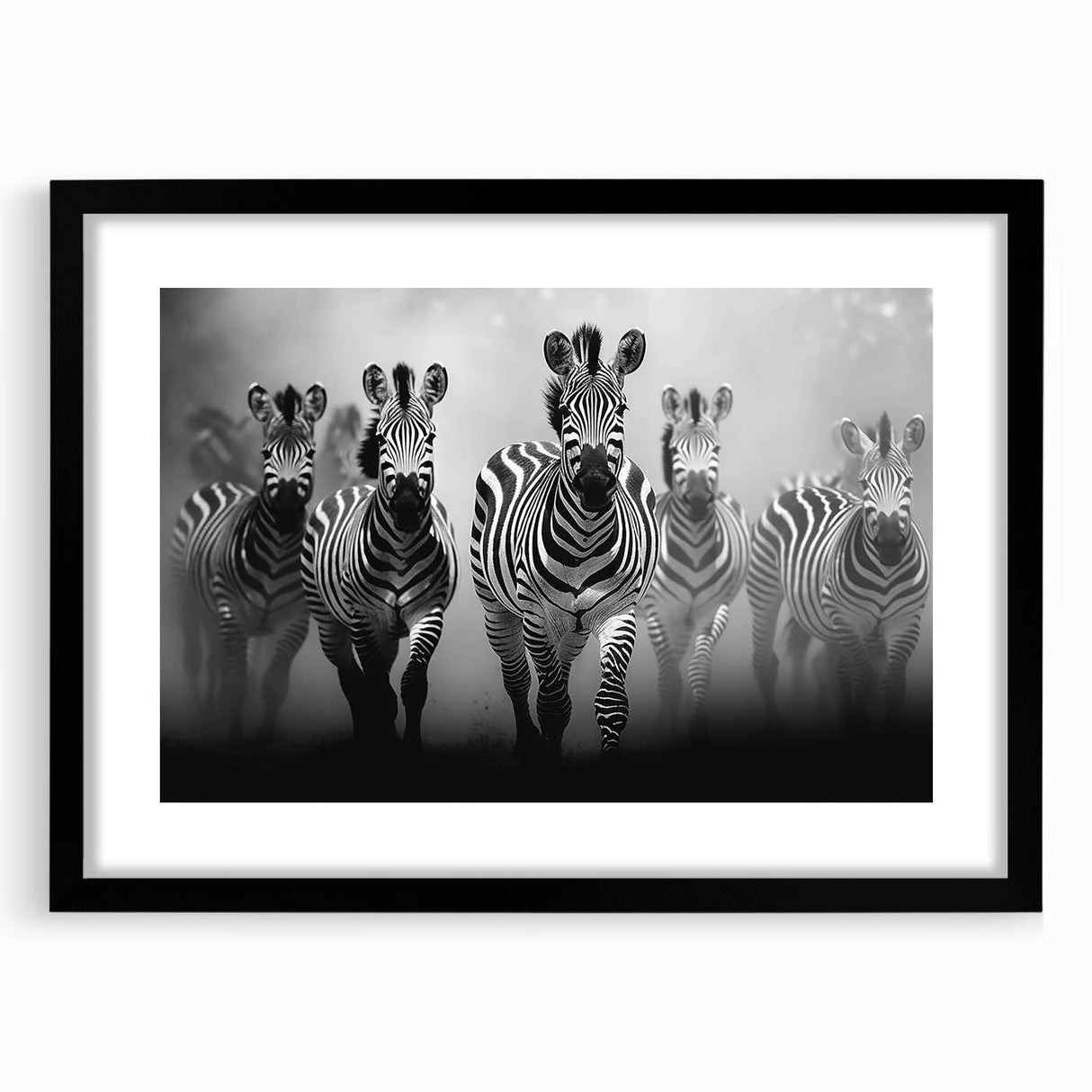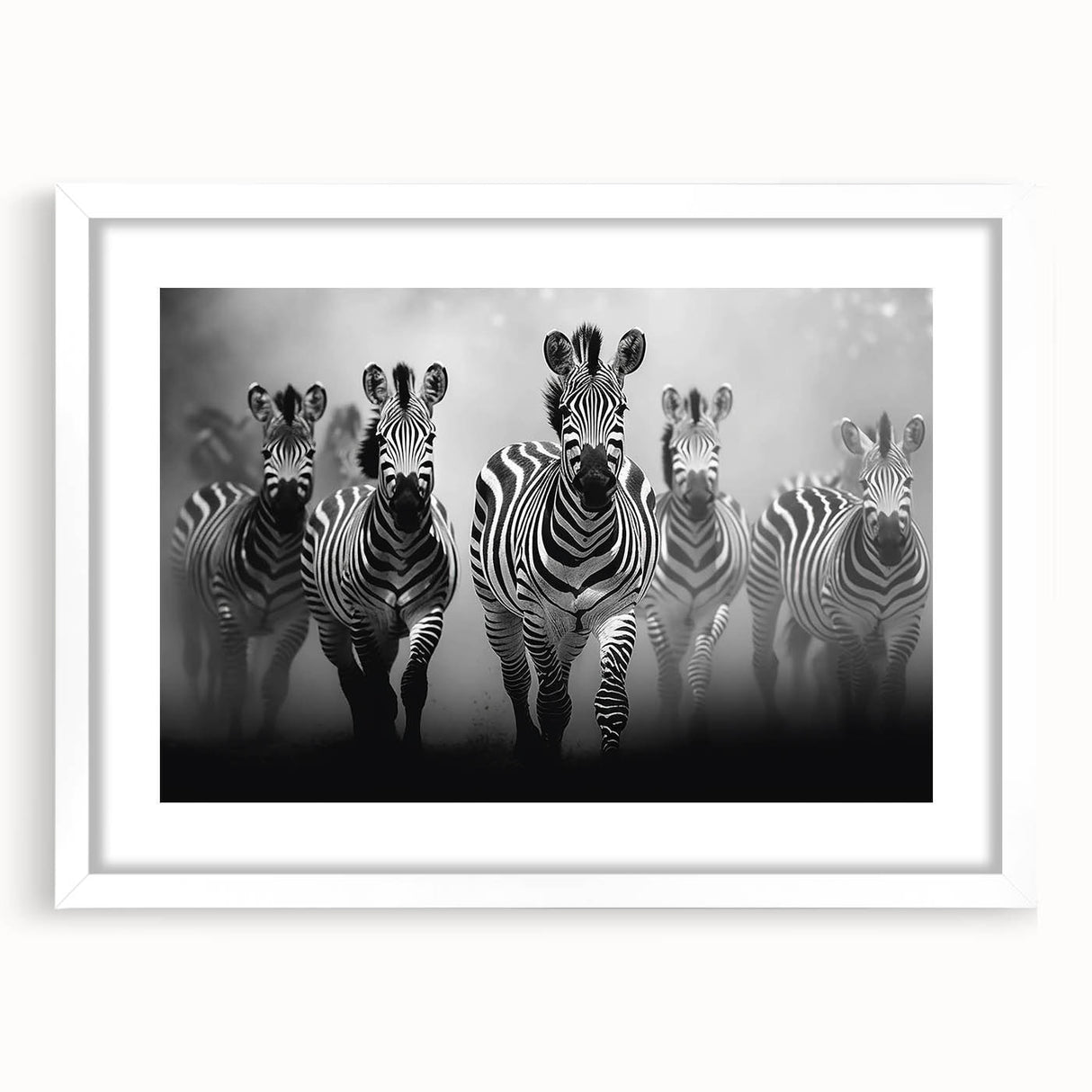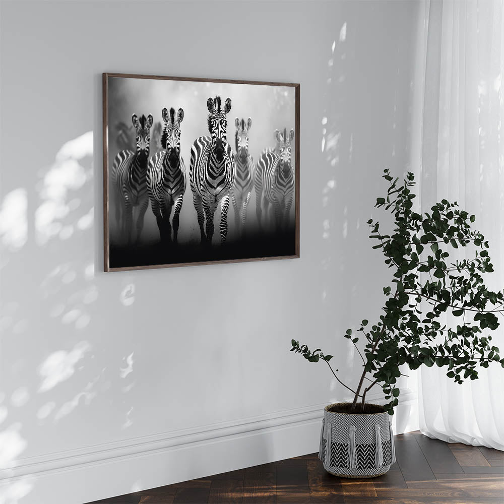 - Striking Imagery: A dynamic black and white depiction of a zebra herd in motion, perfect for modern and contemporary spaces.