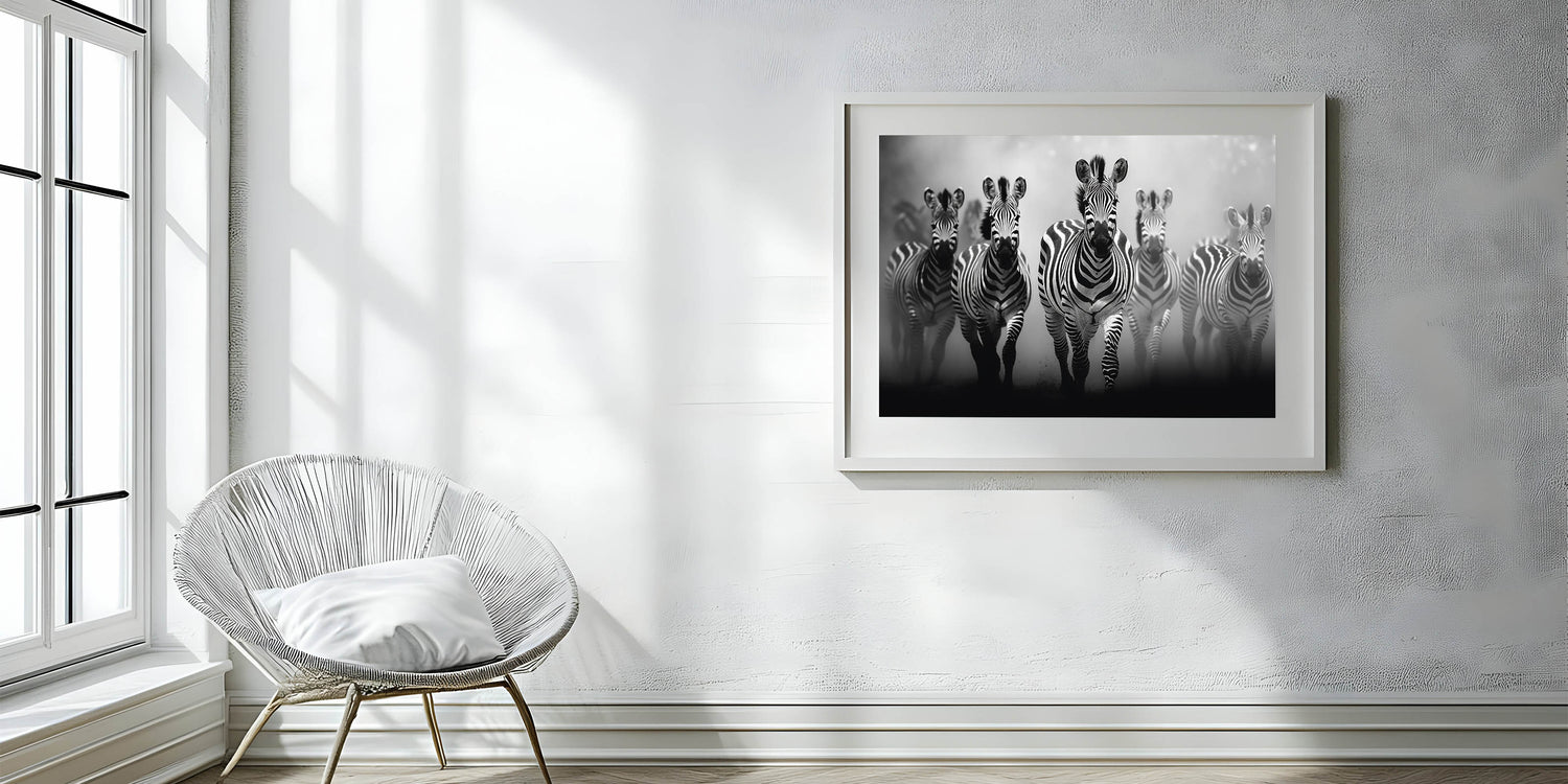 Capture the raw energy of the African savanna with this dynamic Zebra herd wall art. The powerful imagery of a zebra herd in motion, rendered in a striking black and white palette, brings both intensity and elegance to your space. This artwork is ideal for adding a sense of movement and drama to modern and contemporary interiors. Available in a variety of formats including Stretched Canvas, Framed Canvas, Acrylic Glass, Framed Acrylic Glass, Framed Print, Rolled Canvas, and Rolled Print, this piece offers both versatility and impact.