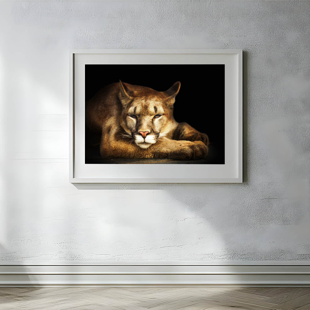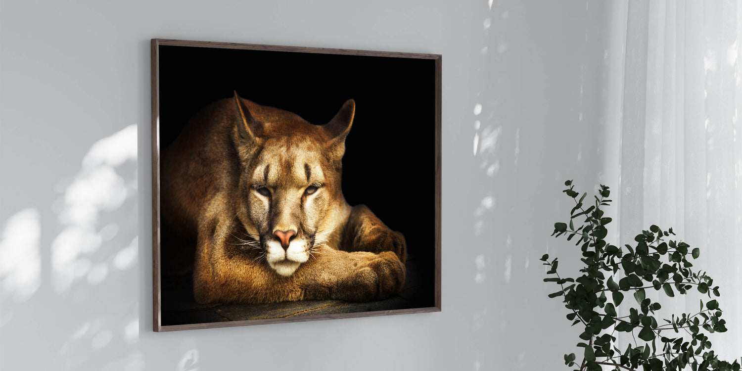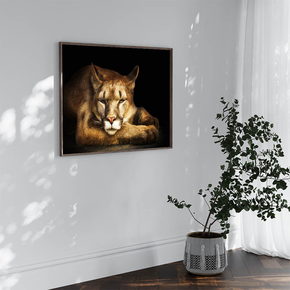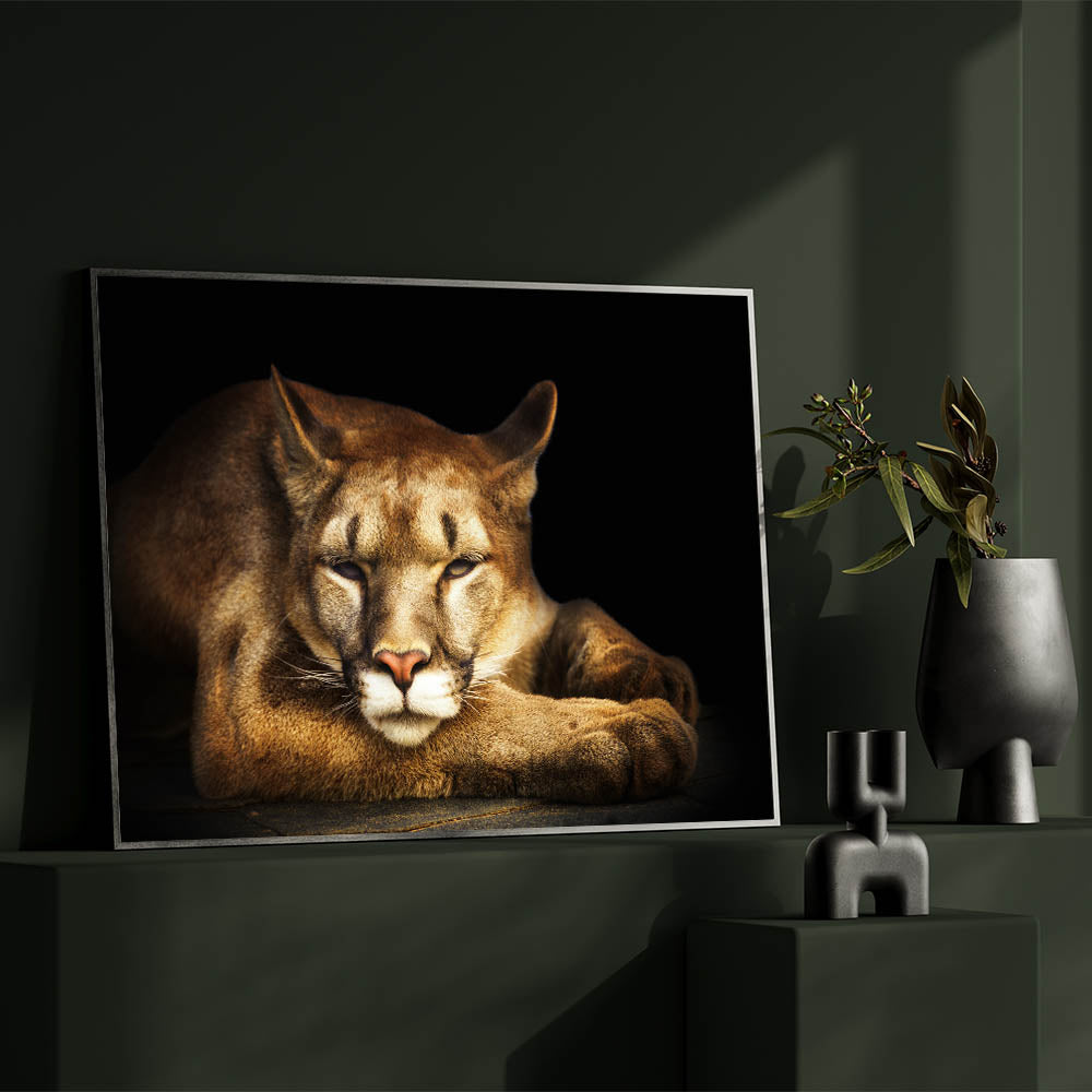 Bring the majestic beauty of the wild into your home with this Elegant Cougar Wall Art. This captivating design showcases a serene yet powerful cougar resting against a dramatic black background, creating a striking contrast that highlights its natural grace. Perfect for wildlife enthusiasts and art collectors, this piece adds sophistication and charm to any space.