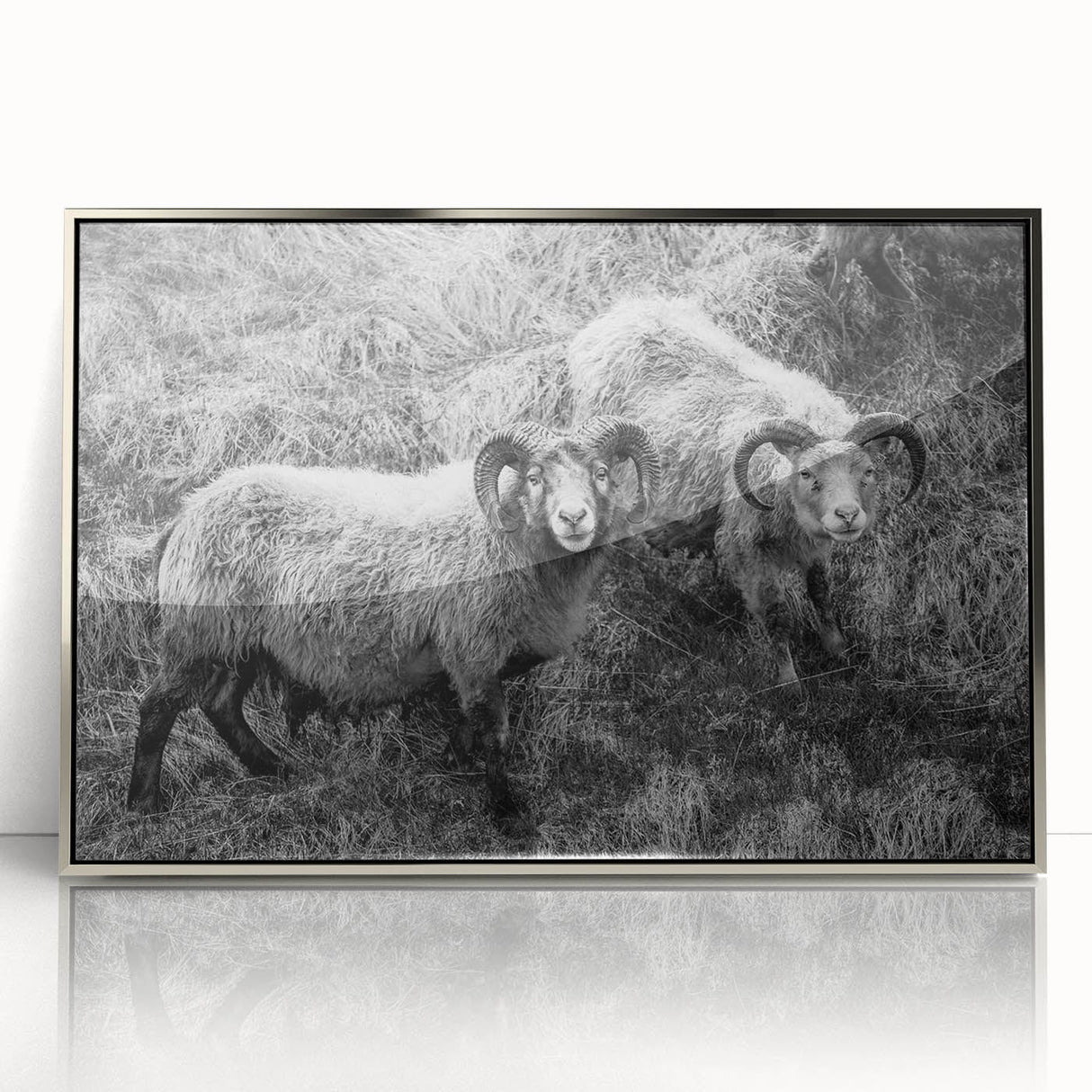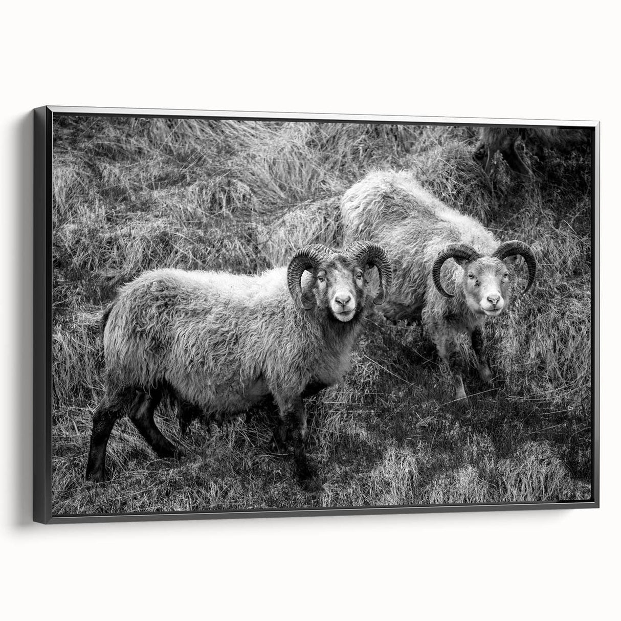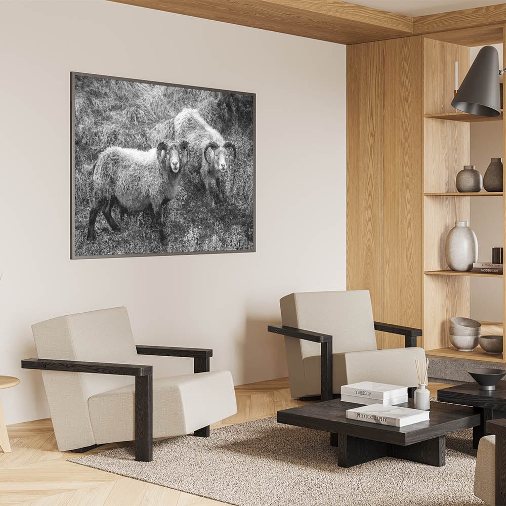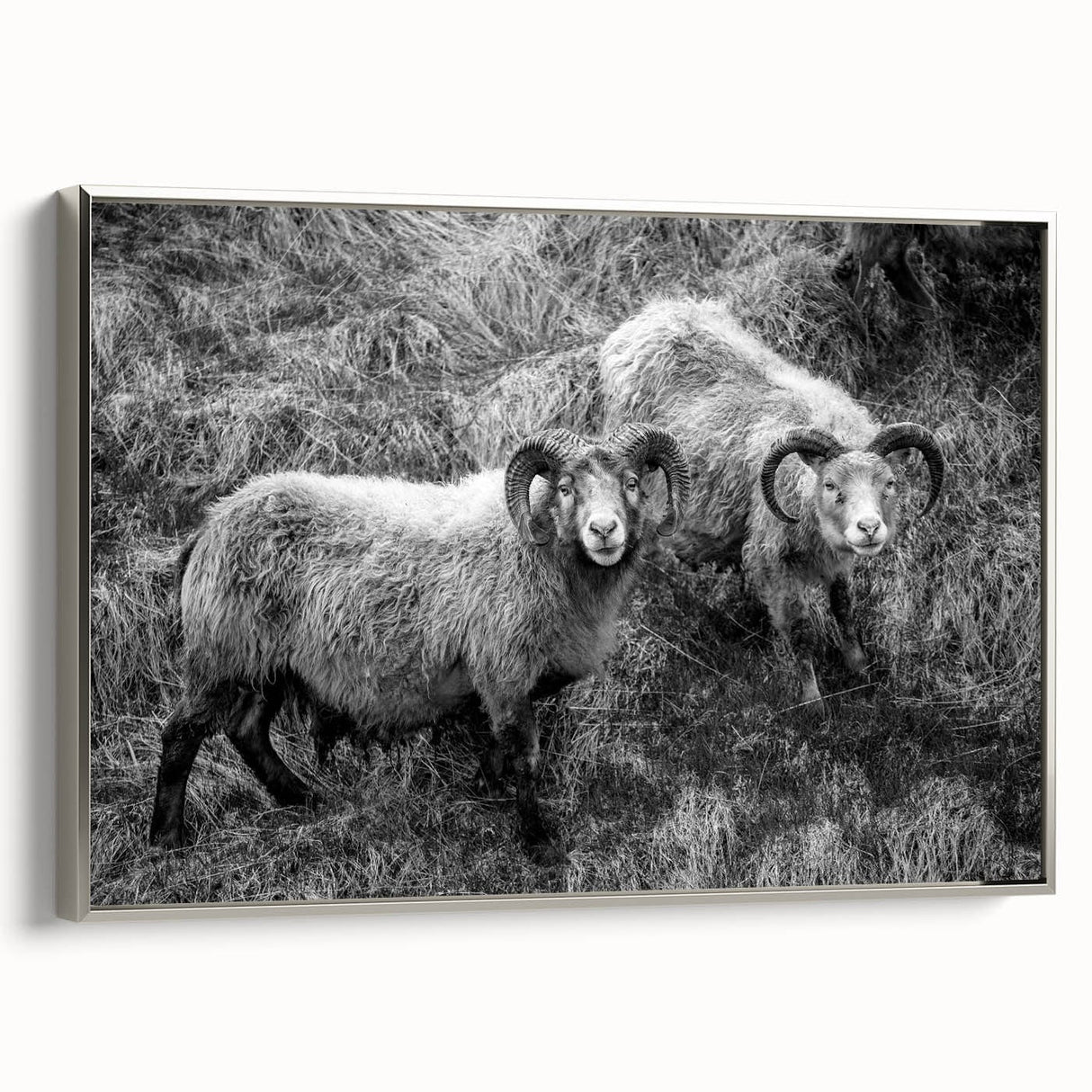 Celebrate the beauty of high-quality fine art photography with this captivating black and white portrait of two rams. Their powerful presence, set against a textured grassy landscape, creates an image that embodies strength, resilience, and the raw elegance of nature.