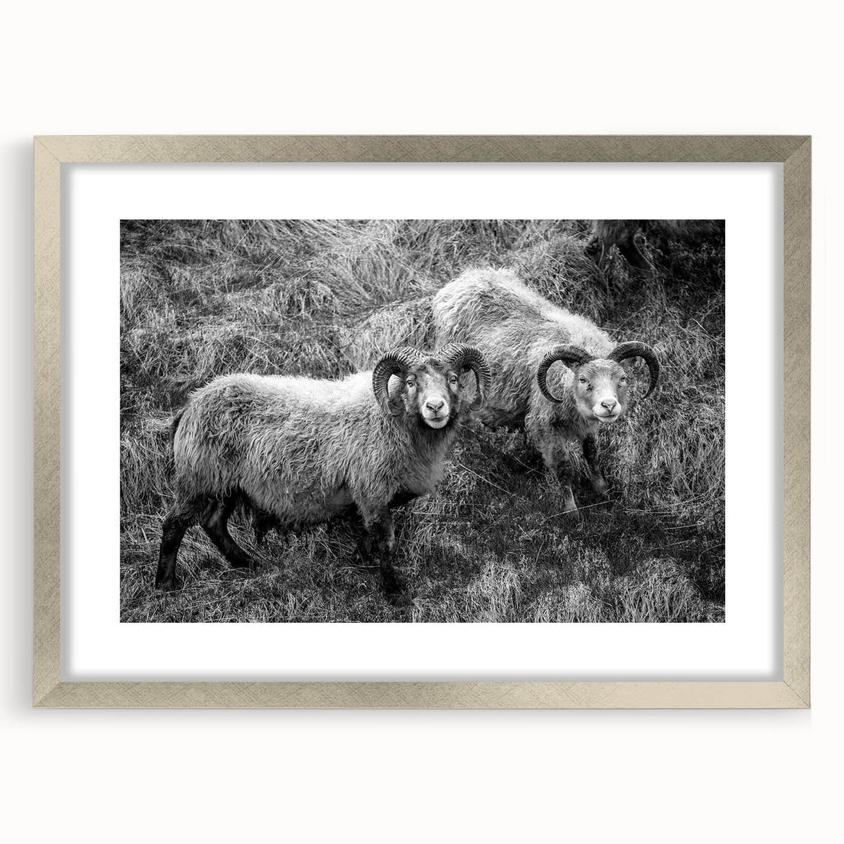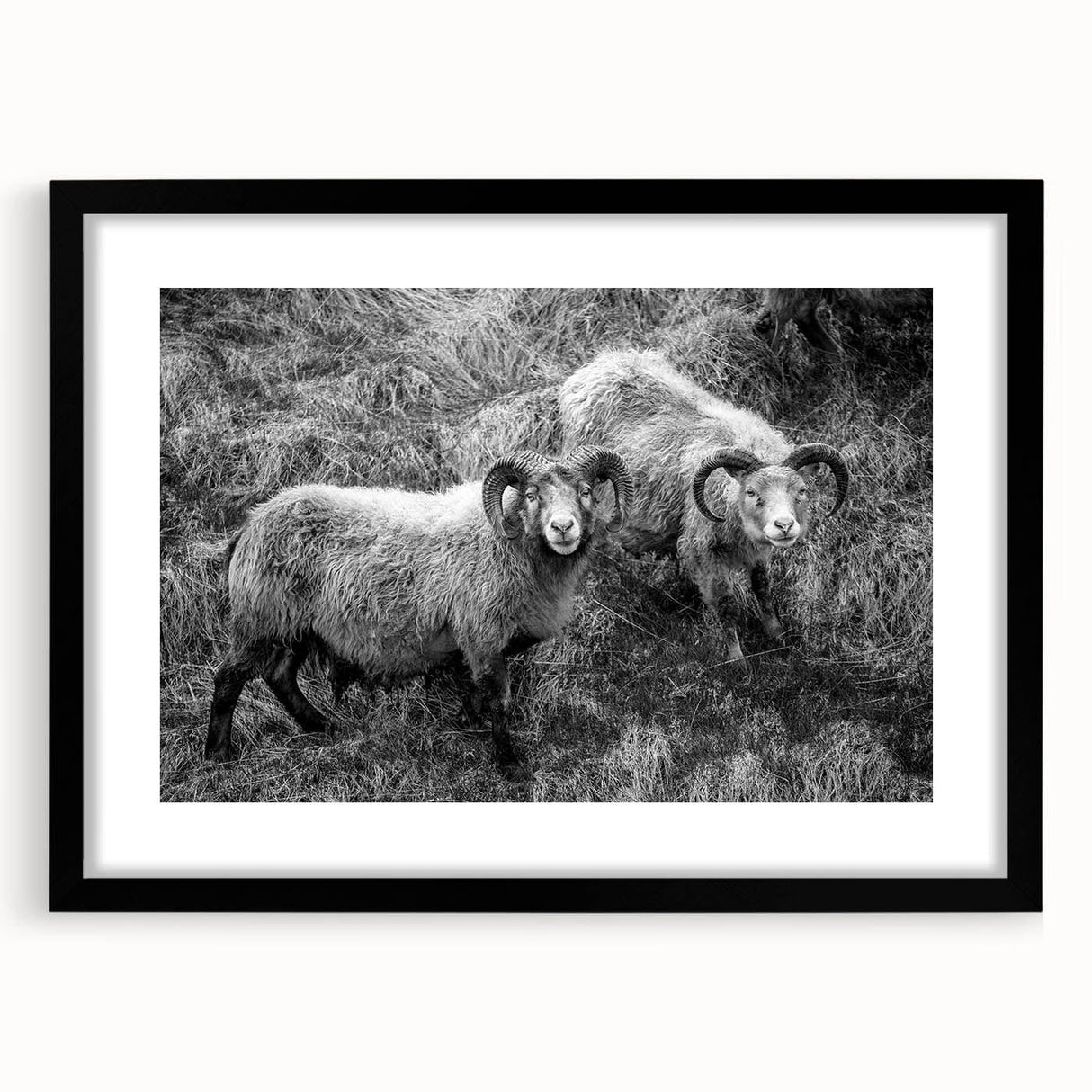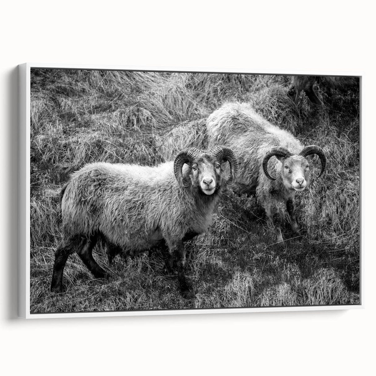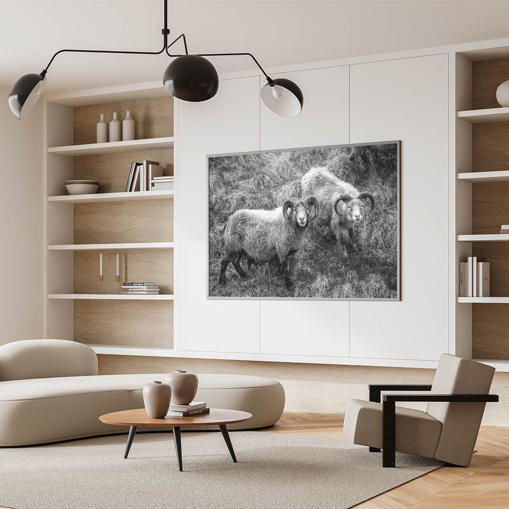 Celebrate the beauty of high-quality fine art photography with this captivating black and white portrait of two rams. Their powerful presence, set against a textured grassy landscape, creates an image that embodies strength, resilience, and the raw elegance of nature.