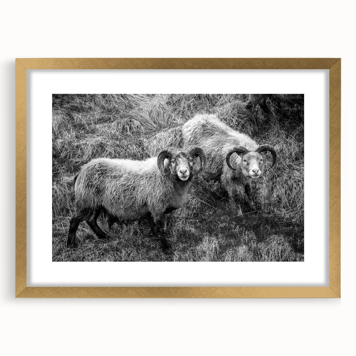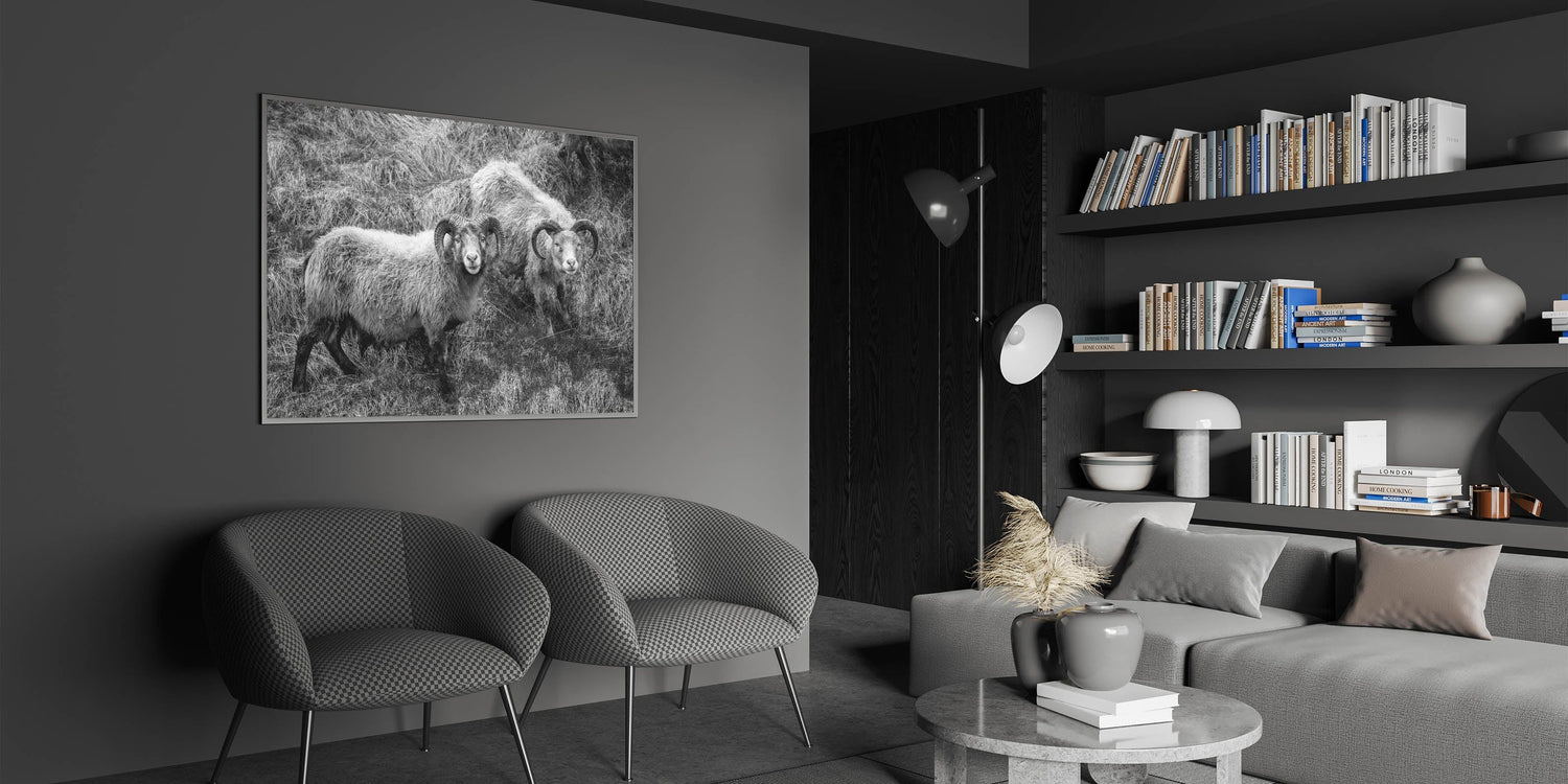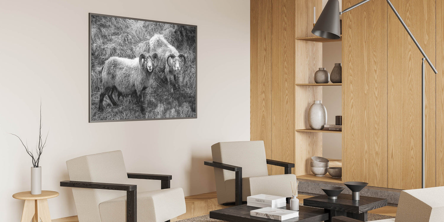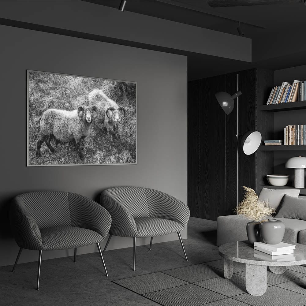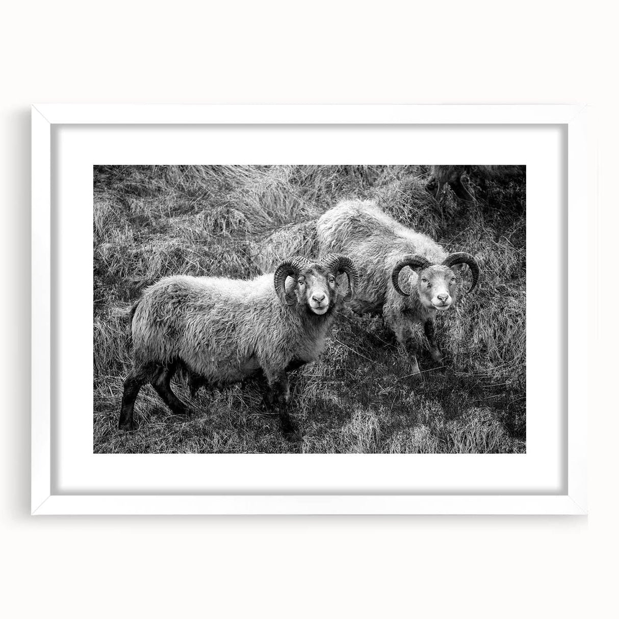 Celebrate the beauty of high-quality fine art photography with this captivating black and white portrait of two rams. Their powerful presence, set against a textured grassy landscape, creates an image that embodies strength, resilience, and the raw elegance of nature.