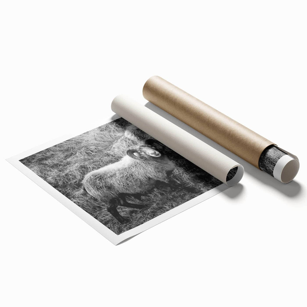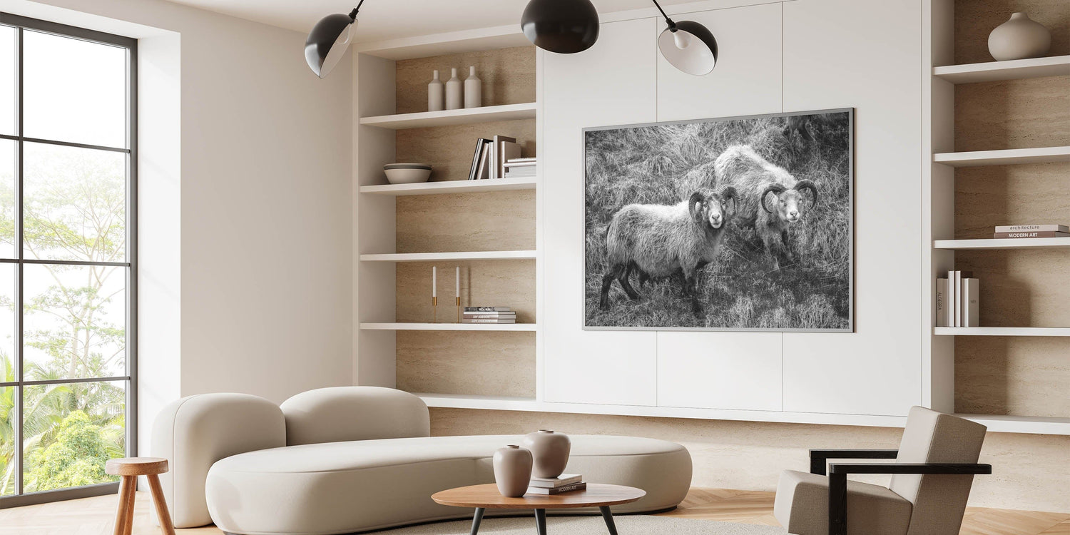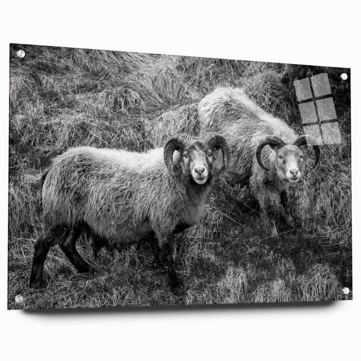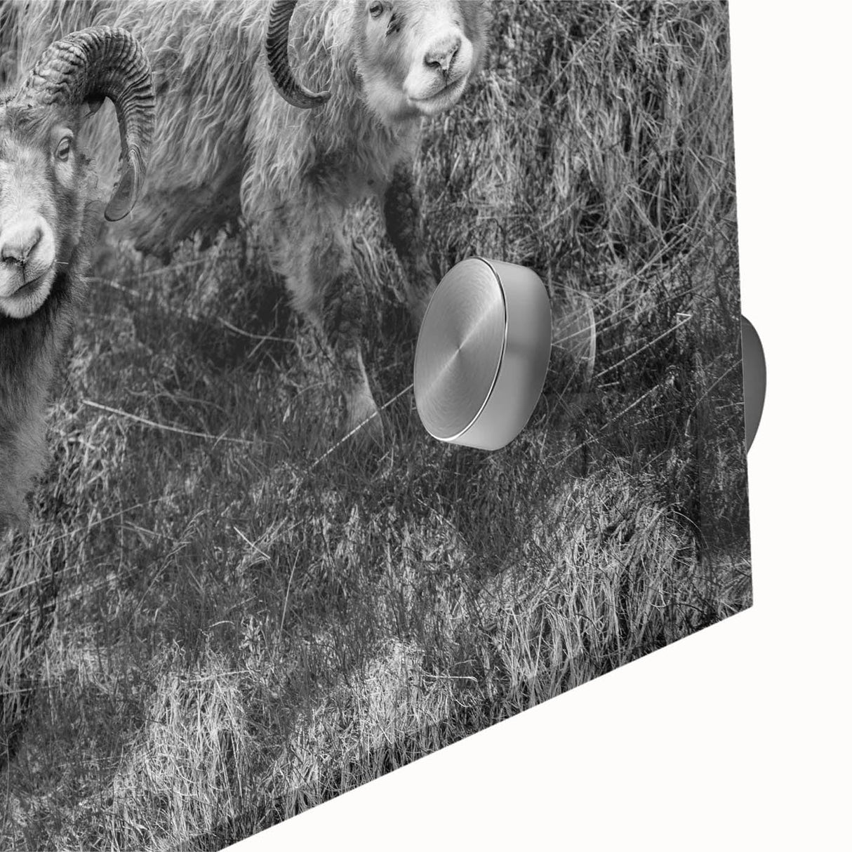 Celebrate the beauty of high-quality fine art photography with this captivating black and white portrait of two rams. Their powerful presence, set against a textured grassy landscape, creates an image that embodies strength, resilience, and the raw elegance of nature.