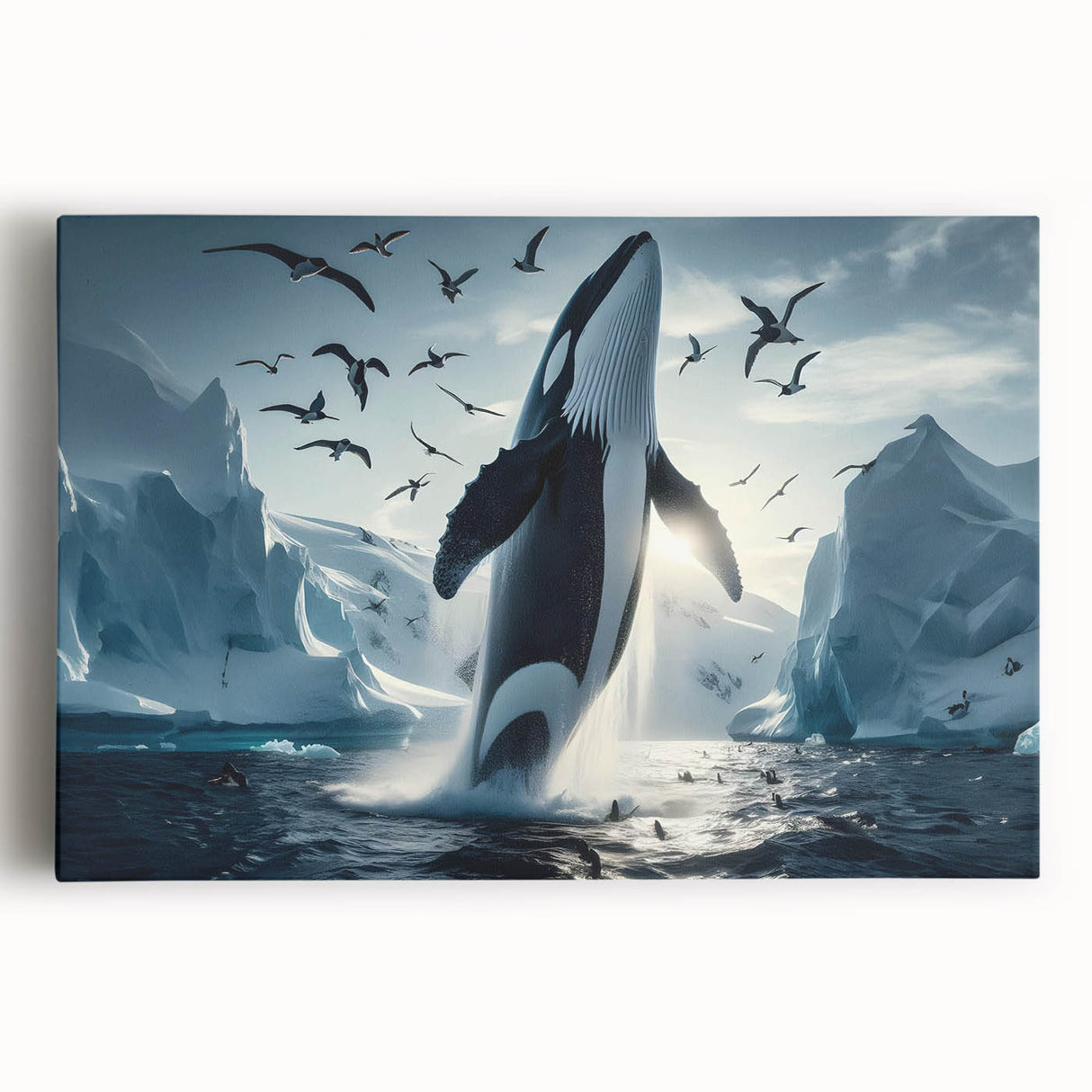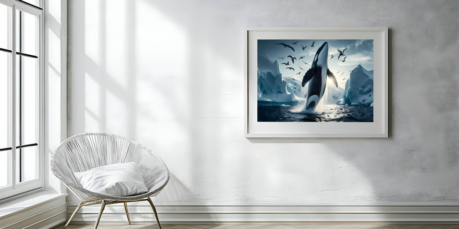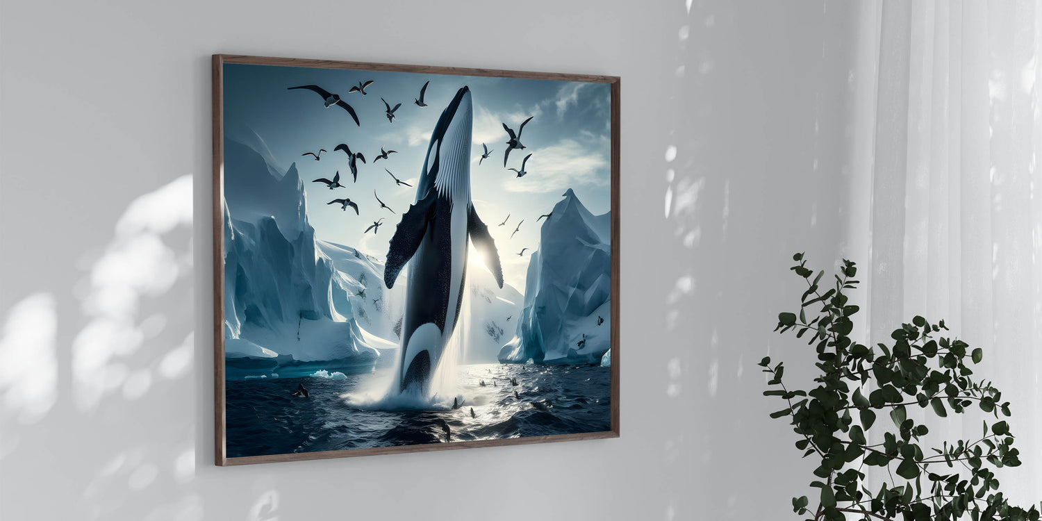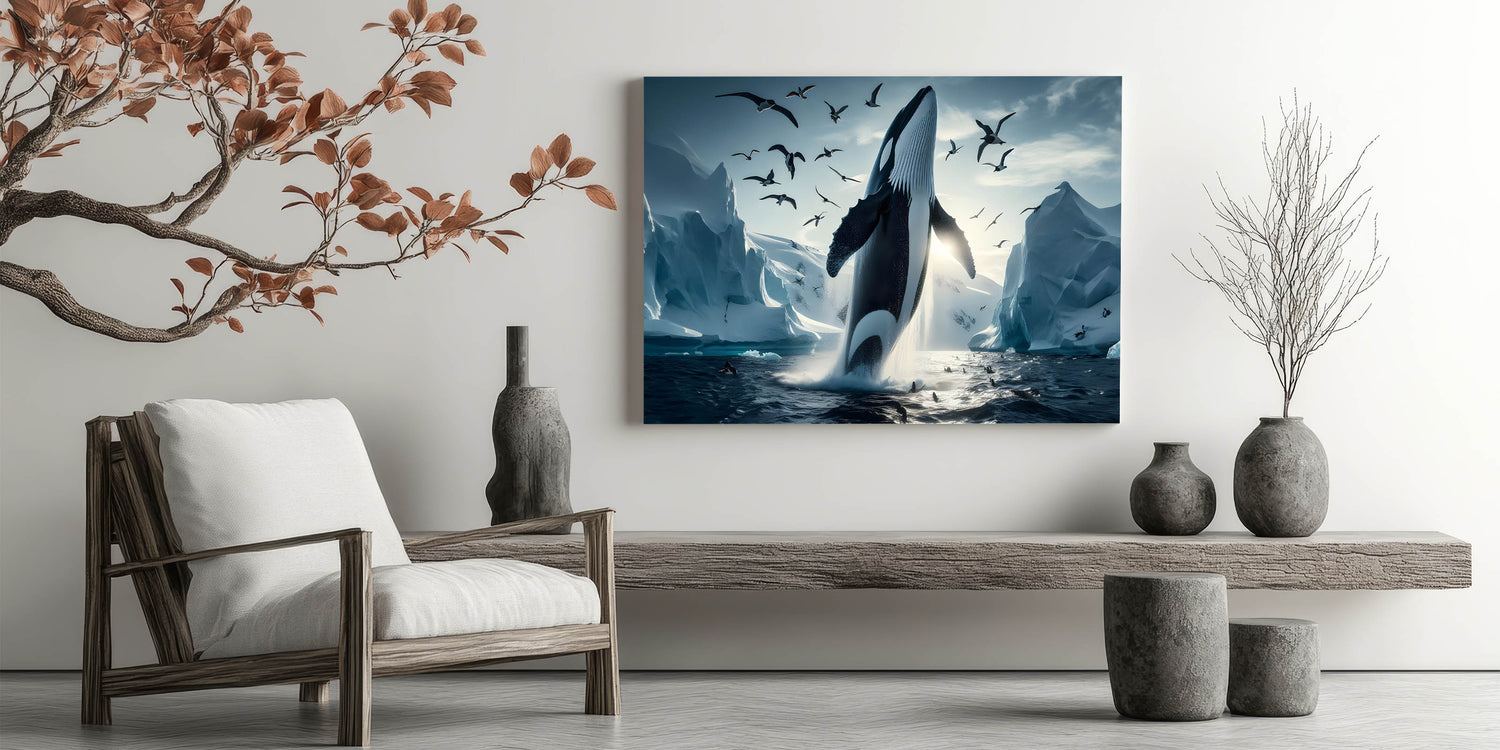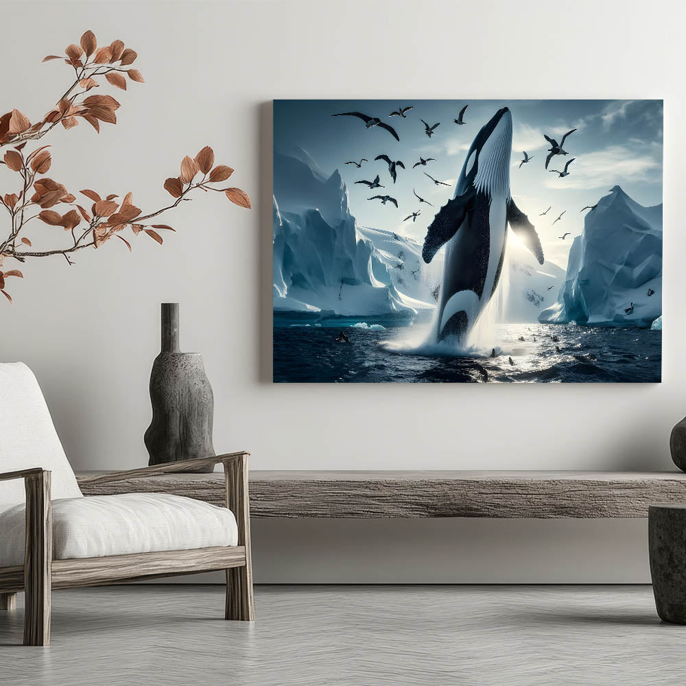 Capture the stunning beauty of the Arctic with this Majestic Orca Whale Art. This striking piece features an orca whale breaching amidst icy landscapes and a sky filled with soaring seabirds. The powerful presence of the orca, combined with the dramatic backdrop of glaciers and the serene light of the Arctic, makes this artwork a true masterpiece. Ideal for those who love marine life and arctic scenes, this piece is available in multiple formats, including stretched canvas, framed canvas, acrylic glass, and more.