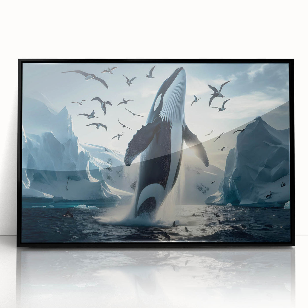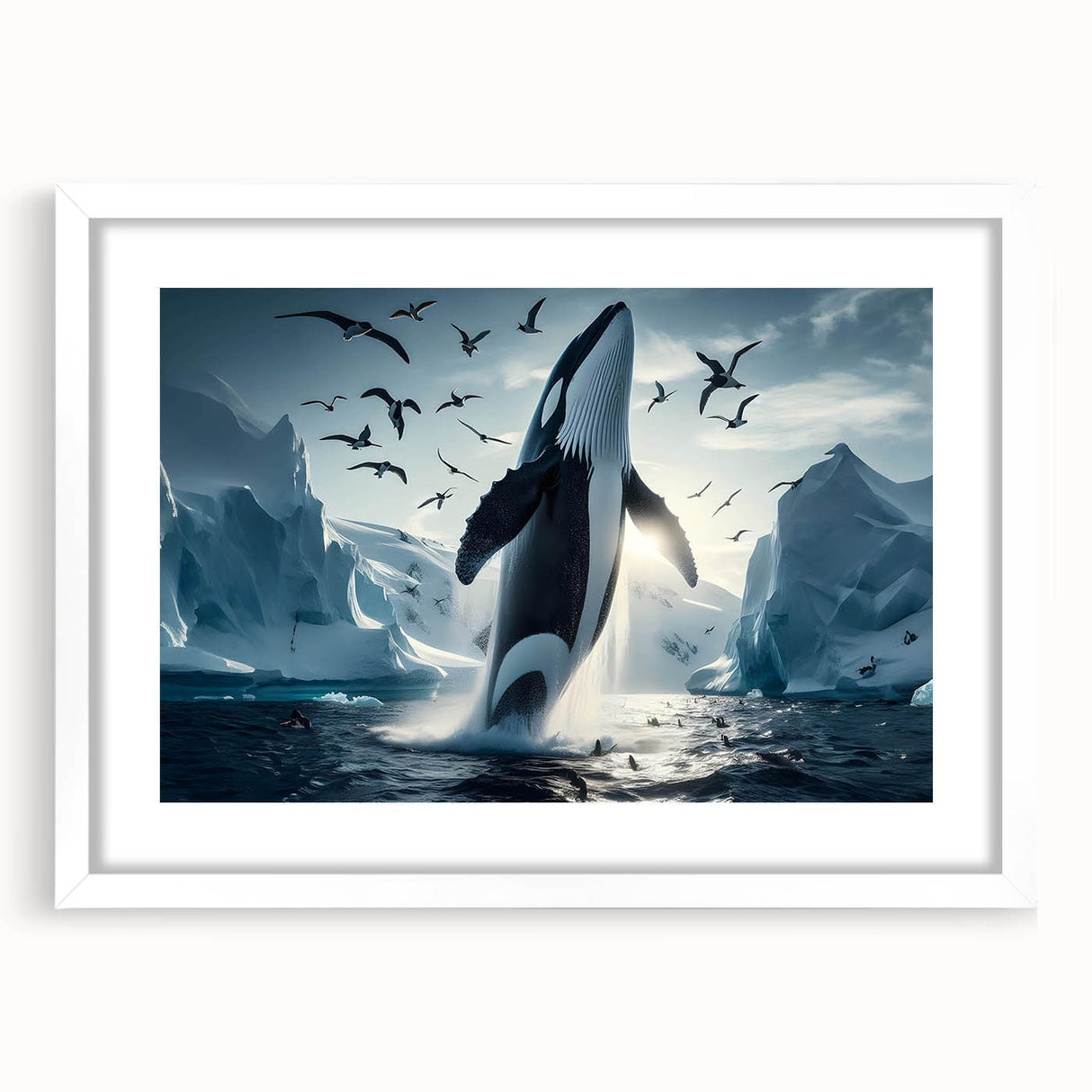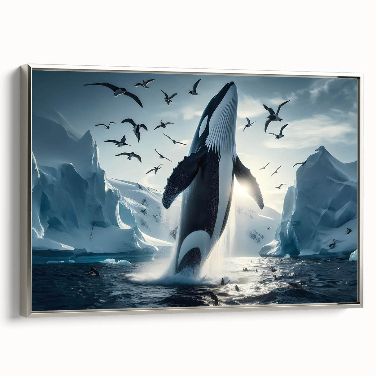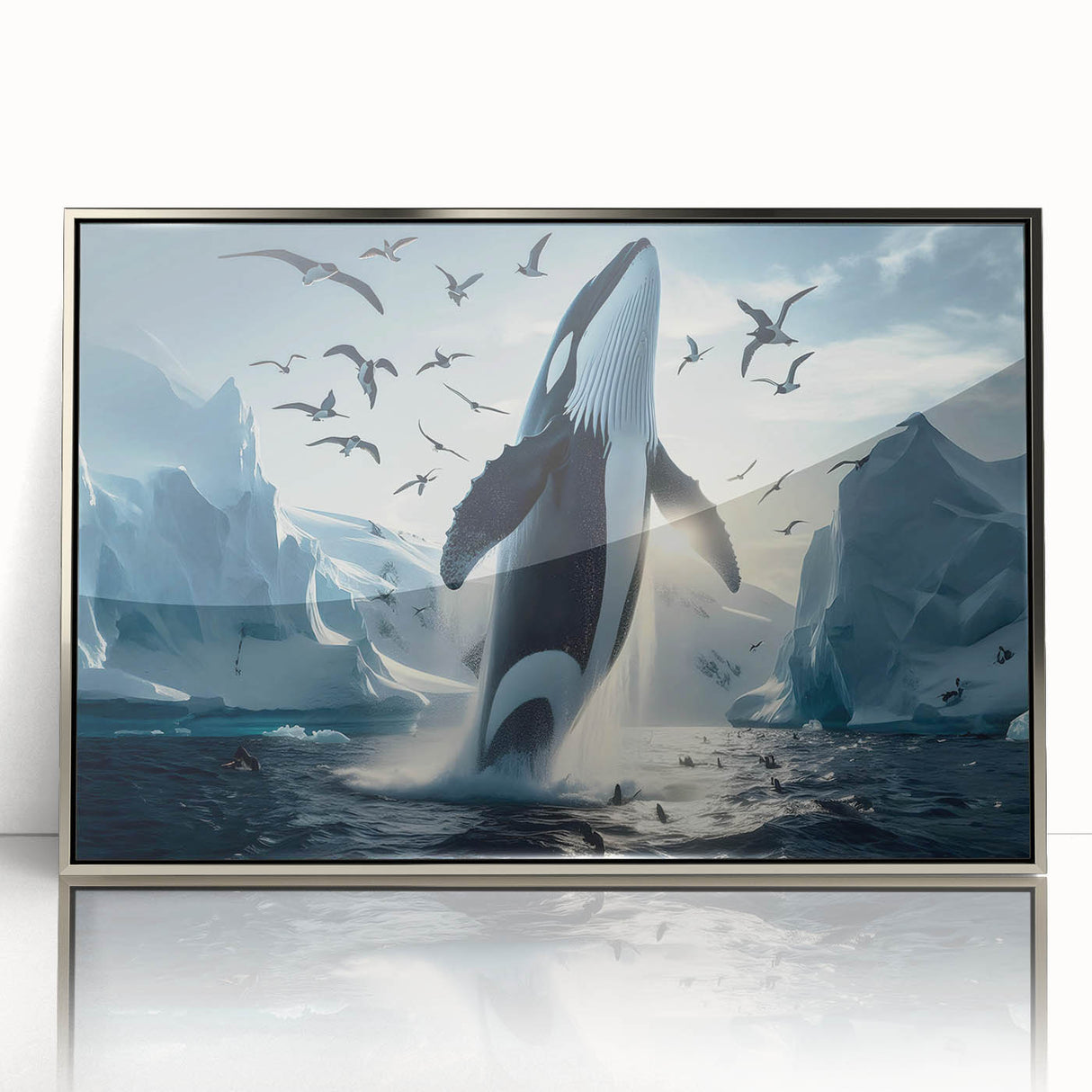 Capture the stunning beauty of the Arctic with this Majestic Orca Whale Art. This striking piece features an orca whale breaching amidst icy landscapes and a sky filled with soaring seabirds. The powerful presence of the orca, combined with the dramatic backdrop of glaciers and the serene light of the Arctic, makes this artwork a true masterpiece. Ideal for those who love marine life and arctic scenes, this piece is available in multiple formats, including stretched canvas, framed canvas, acrylic glass, and more.