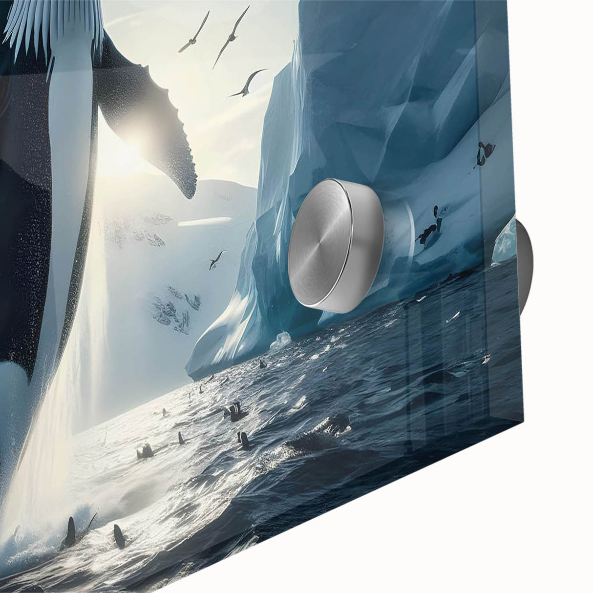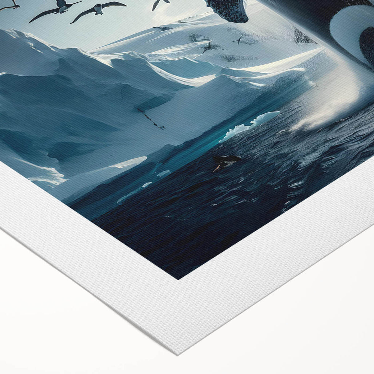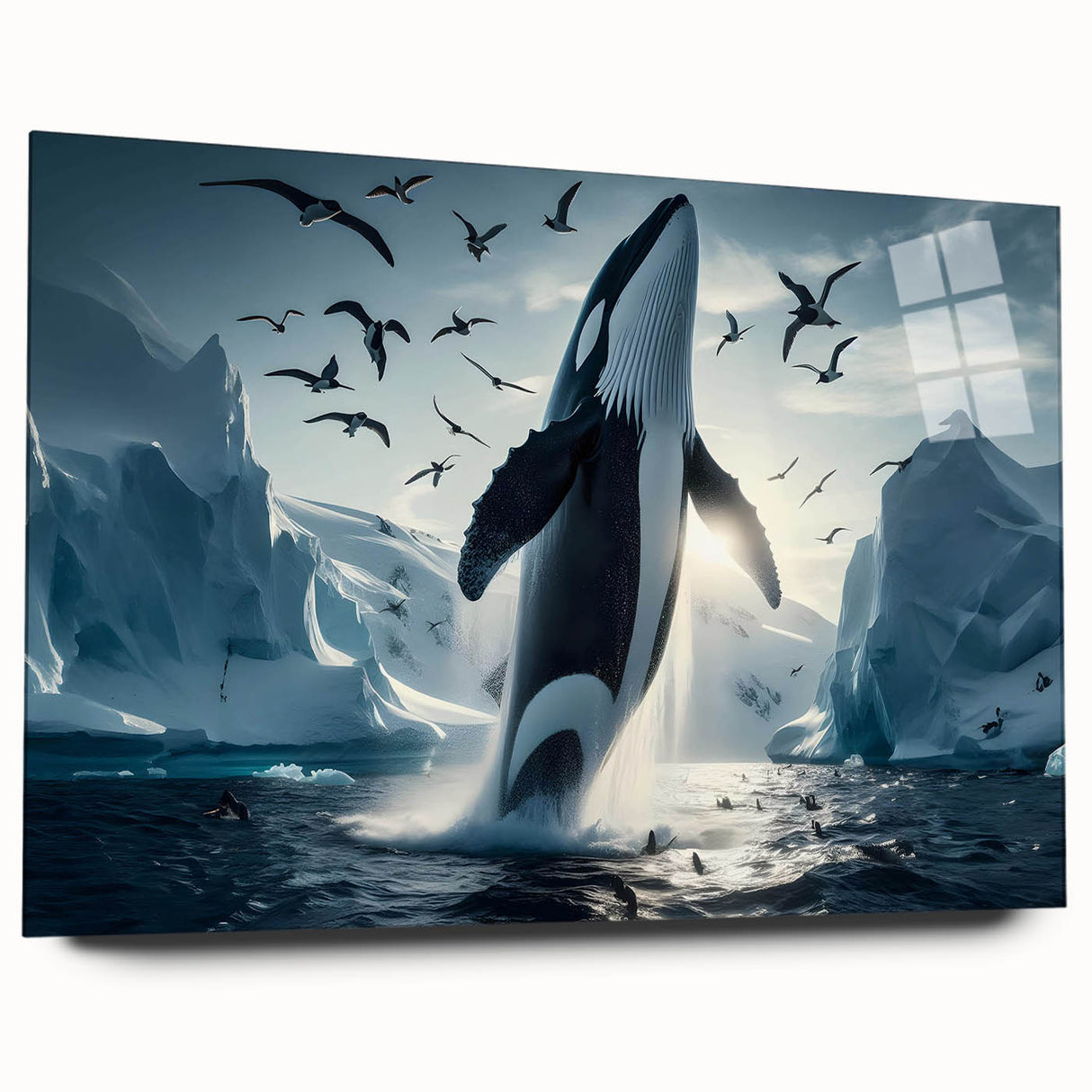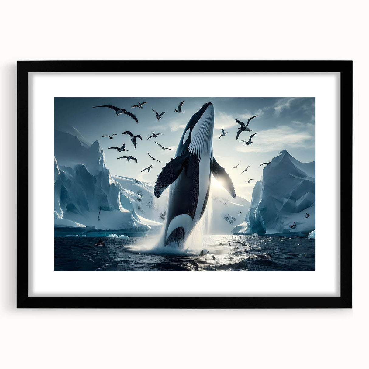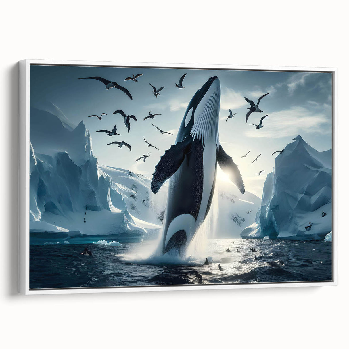 Capture the stunning beauty of the Arctic with this Majestic Orca Whale Art. This striking piece features an orca whale breaching amidst icy landscapes and a sky filled with soaring seabirds. The powerful presence of the orca, combined with the dramatic backdrop of glaciers and the serene light of the Arctic, makes this artwork a true masterpiece. Ideal for those who love marine life and arctic scenes, this piece is available in multiple formats, including stretched canvas, framed canvas, acrylic glass, and more.