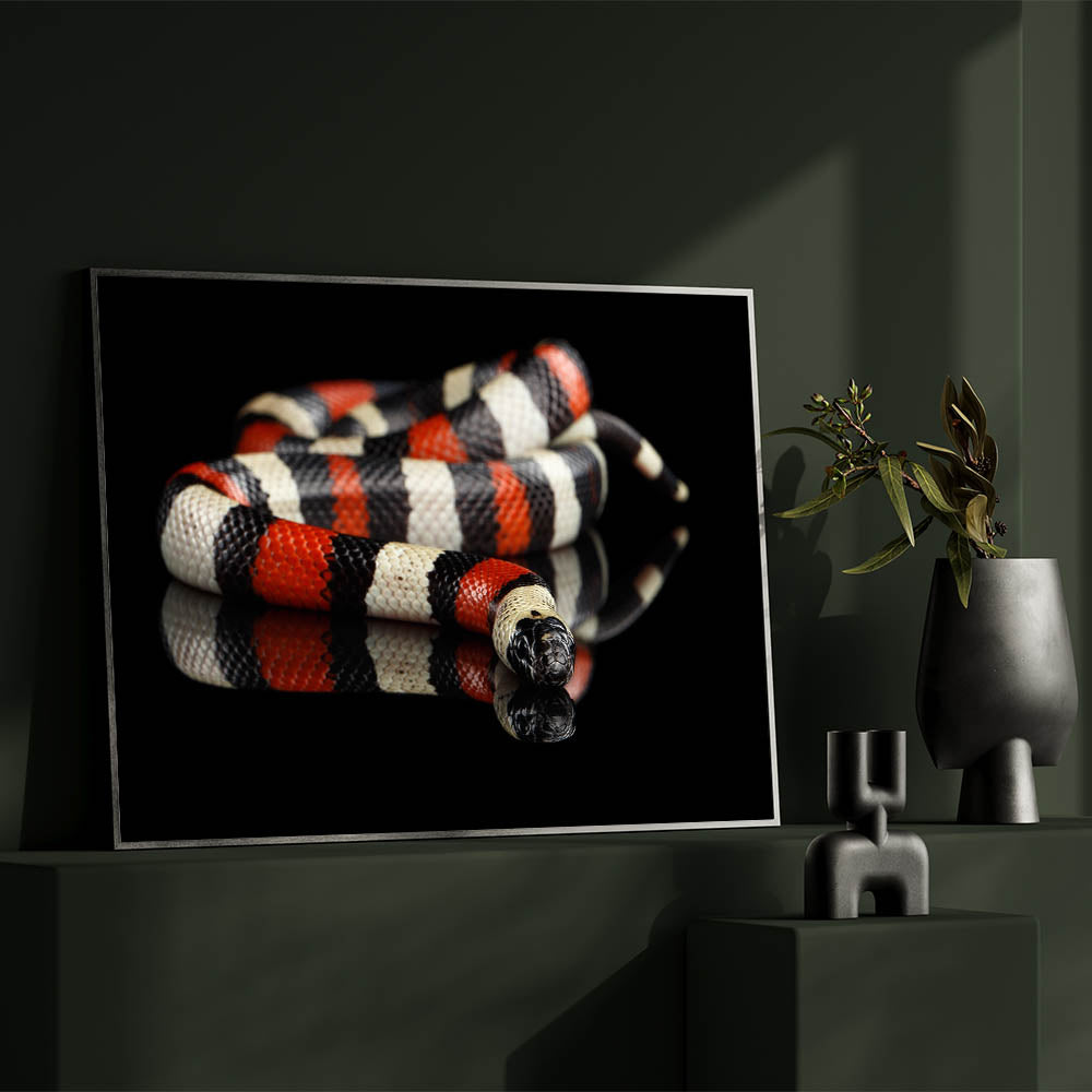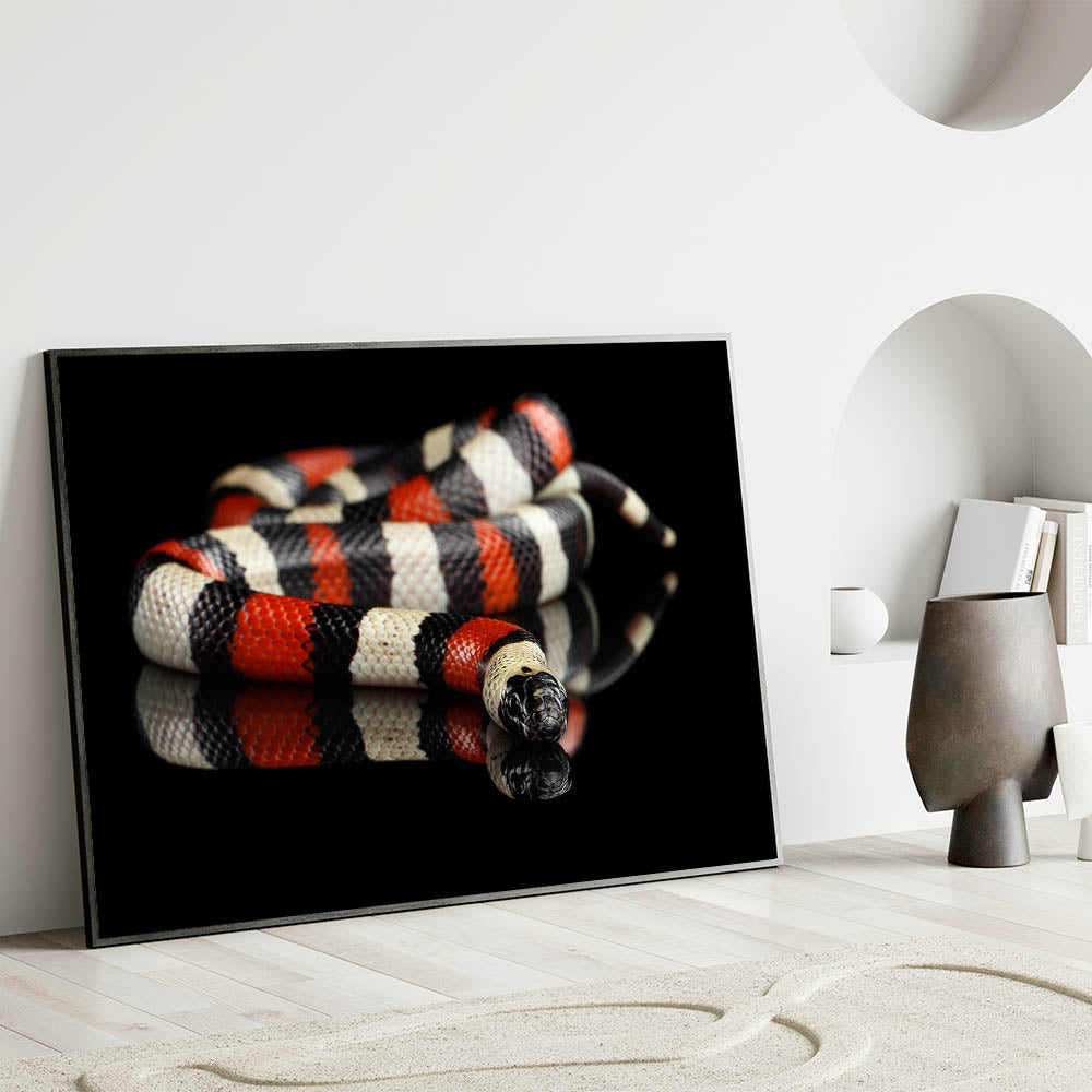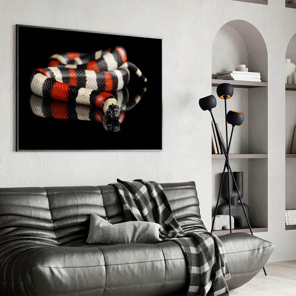 Introduce a captivating element of the wild into your home with our Majestic Snake Wall Art. This striking piece captures the intricate beauty of a serpent with a stunning black, red, and white color palette, perfect for any nature lover or wildlife enthusiast. The high-definition detail showcases the texture and patterns of the snake's scales, making it an eye-catching centerpiece in any room.