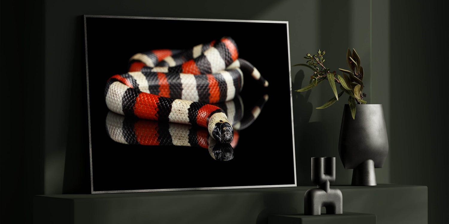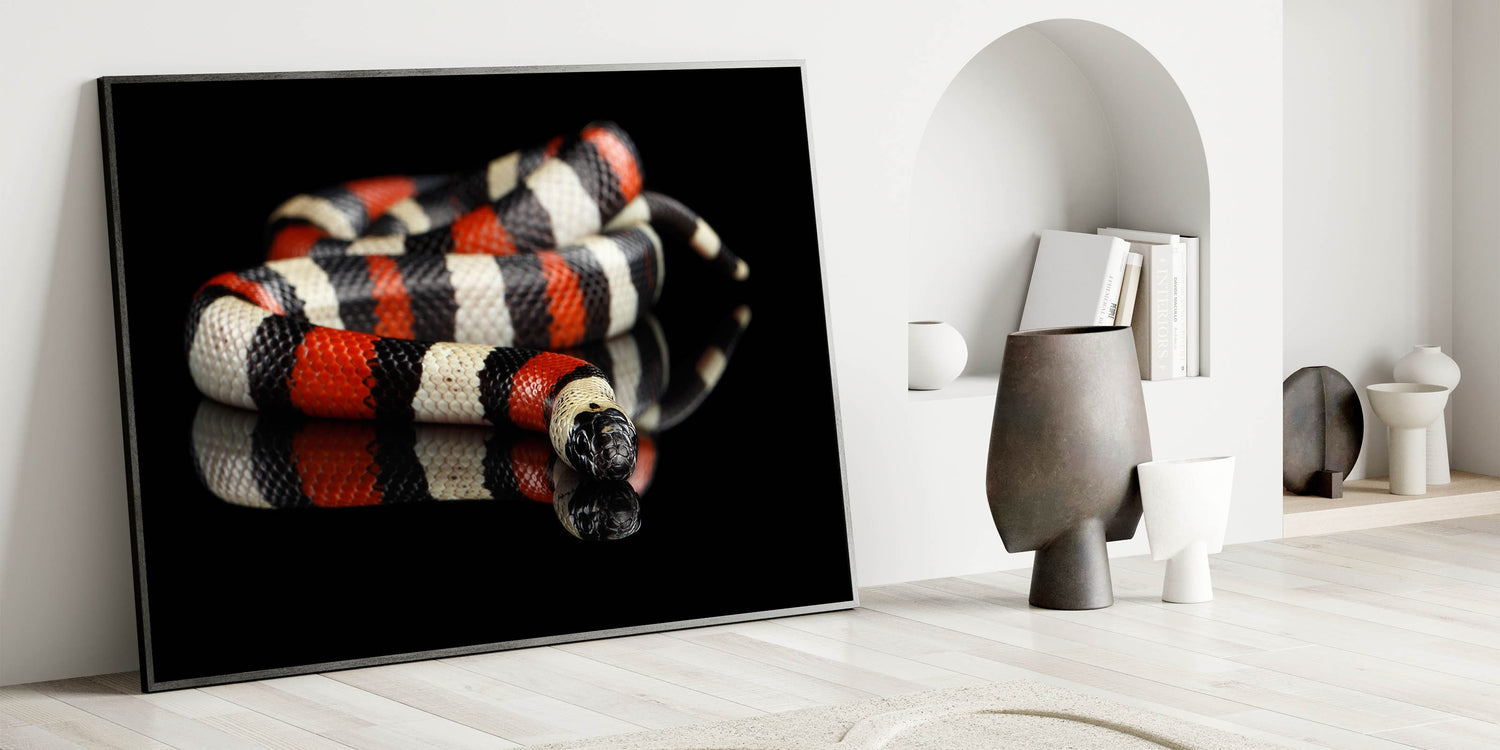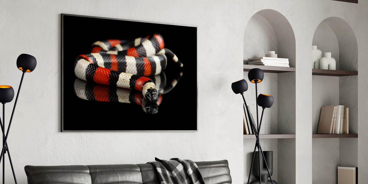 Introduce a captivating element of the wild into your home with our Majestic Snake Wall Art. This striking piece captures the intricate beauty of a serpent with a stunning black, red, and white color palette, perfect for any nature lover or wildlife enthusiast. The high-definition detail showcases the texture and patterns of the snake's scales, making it an eye-catching centerpiece in any room.