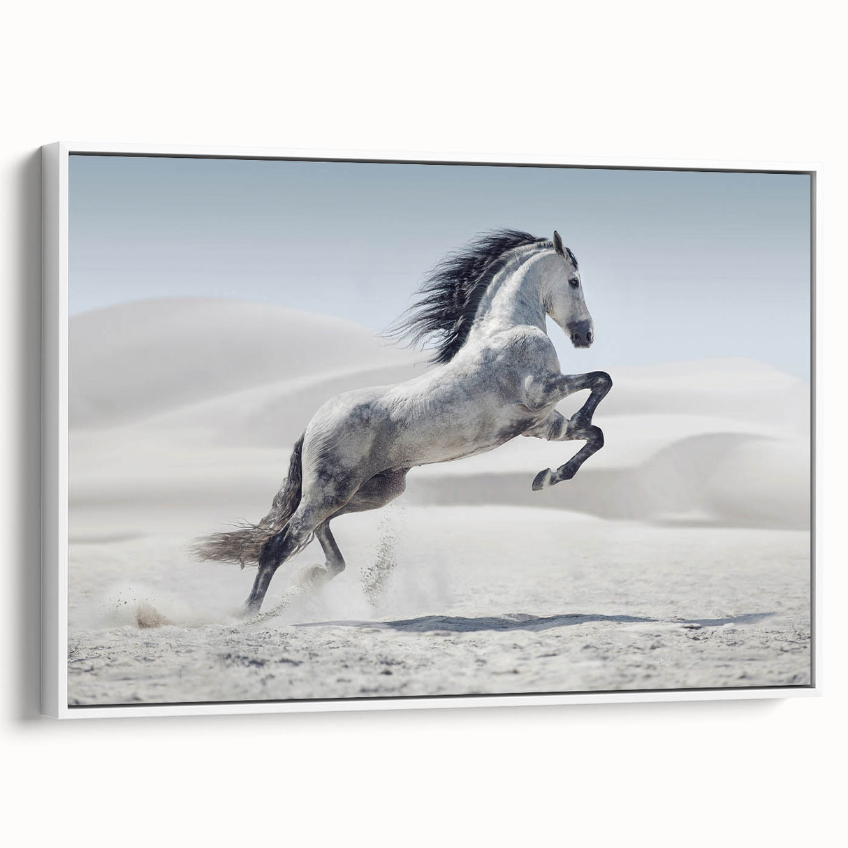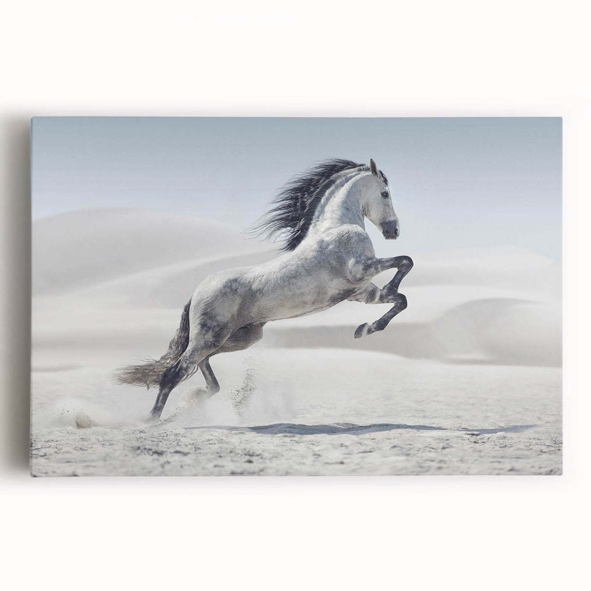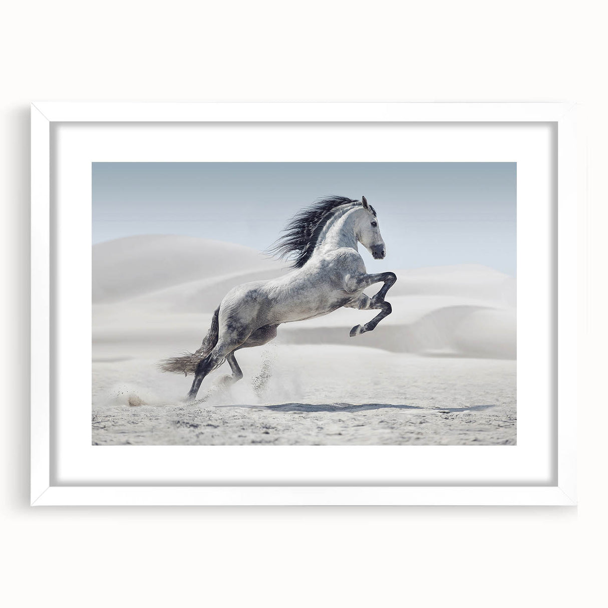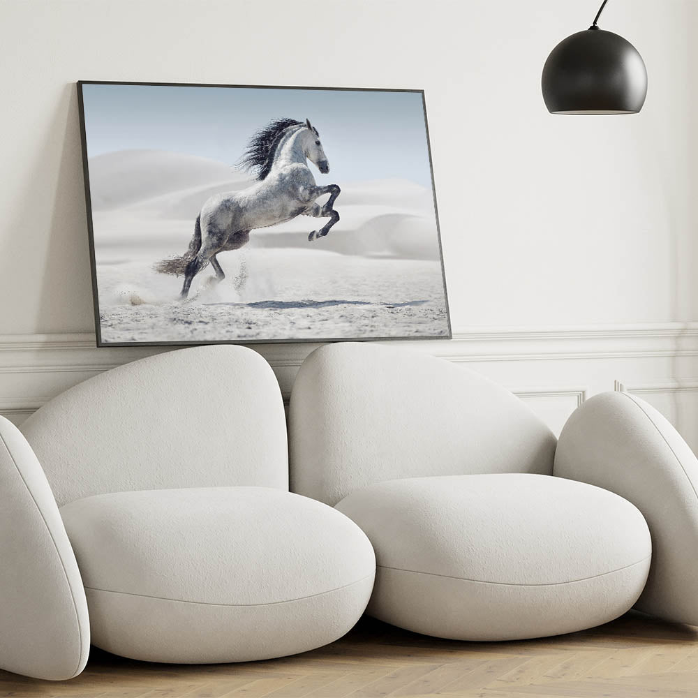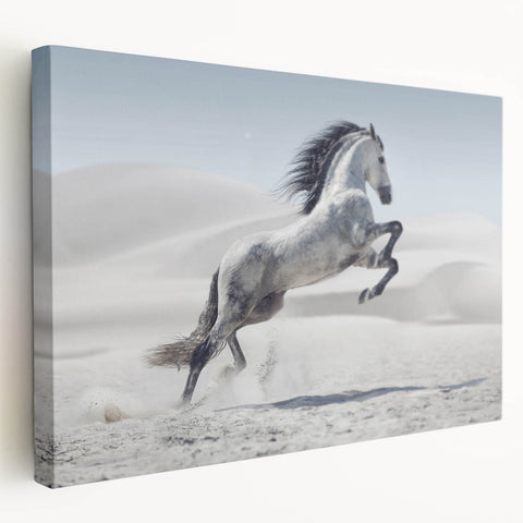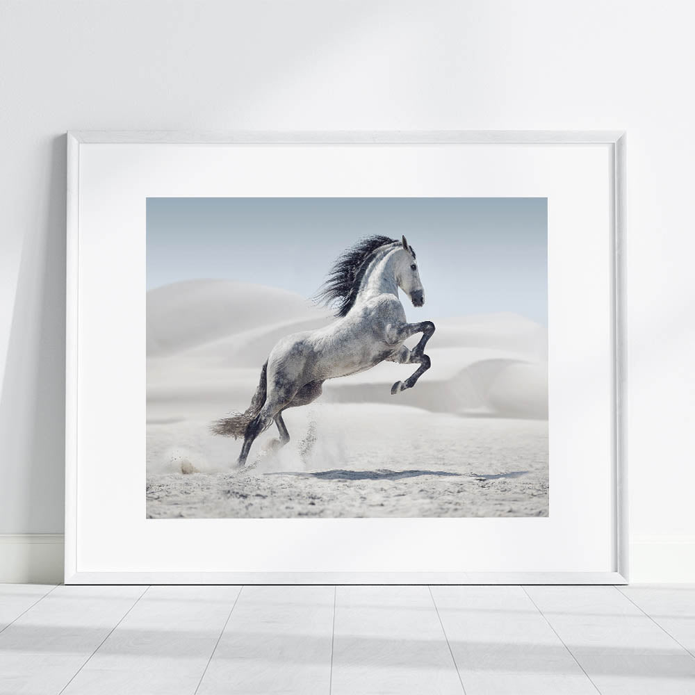 Capture the spirit of freedom with this breathtaking wildlife photography wall art featuring a majestic white horse rearing in a tranquil desert. The stark beauty of the desert dunes contrasts elegantly with the horse’s flowing mane and dynamic pose, creating a powerful composition. Perfect for living rooms, bedrooms, or offices, this artwork adds a sense of motion and grace to any interior.