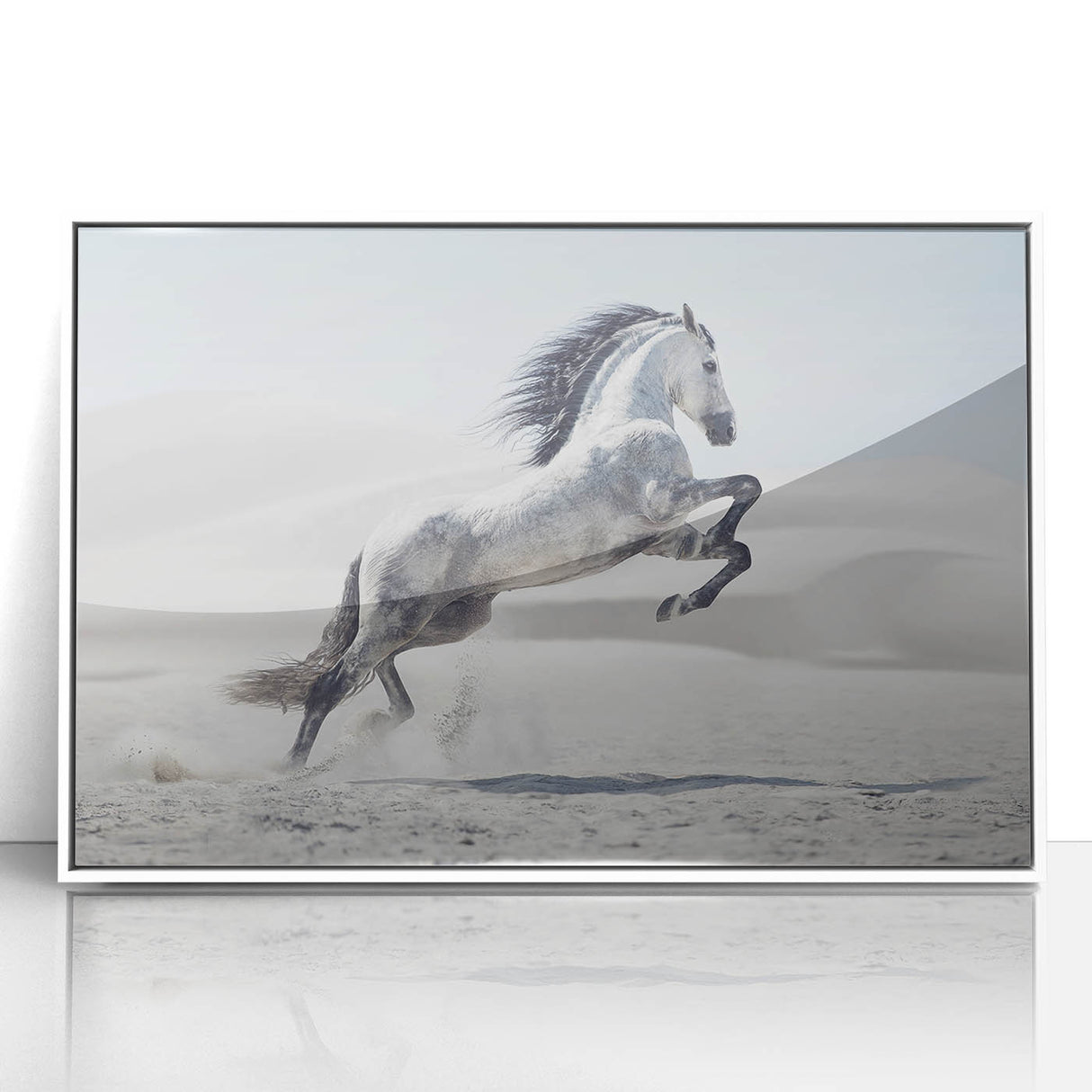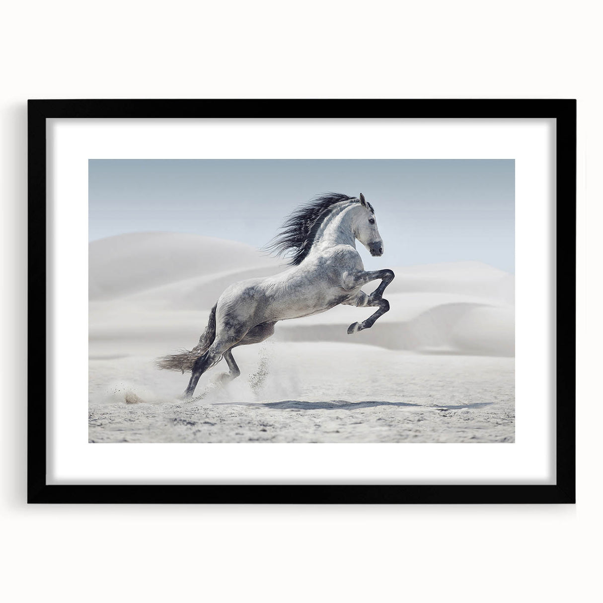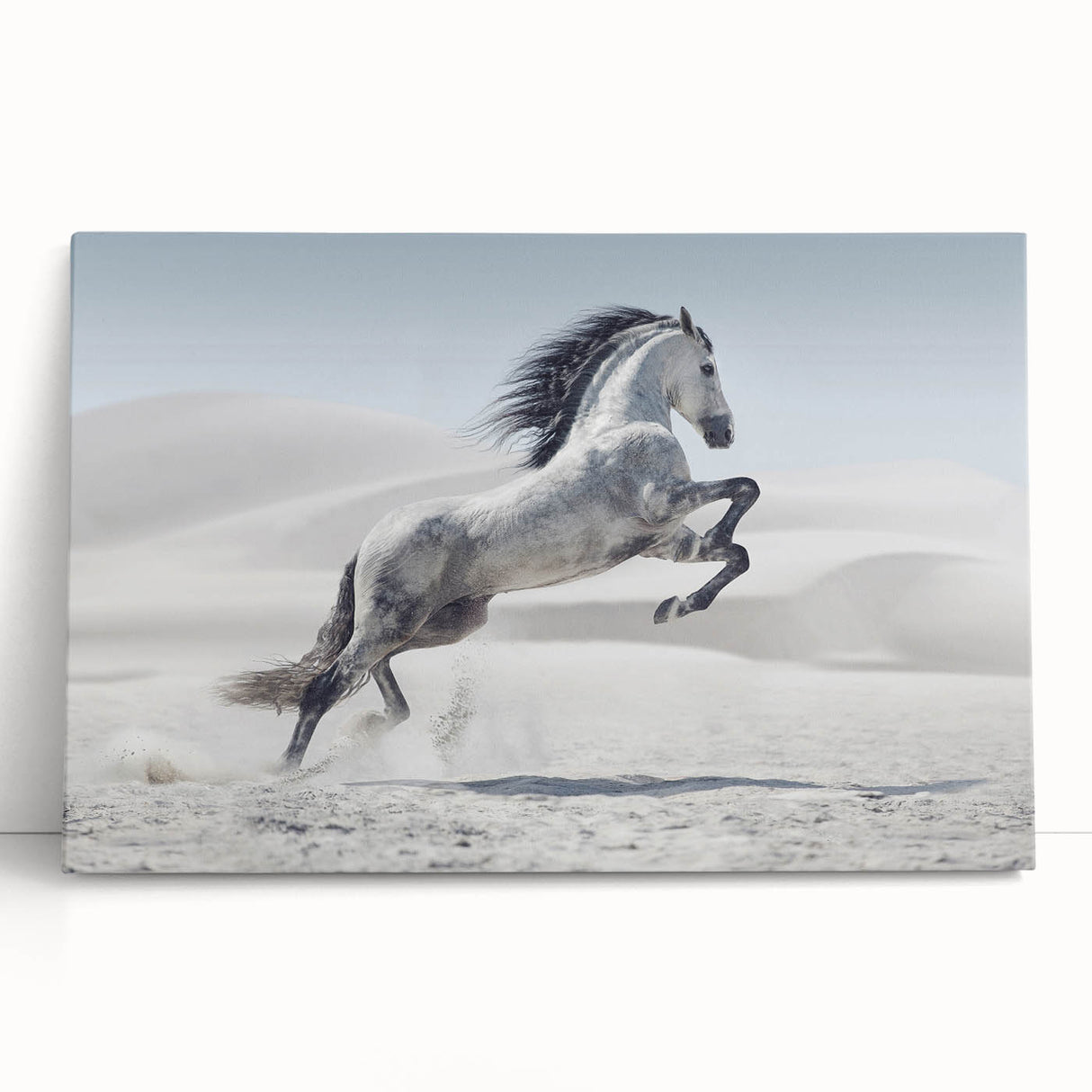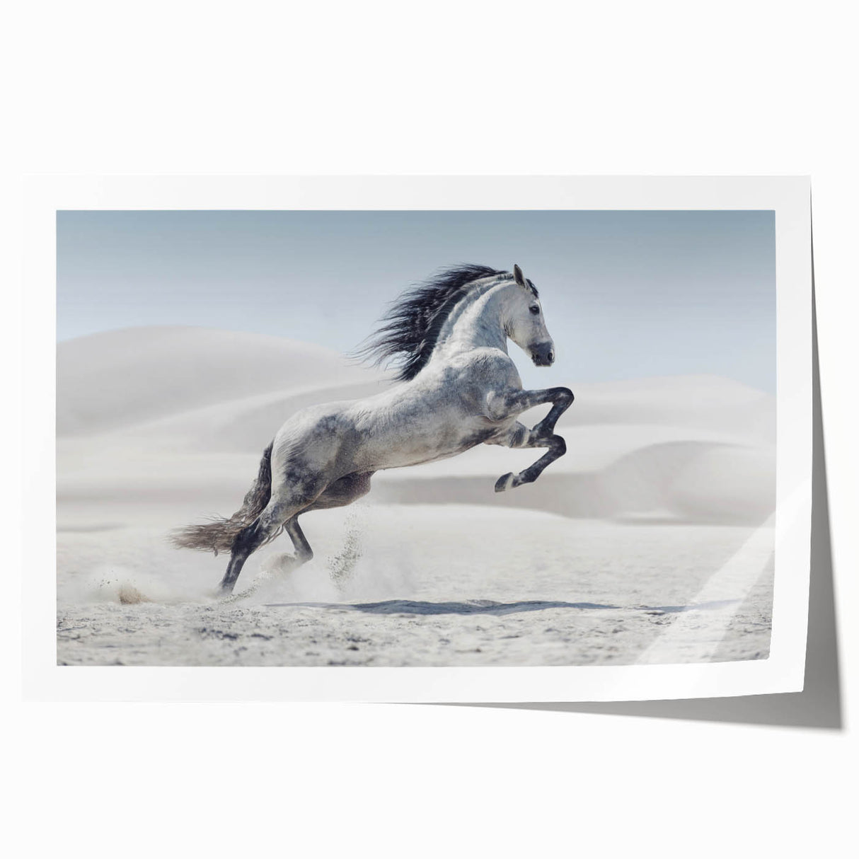 Capture the spirit of freedom with this breathtaking wildlife photography wall art featuring a majestic white horse rearing in a tranquil desert. The stark beauty of the desert dunes contrasts elegantly with the horse’s flowing mane and dynamic pose, creating a powerful composition. Perfect for living rooms, bedrooms, or offices, this artwork adds a sense of motion and grace to any interior.