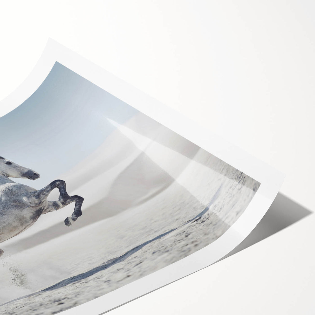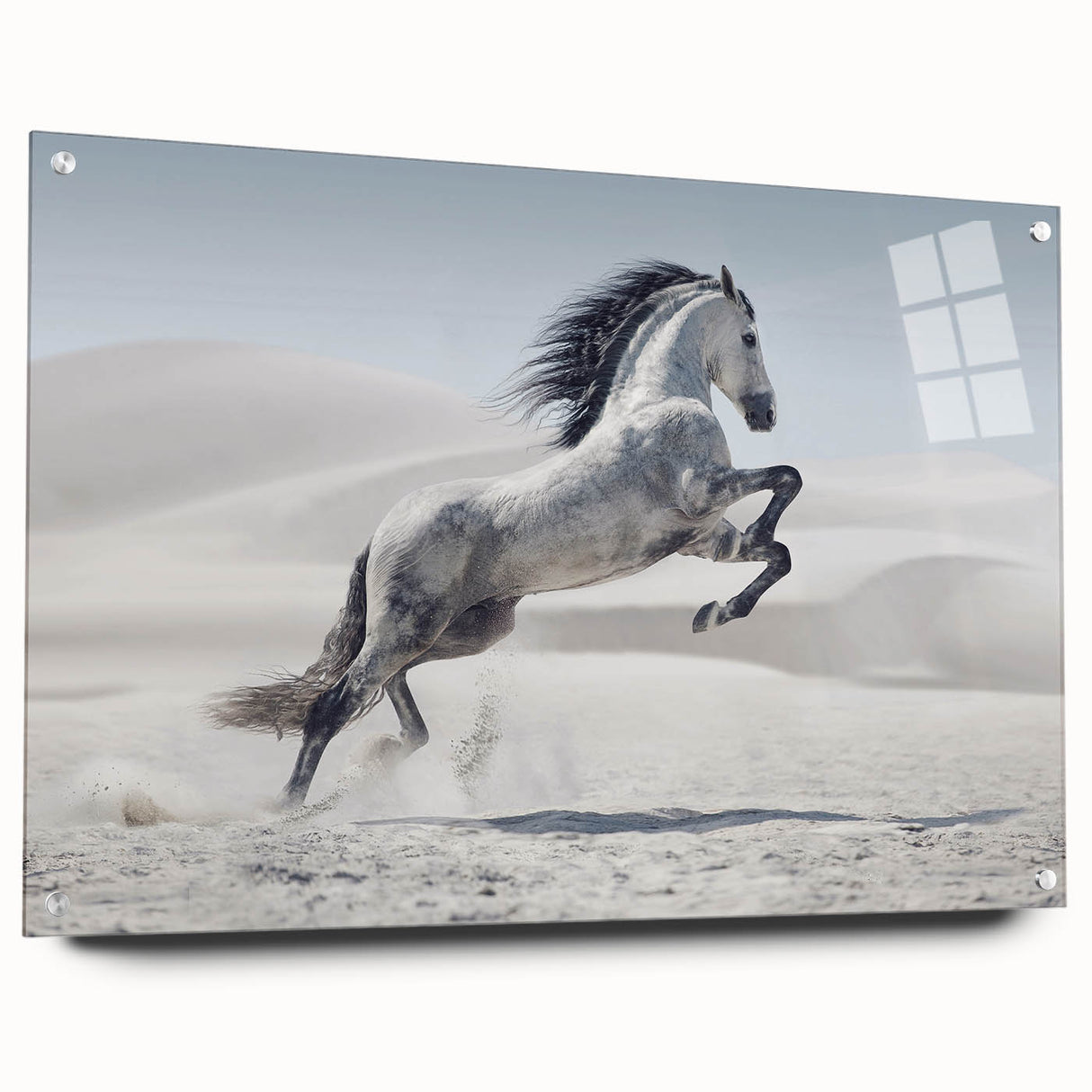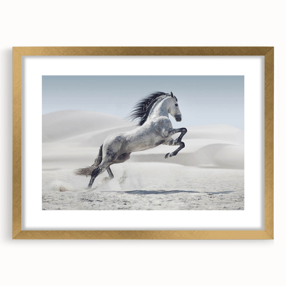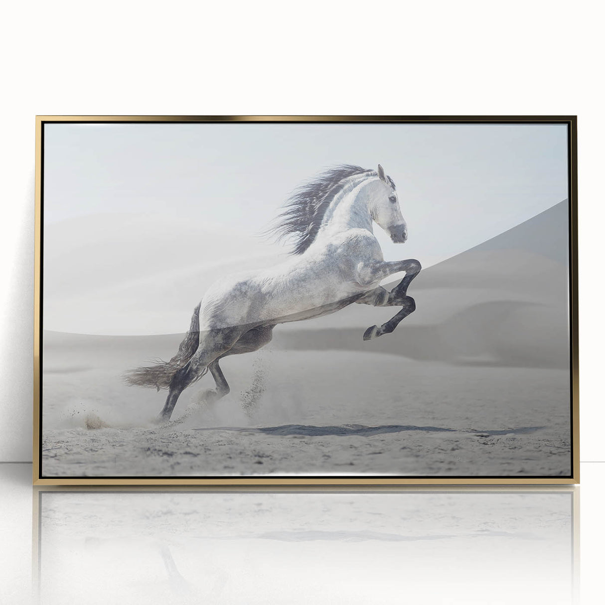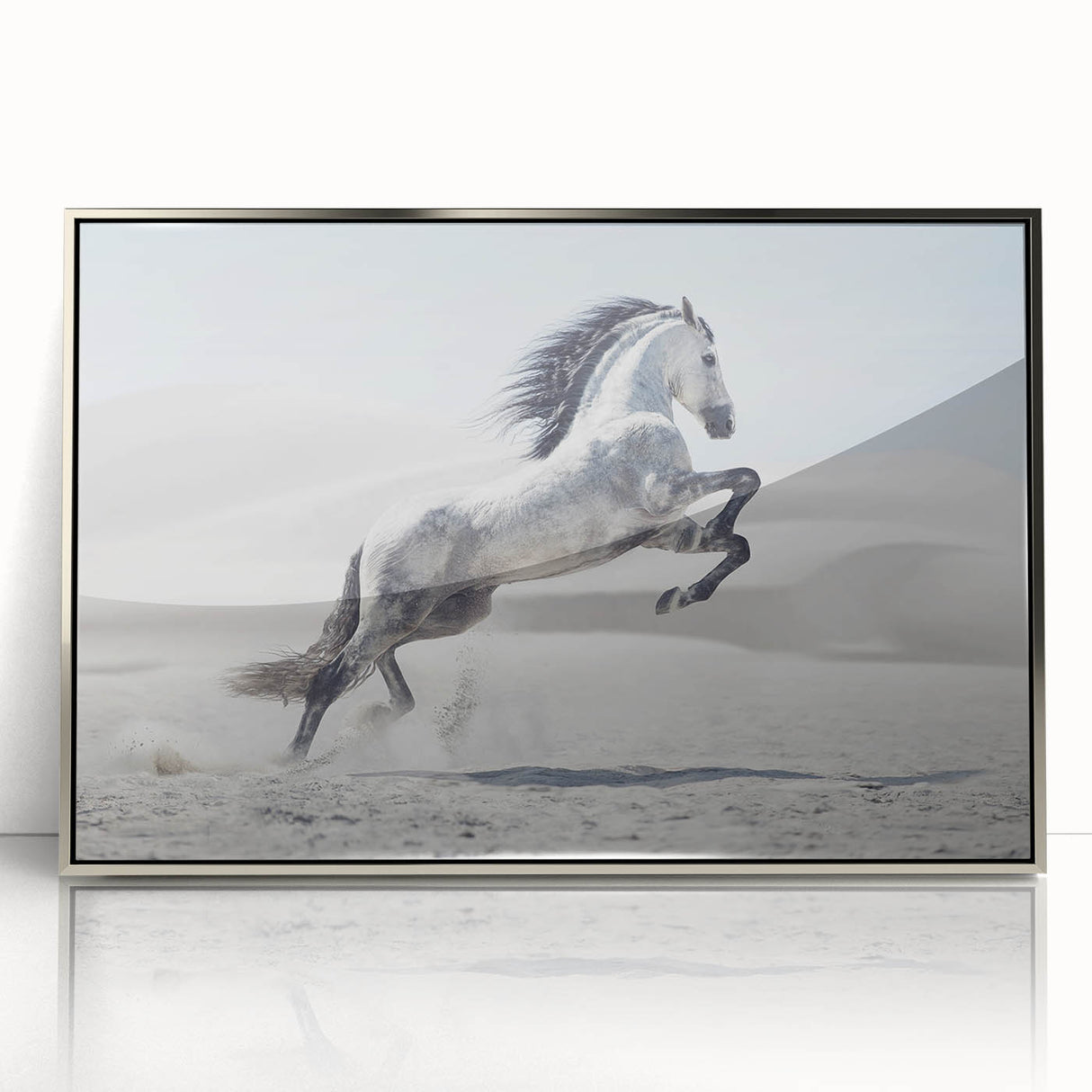 Capture the spirit of freedom with this breathtaking wildlife photography wall art featuring a majestic white horse rearing in a tranquil desert. The stark beauty of the desert dunes contrasts elegantly with the horse’s flowing mane and dynamic pose, creating a powerful composition. Perfect for living rooms, bedrooms, or offices, this artwork adds a sense of motion and grace to any interior.