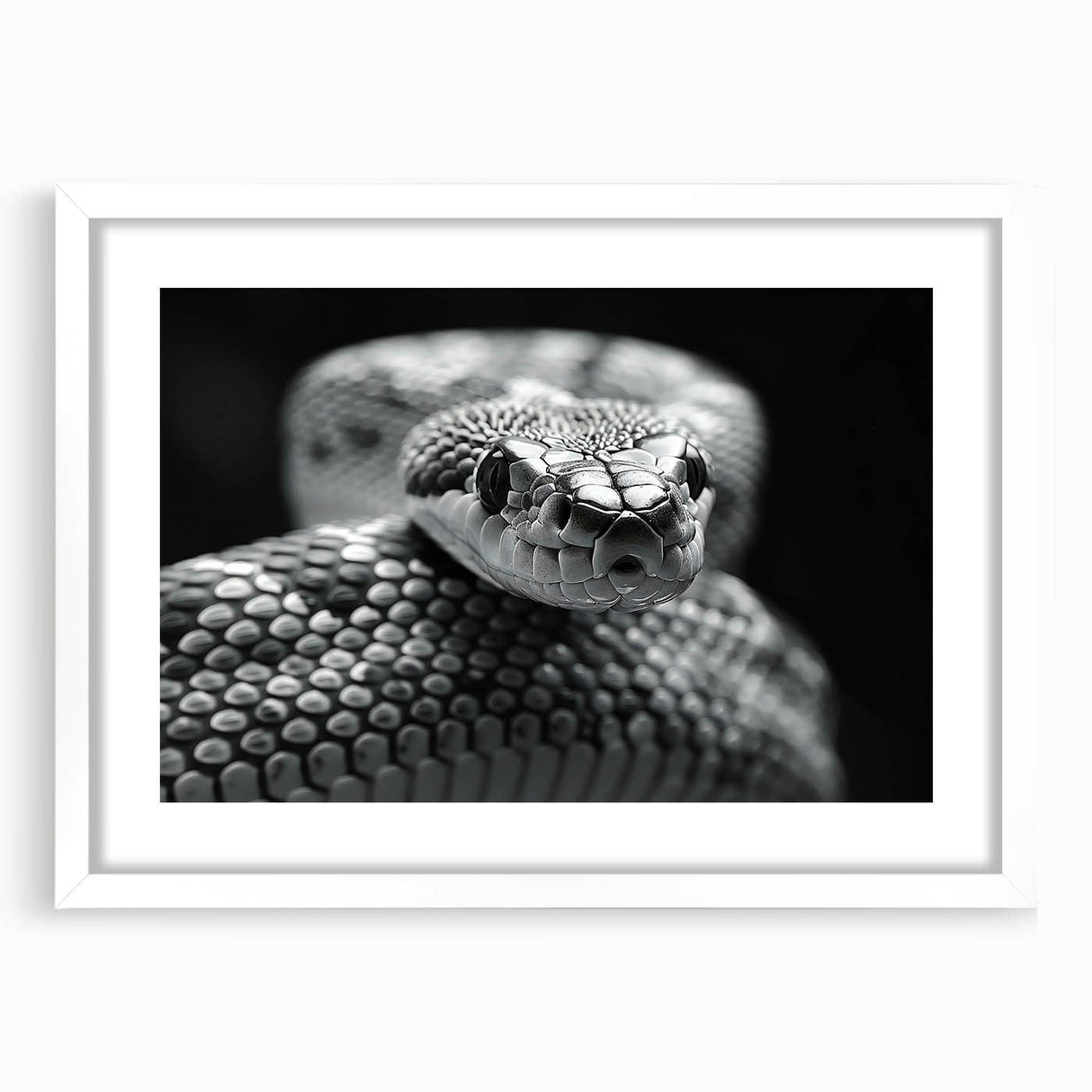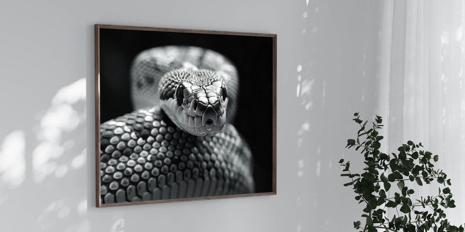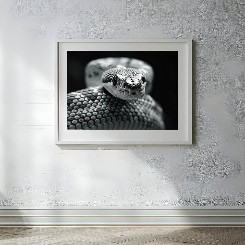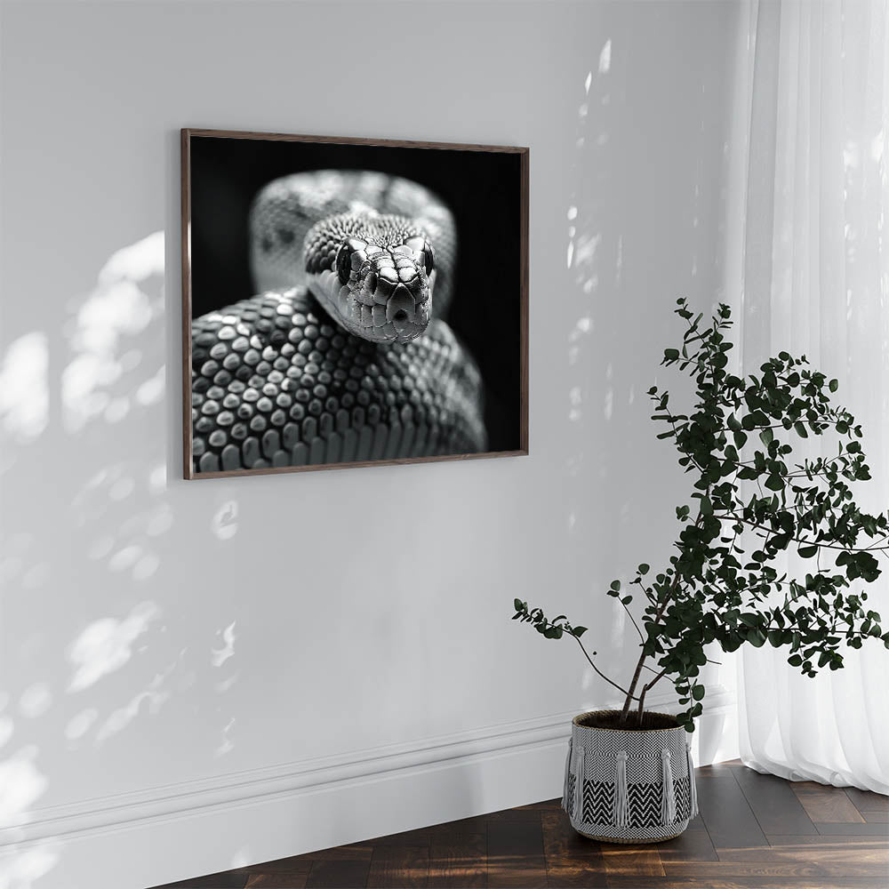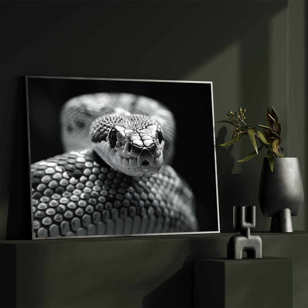 Enhance your space with the Monochrome Snake Wall Art, a striking piece that captures the captivating allure of a snake in stunning black and white. This artwork features a detailed close-up of a serpent, highlighting the intricate texture of its scales and the intensity of its gaze. The monochrome color palette adds a modern and sophisticated touch, making it an ideal choice for minimalist and contemporary interiors.