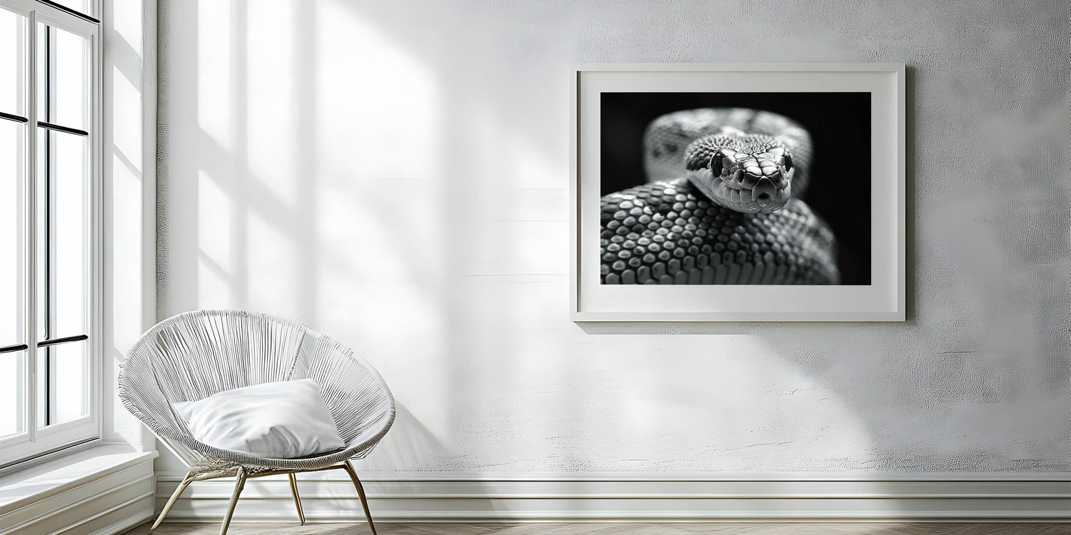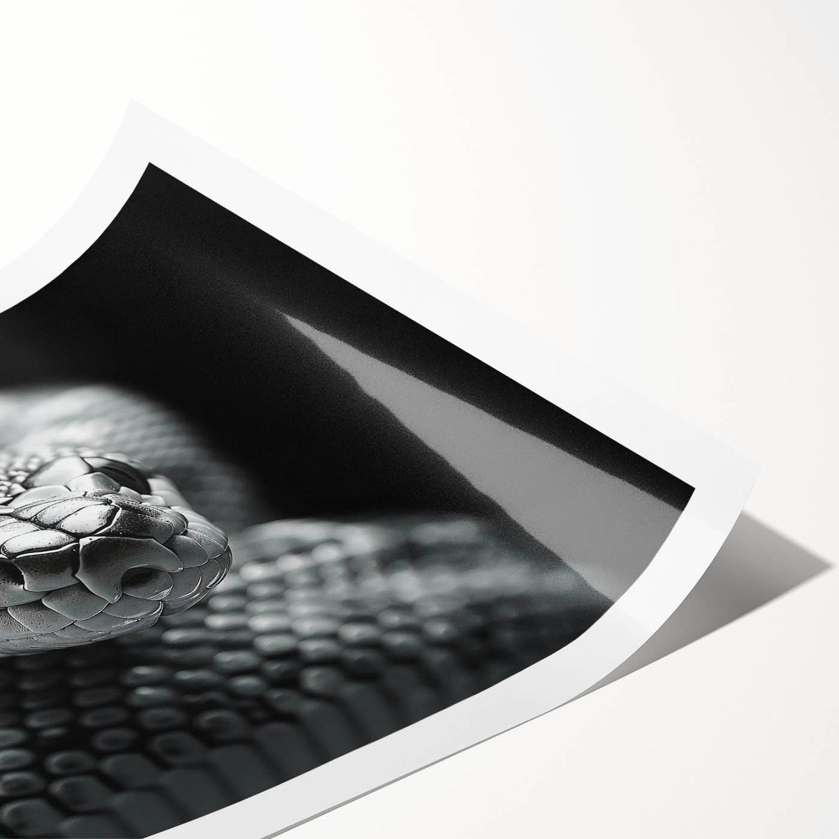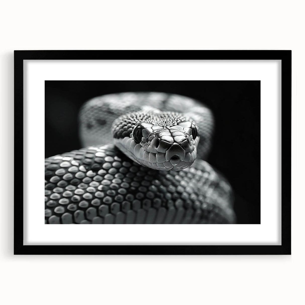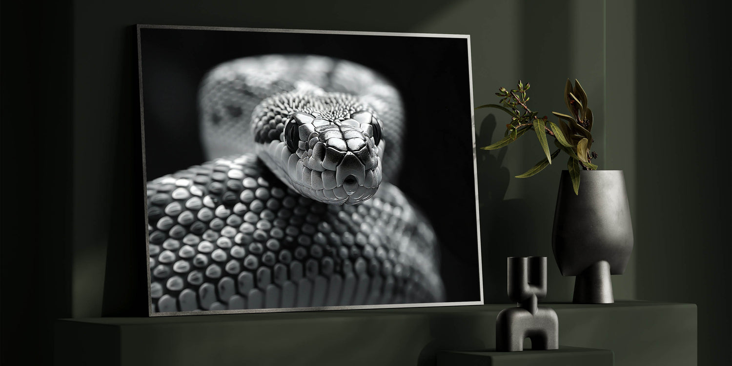 Enhance your space with the Monochrome Snake Wall Art, a striking piece that captures the captivating allure of a snake in stunning black and white. This artwork features a detailed close-up of a serpent, highlighting the intricate texture of its scales and the intensity of its gaze. The monochrome color palette adds a modern and sophisticated touch, making it an ideal choice for minimalist and contemporary interiors.