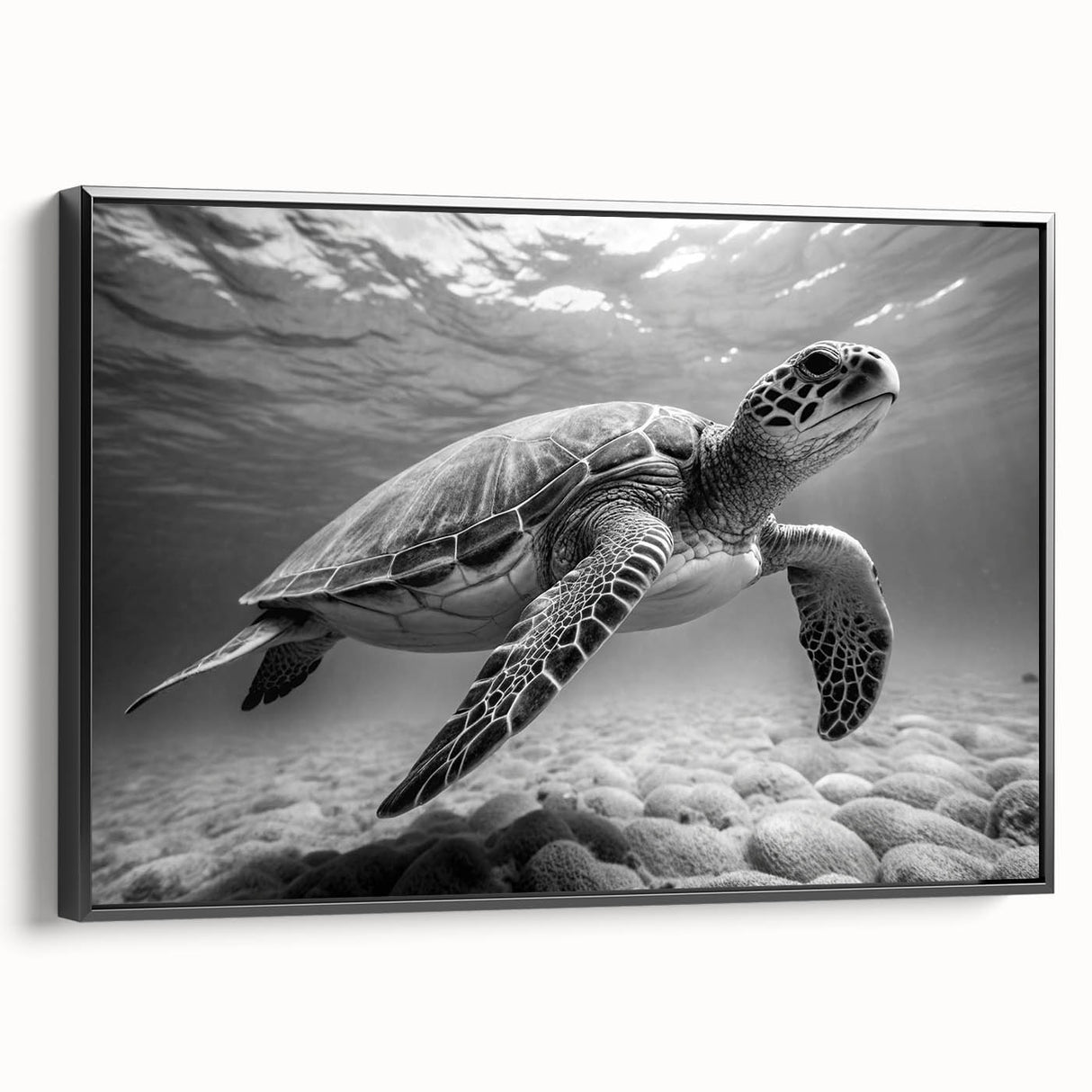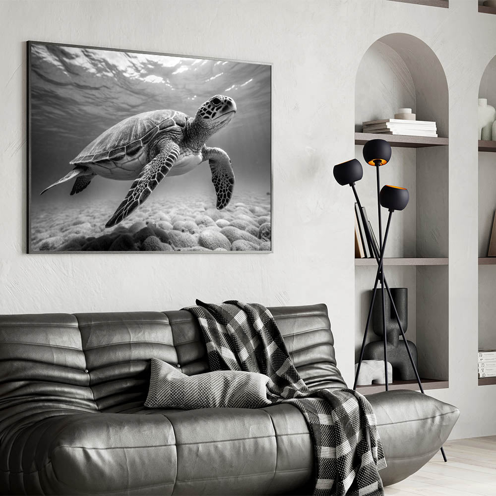 Bring the calm and beauty of the ocean into your home with this monochrome turtle artwork. Its understated elegance and serene subject matter make it a versatile piece that enhances any room, offering a tranquil glimpse into the underwater world.