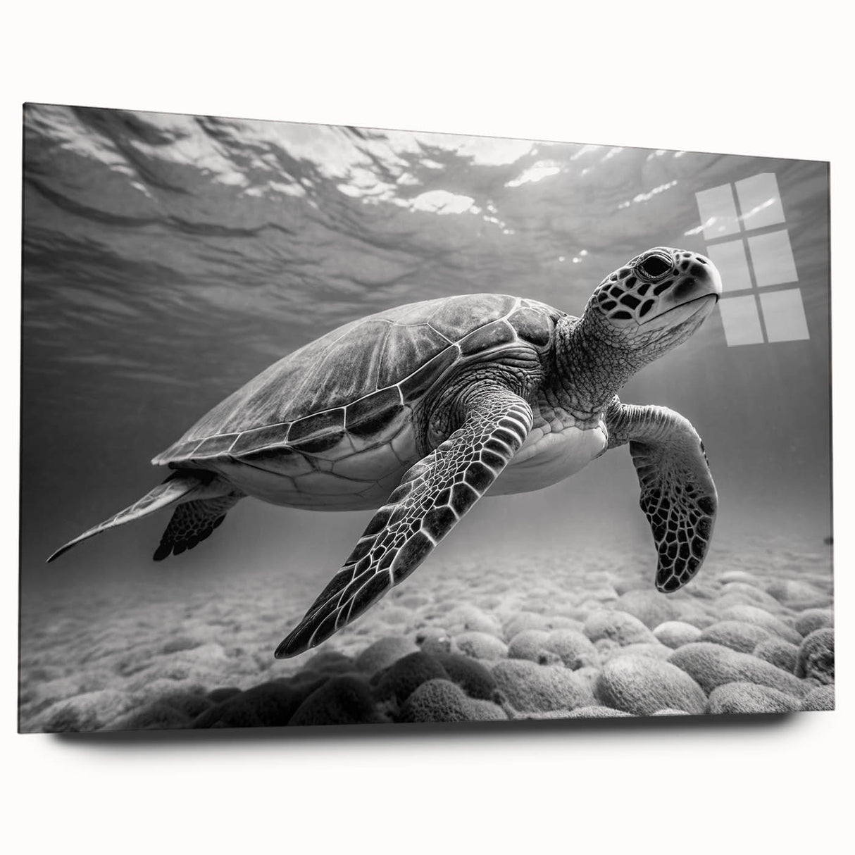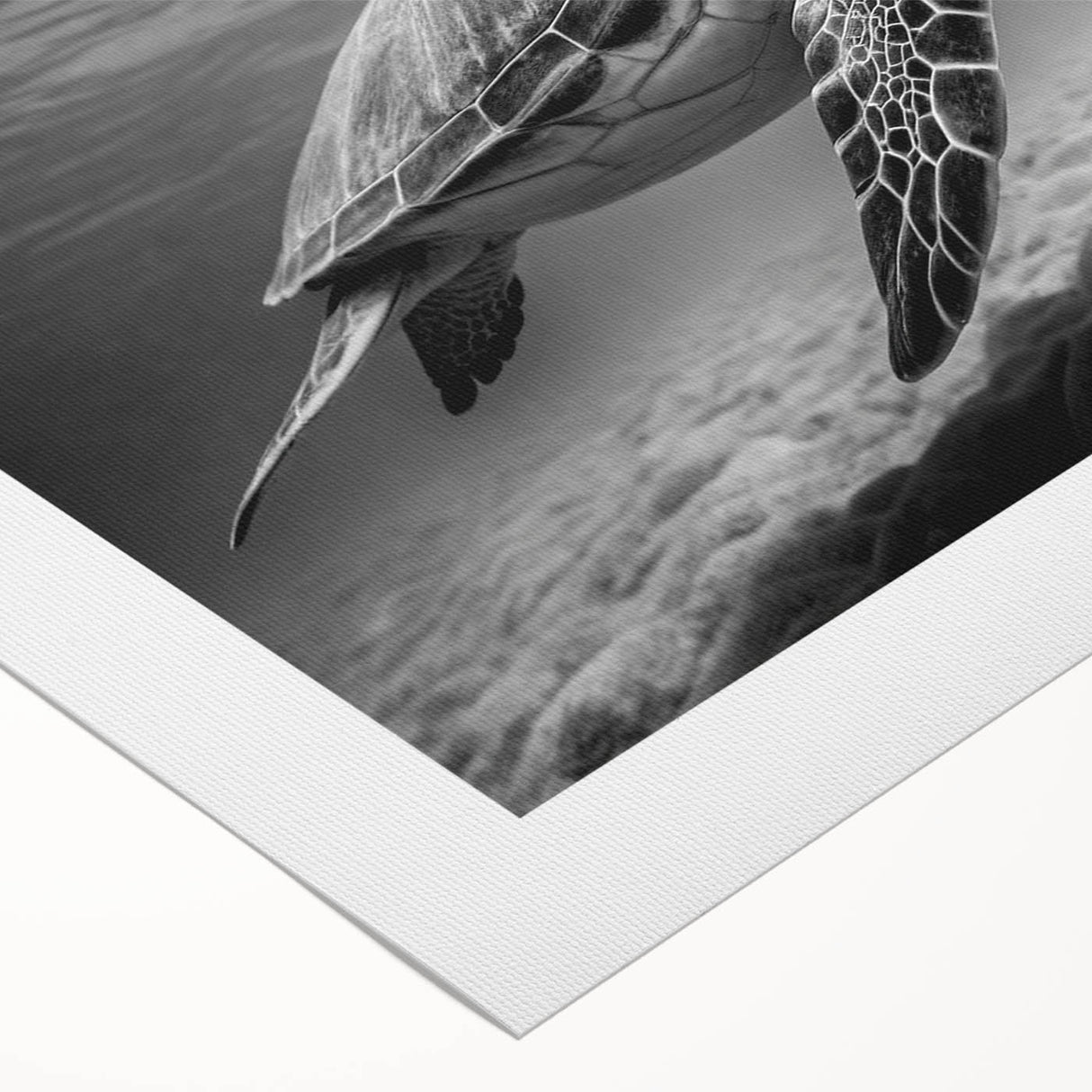 Experience the serene beauty of the deep sea with this monochrome turtle underwater art. Capturing a sea turtle gracefully swimming through the ocean, this black-and-white piece emphasizes the tranquility and elegance of marine life. The absence of color draws attention to the intricate textures and subtle contrasts within the image, making it a timeless addition to any space. Ideal for those who appreciate minimalist decor or the sophistication of monochrome art, this piece is available in various formats to match your decor preferences.