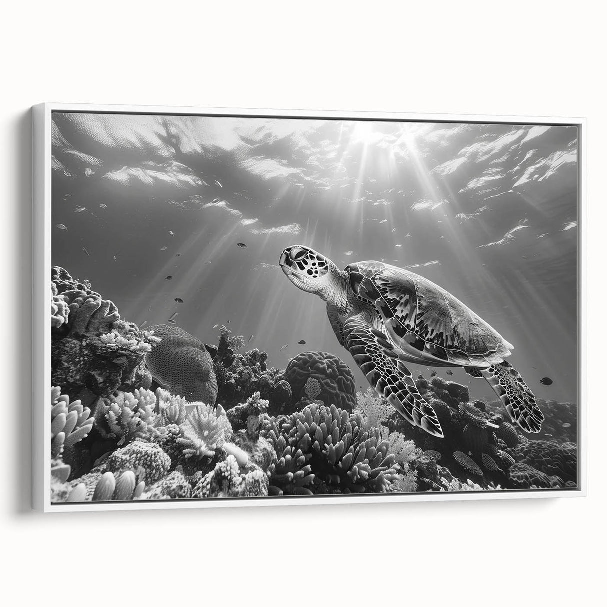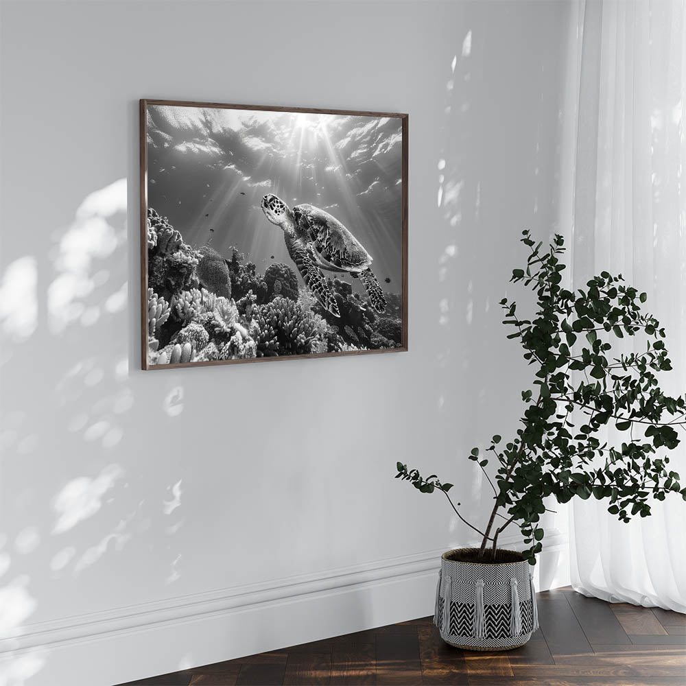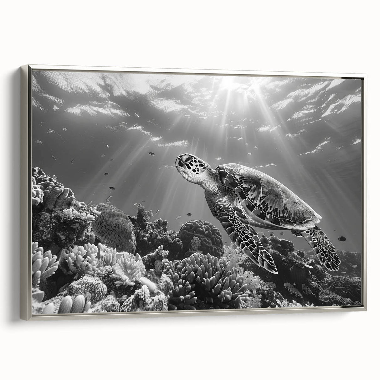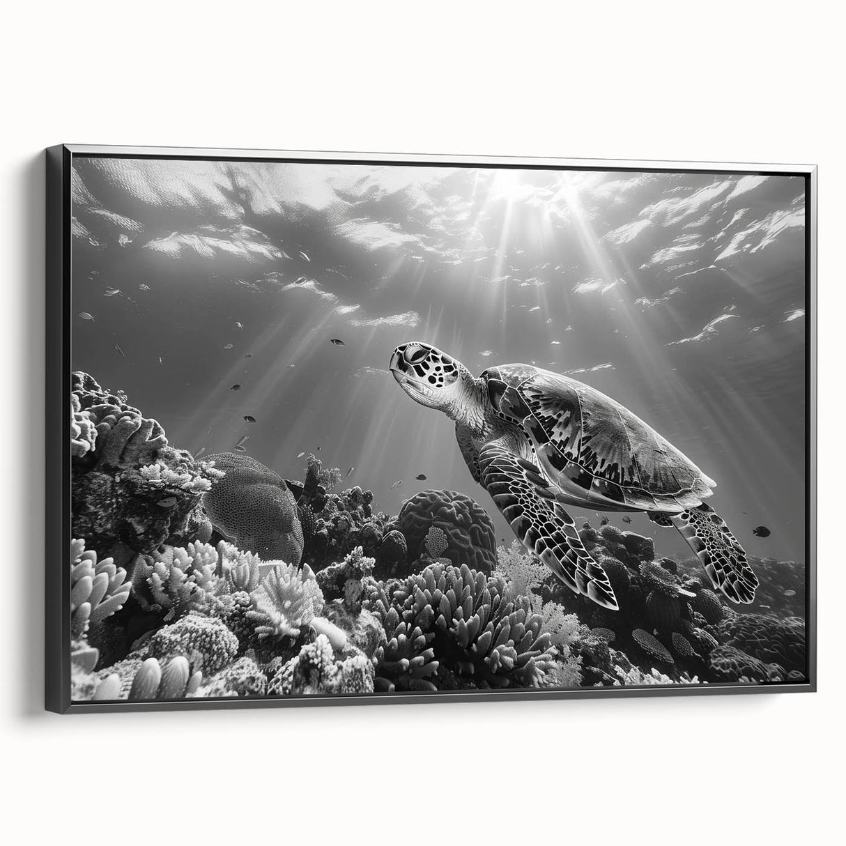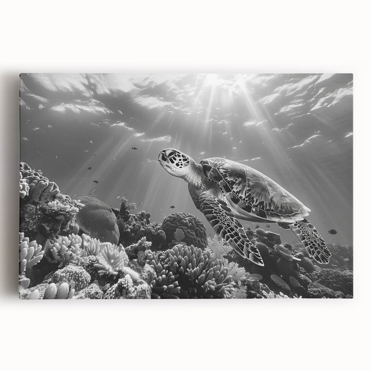 Elevate your space with this Monochrome Turtle Wall Art, a striking piece that combines the elegance of black and white photography with the serenity of marine life. This stunning canvas print captures a sea turtle gracefully swimming through an underwater world, bathed in soft rays of sunlight. Perfect for modern and minimalist decor, this artwork adds a sophisticated and tranquil touch to any room.