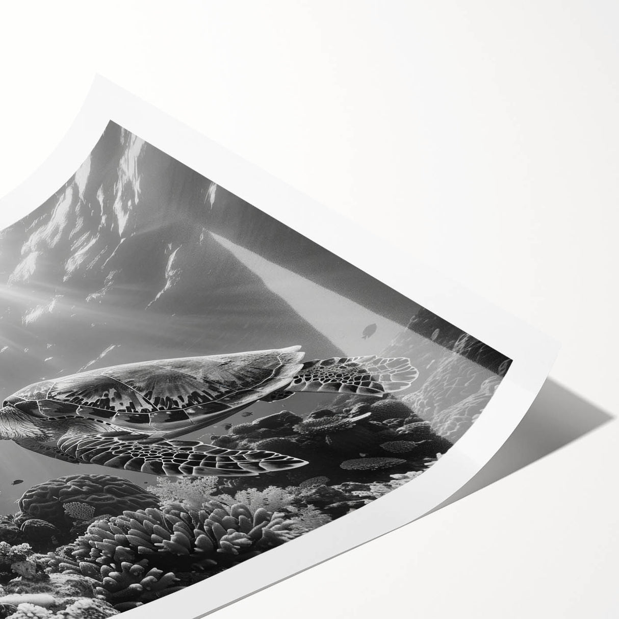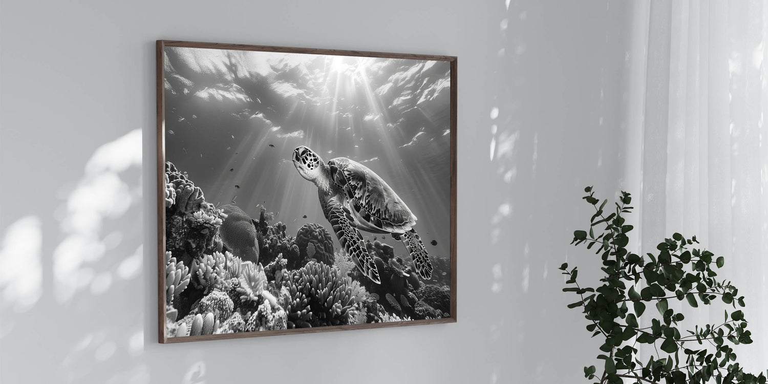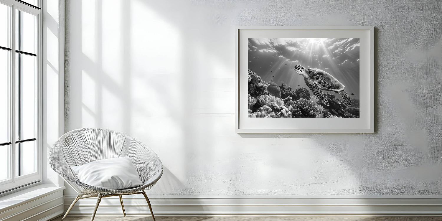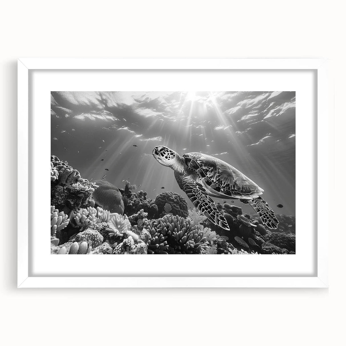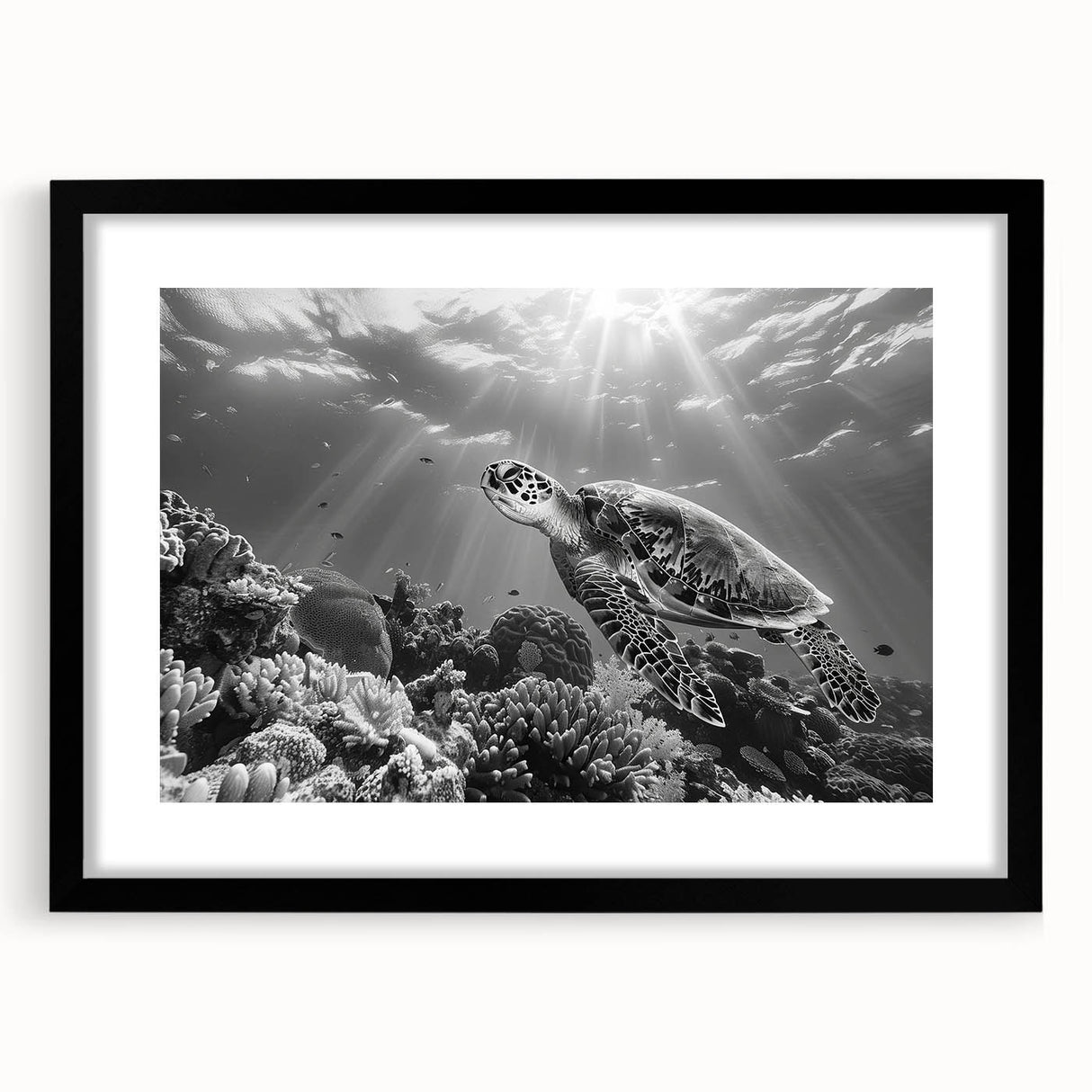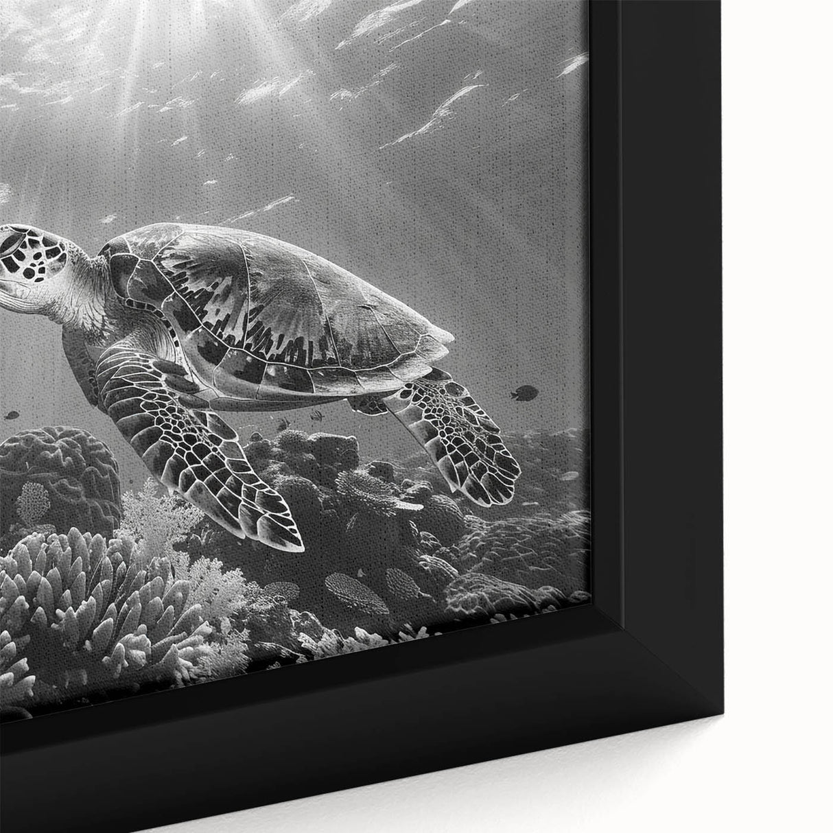 Elevate your space with this Monochrome Turtle Wall Art, a striking piece that combines the elegance of black and white photography with the serenity of marine life. This stunning canvas print captures a sea turtle gracefully swimming through an underwater world, bathed in soft rays of sunlight. Perfect for modern and minimalist decor, this artwork adds a sophisticated and tranquil touch to any room.
