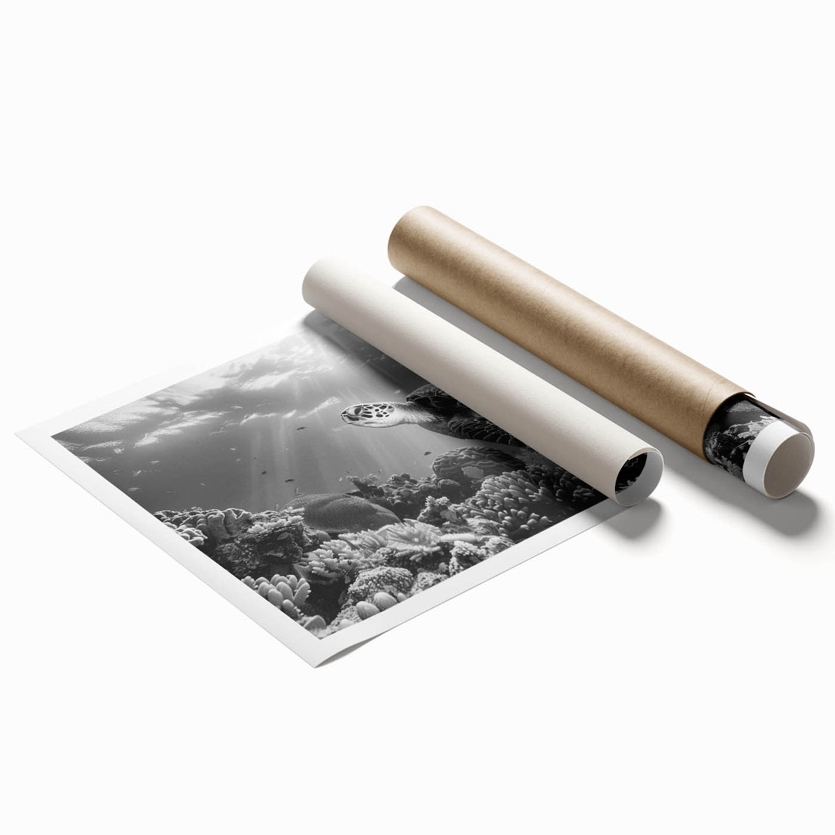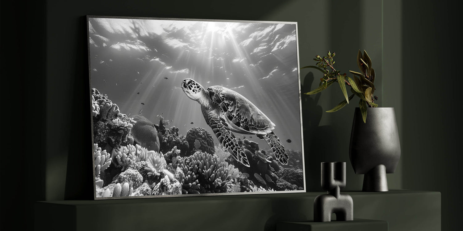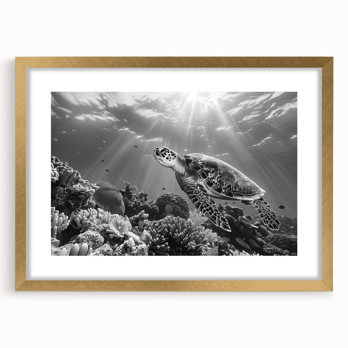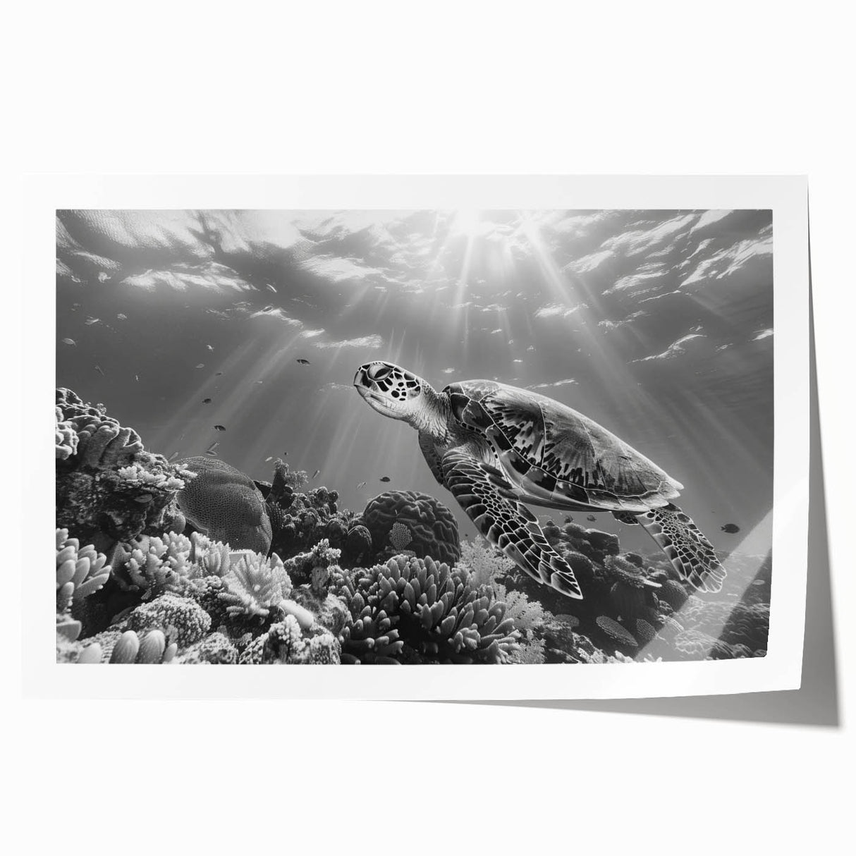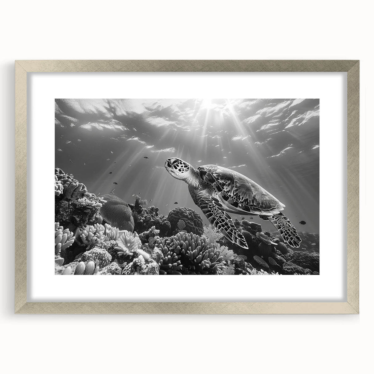 Elevate your space with this Monochrome Turtle Wall Art, a striking piece that combines the elegance of black and white photography with the serenity of marine life. This stunning canvas print captures a sea turtle gracefully swimming through an underwater world, bathed in soft rays of sunlight. Perfect for modern and minimalist decor, this artwork adds a sophisticated and tranquil touch to any room.