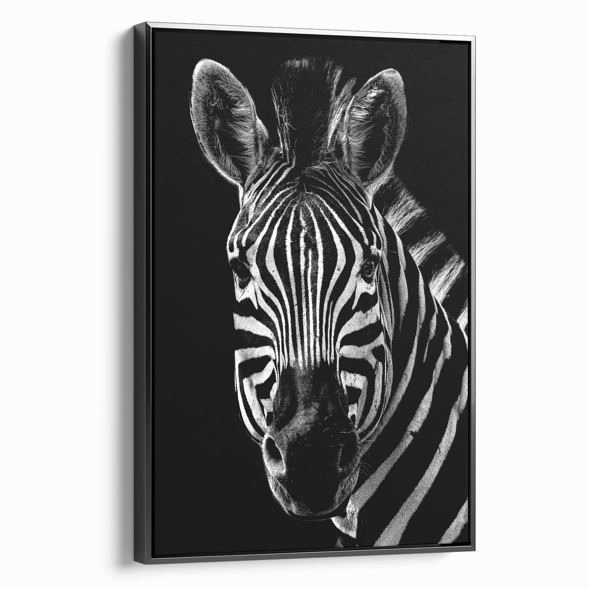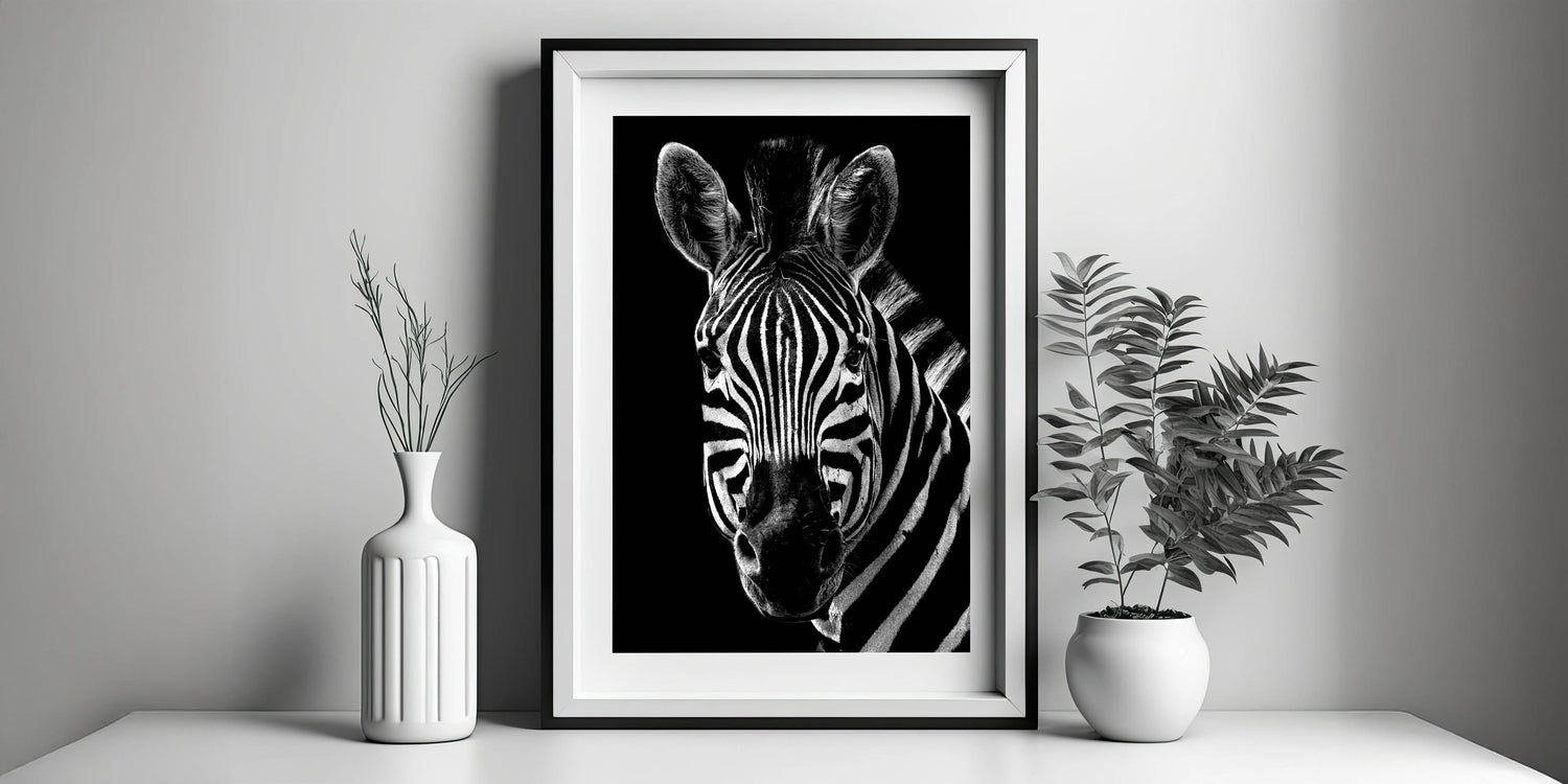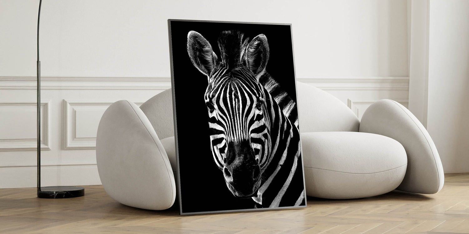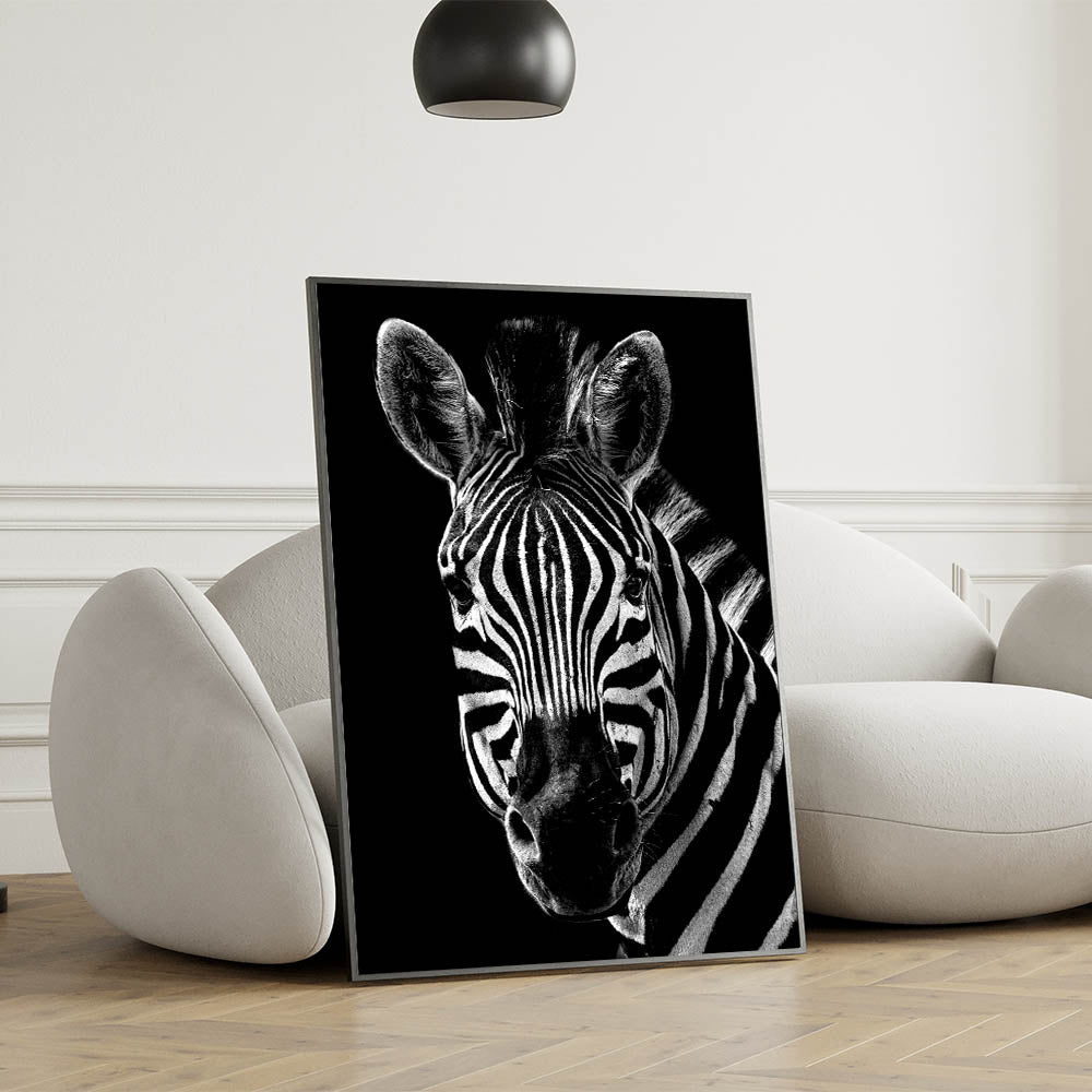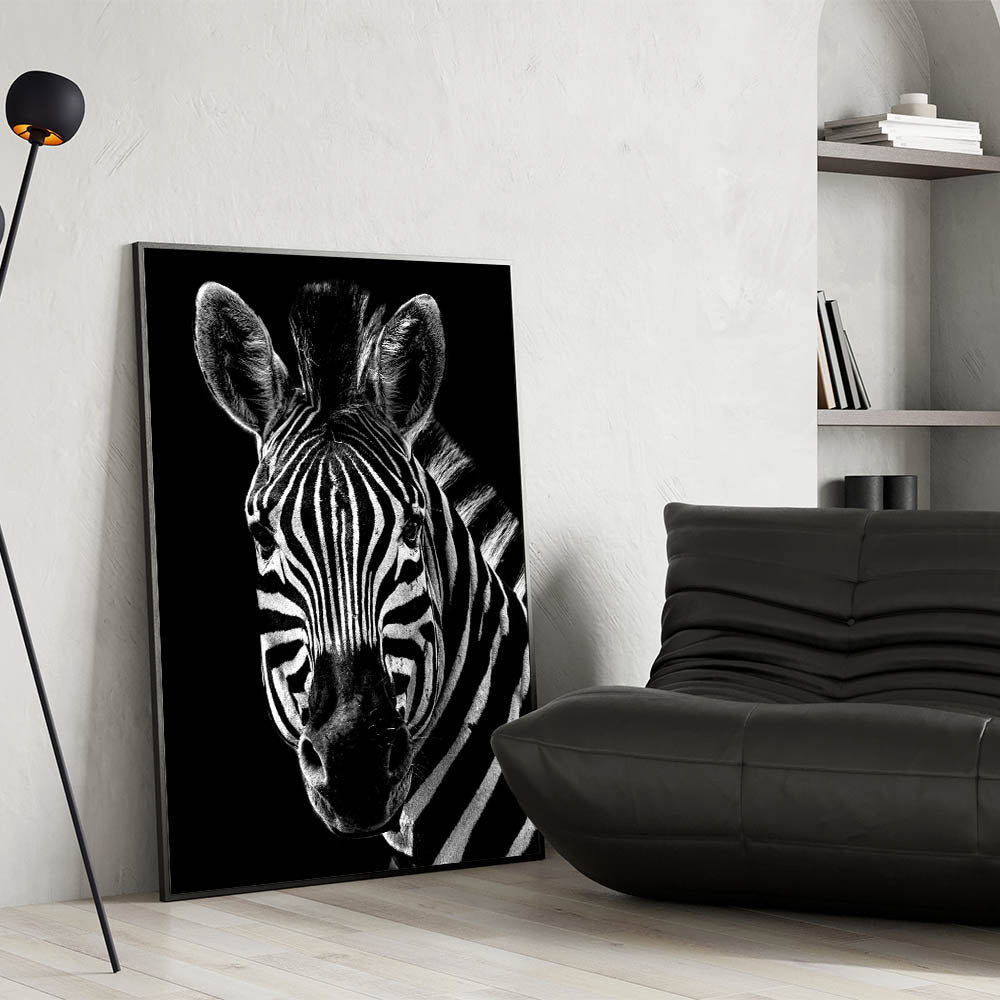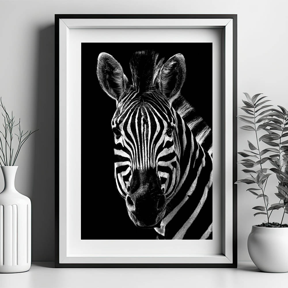 - Bold Design: High-contrast black and white zebra portrait, ideal for contemporary spaces.