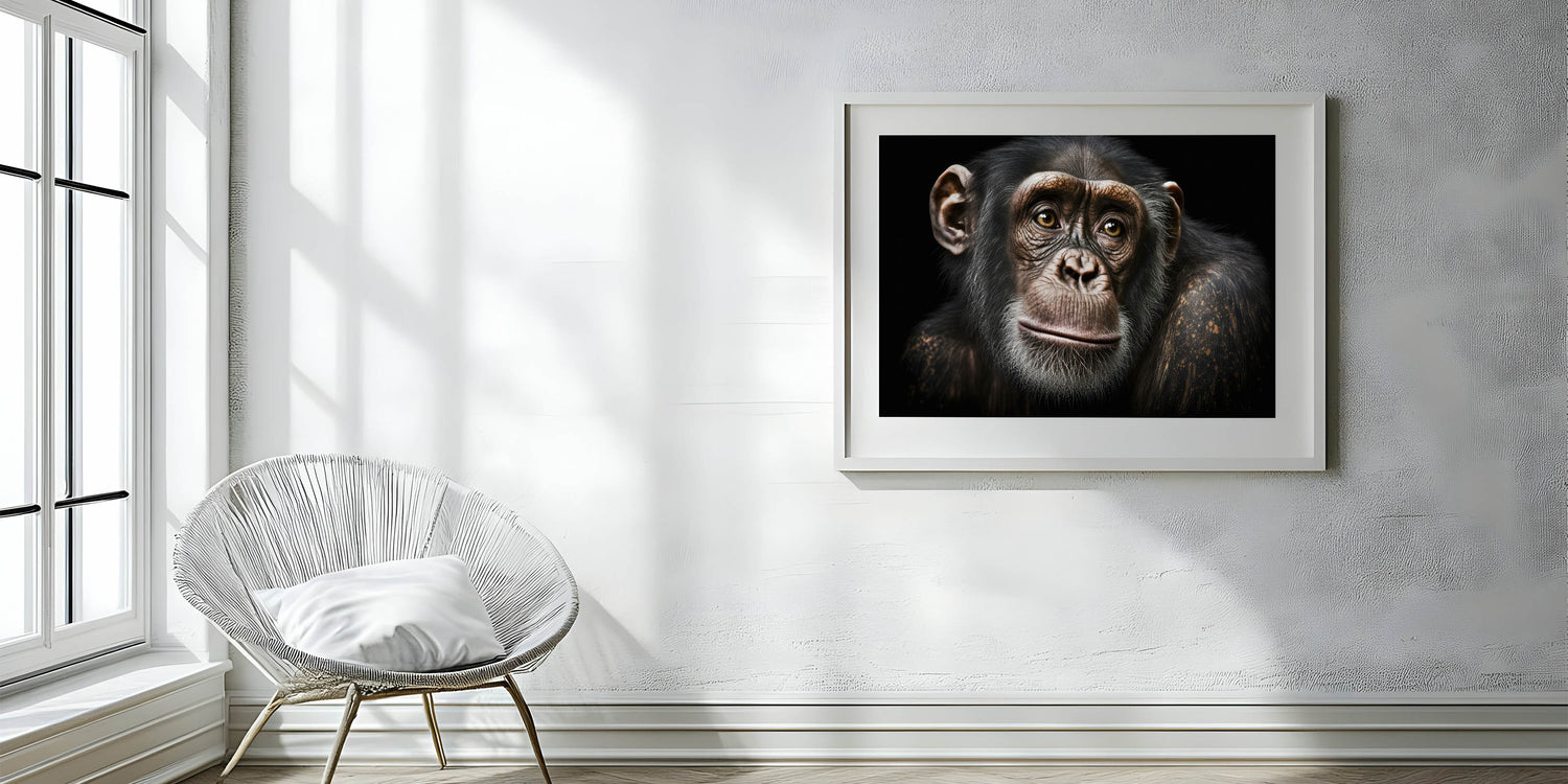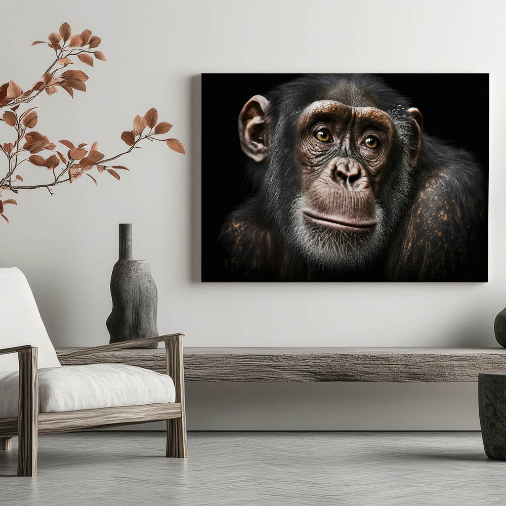 Elevate your interior decor with this stunning portrait of a chimpanzee, capturing the depth and intelligence in the eyes of one of nature’s most fascinating creatures. This highly detailed close-up photograph is perfect for animal lovers, wildlife enthusiasts, or anyone looking to add a unique touch to their living space. The rich textures and intricate details of the chimpanzee's face are brought to life in this exquisite piece, making it a focal point in any room.