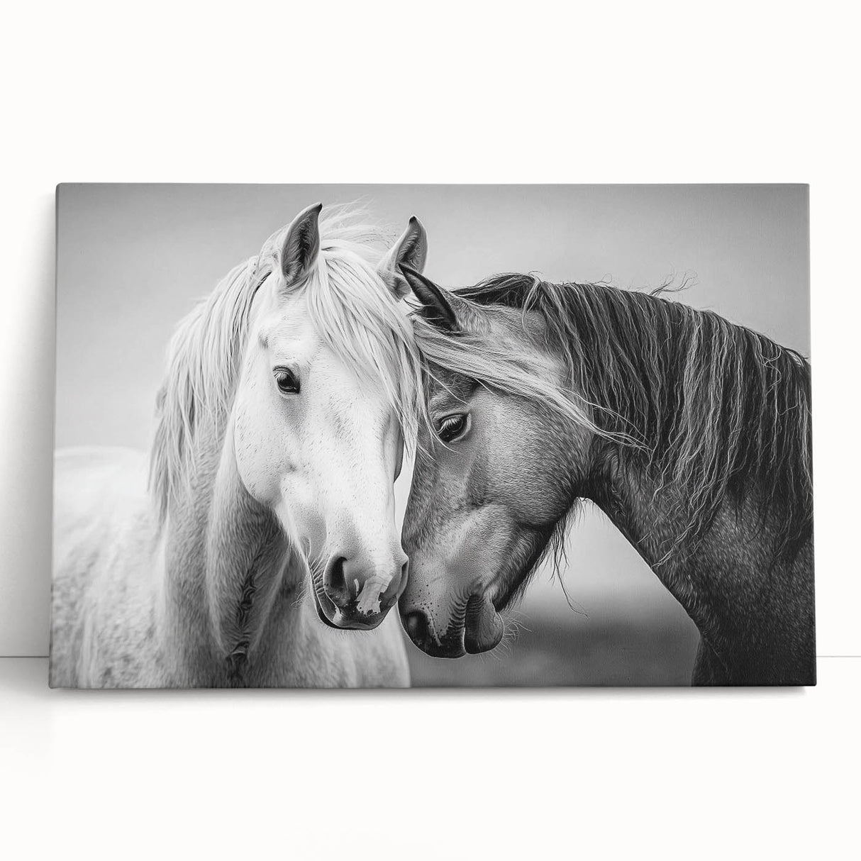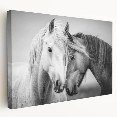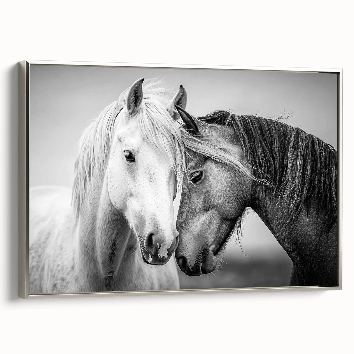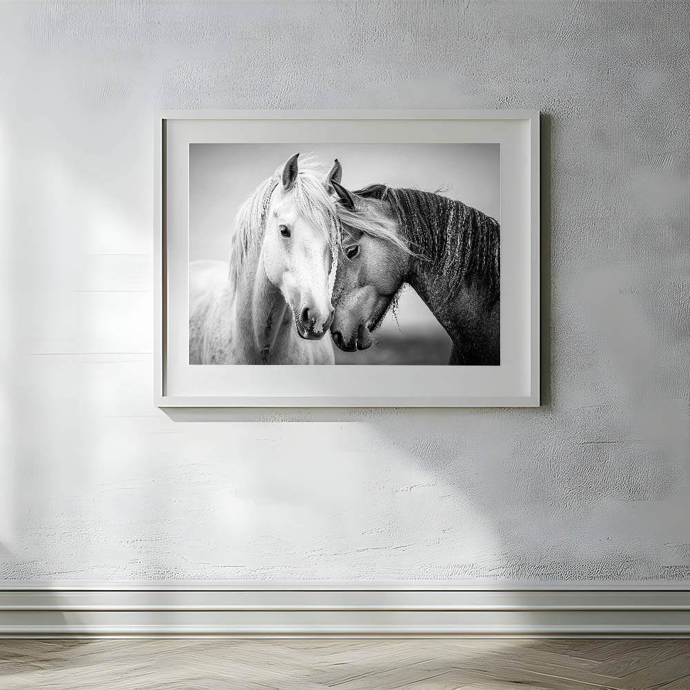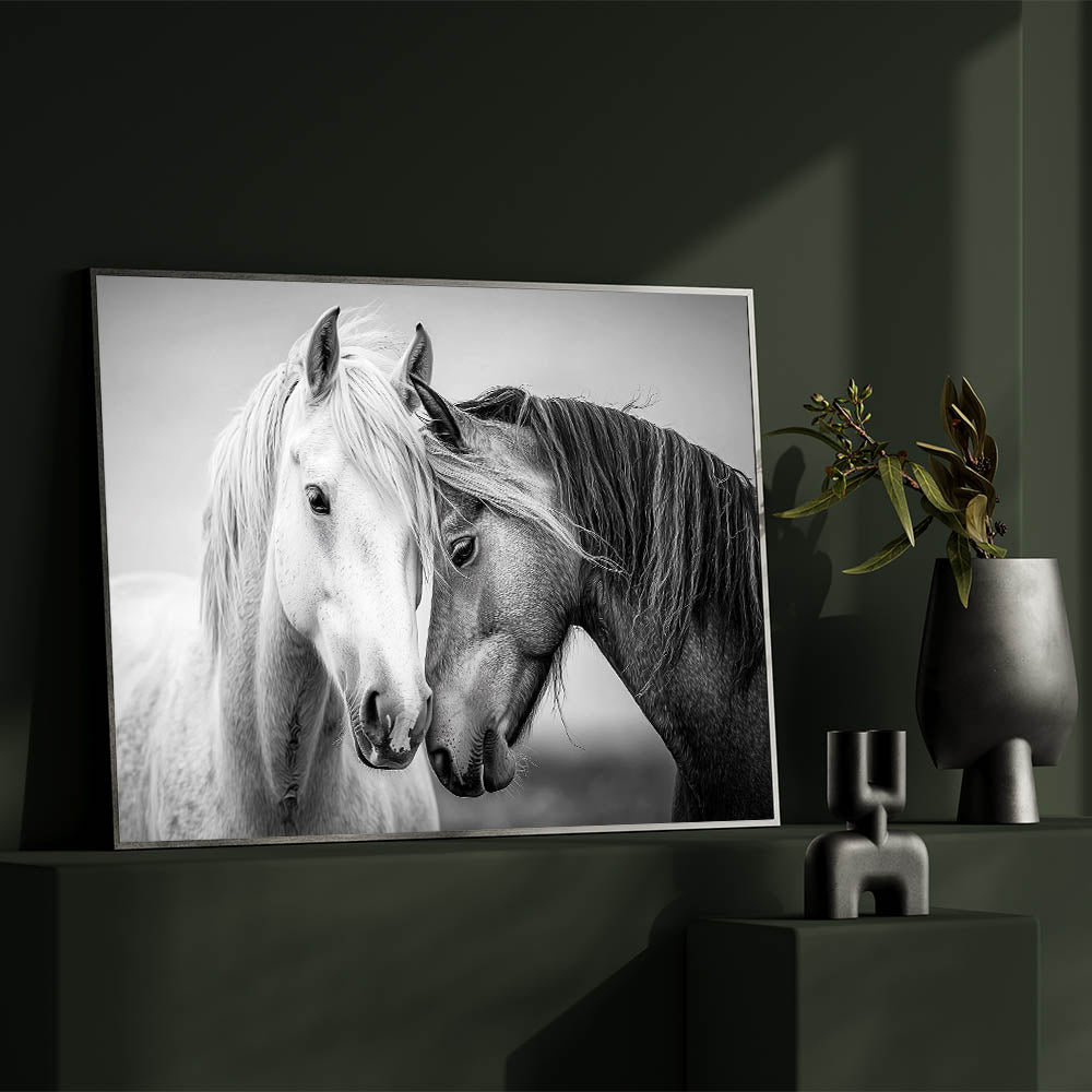Capture the beauty of emotion and grace with this stunning black and white horse photography artwork. Featuring two horses in a tender and affectionate moment, this piece radiates a sense of connection and tranquility. The monochrome tones emphasize the intricate details of the horses' manes and expressions, making this a powerful and elegant centerpiece for any room. Perfect for animal lovers and fans of minimalist decor, this art adds timeless charm to your space.