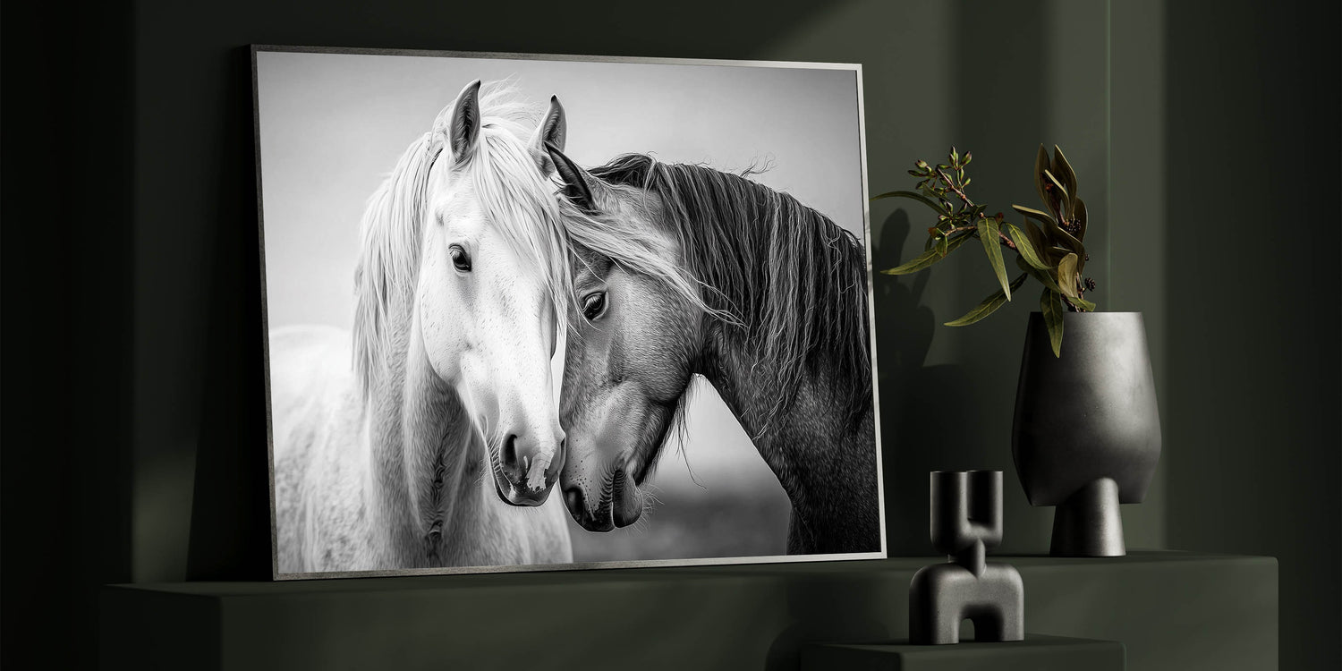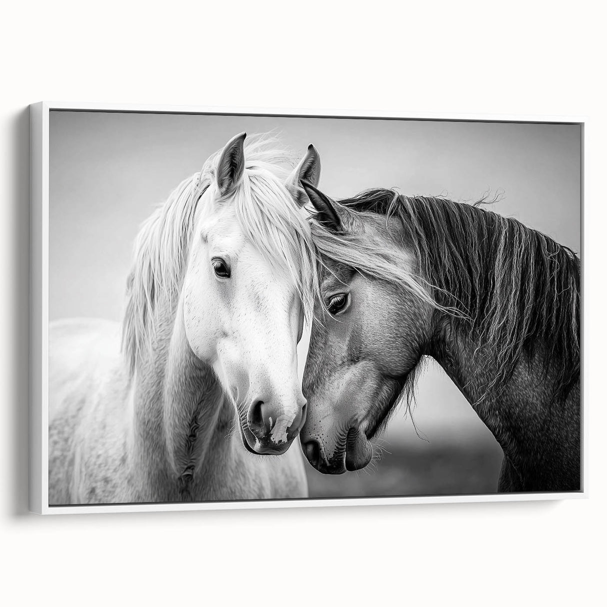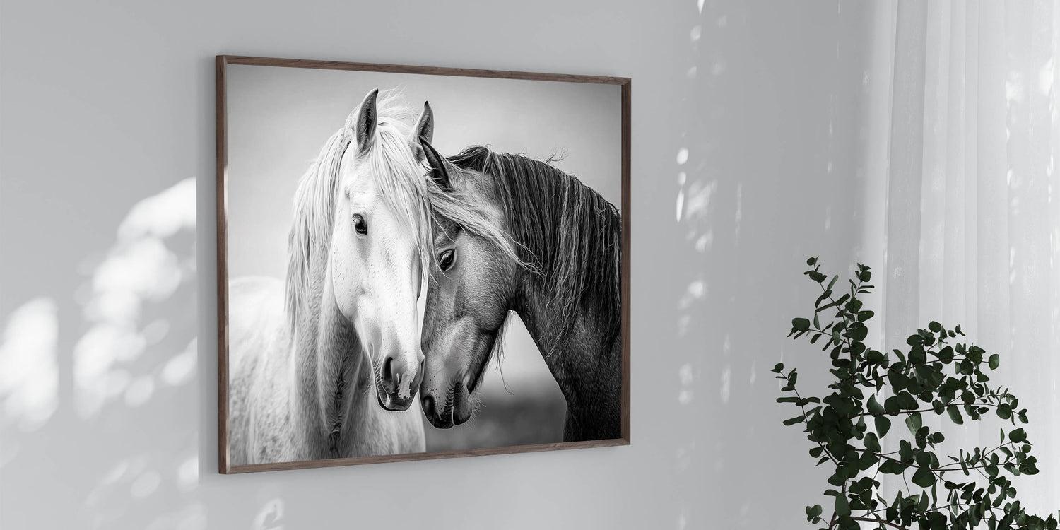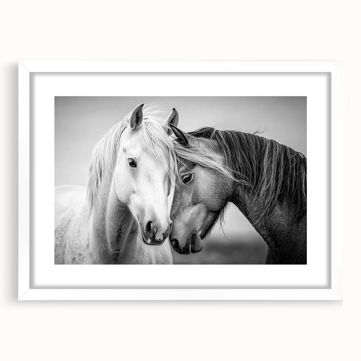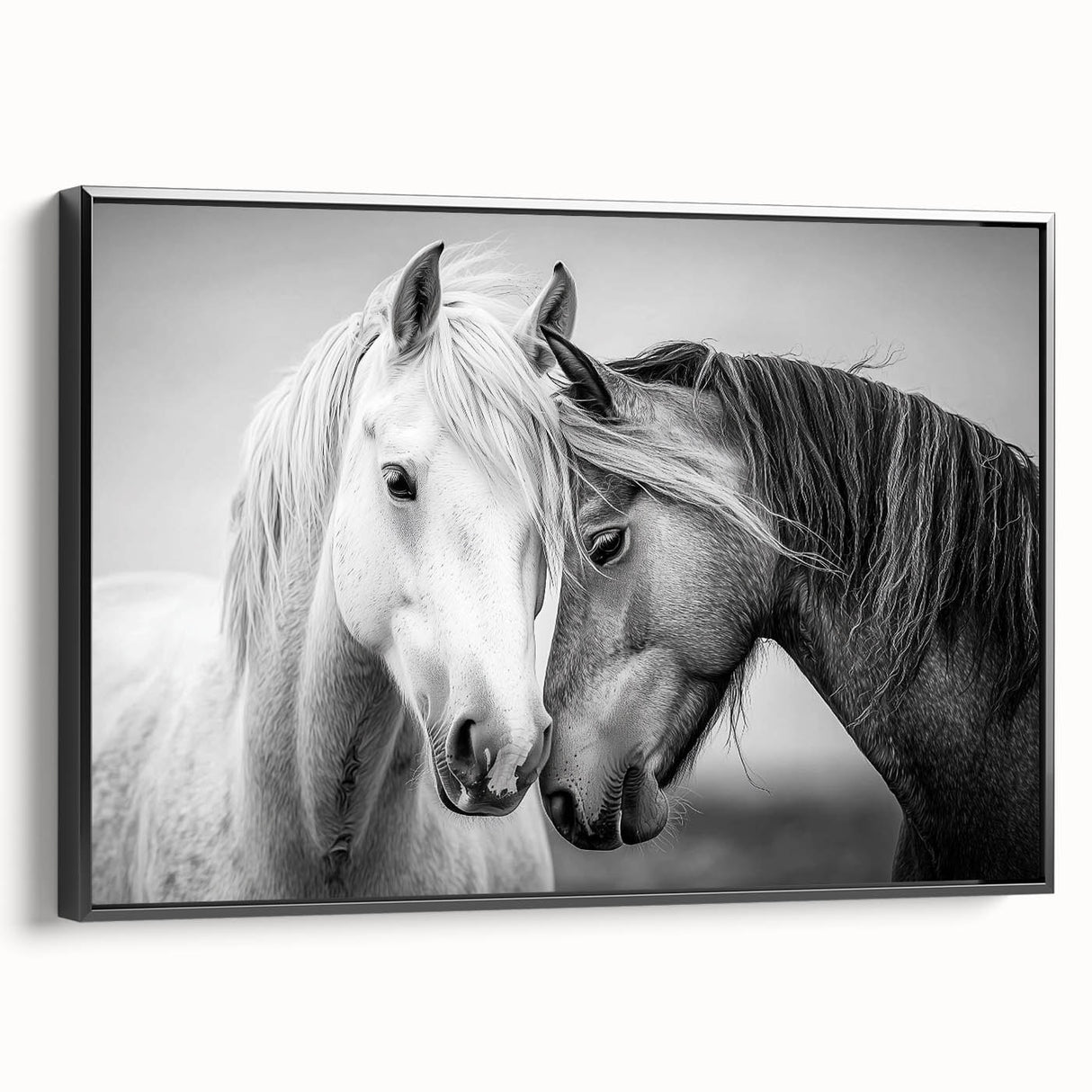 Capture the beauty of emotion and grace with this stunning black and white horse photography artwork. Featuring two horses in a tender and affectionate moment, this piece radiates a sense of connection and tranquility. The monochrome tones emphasize the intricate details of the horses' manes and expressions, making this a powerful and elegant centerpiece for any room. Perfect for animal lovers and fans of minimalist decor, this art adds timeless charm to your space.