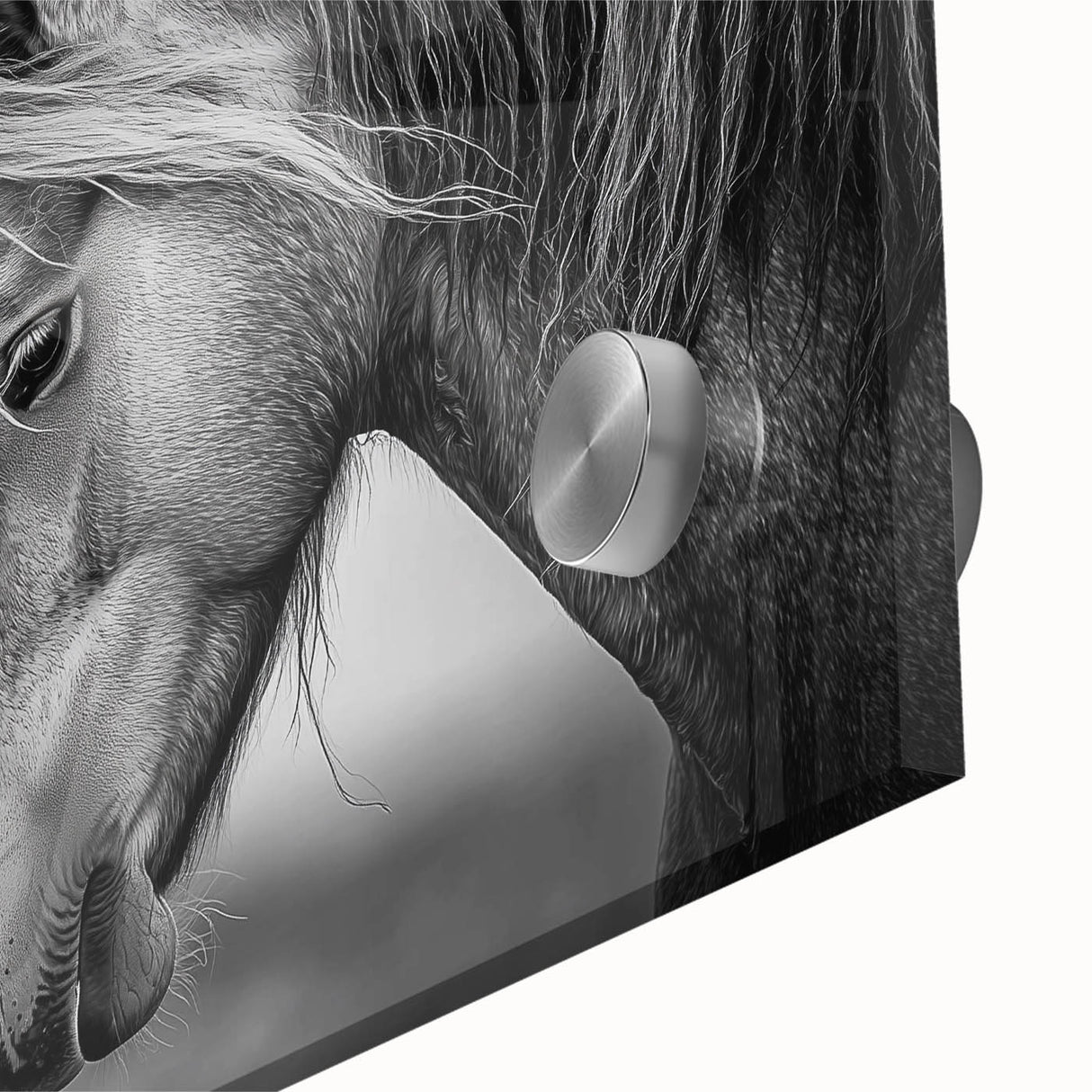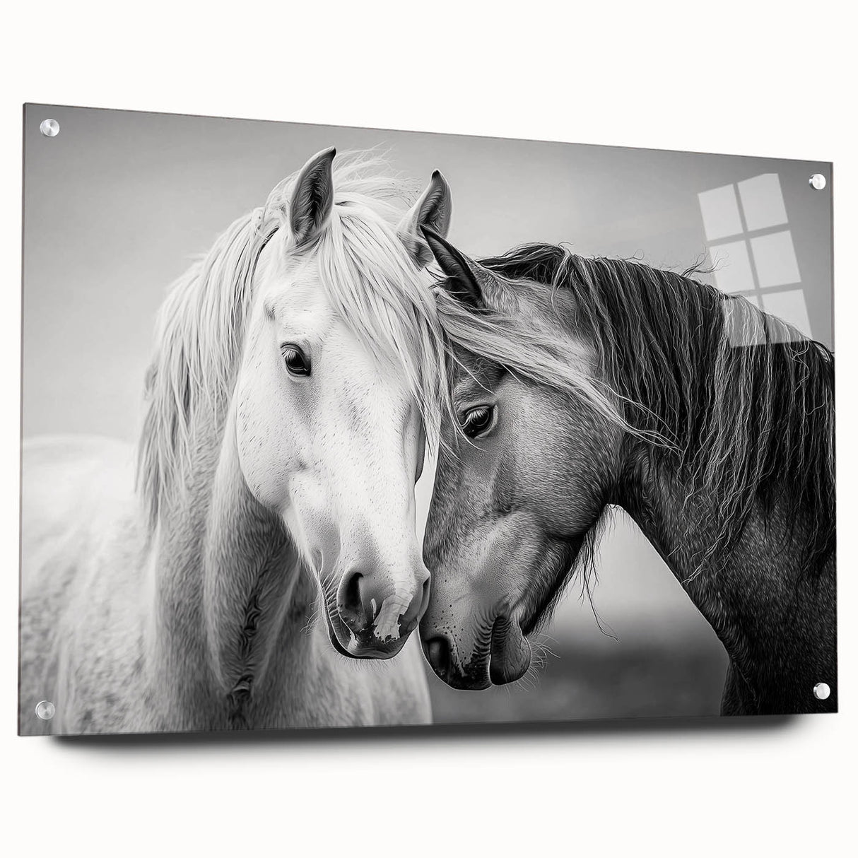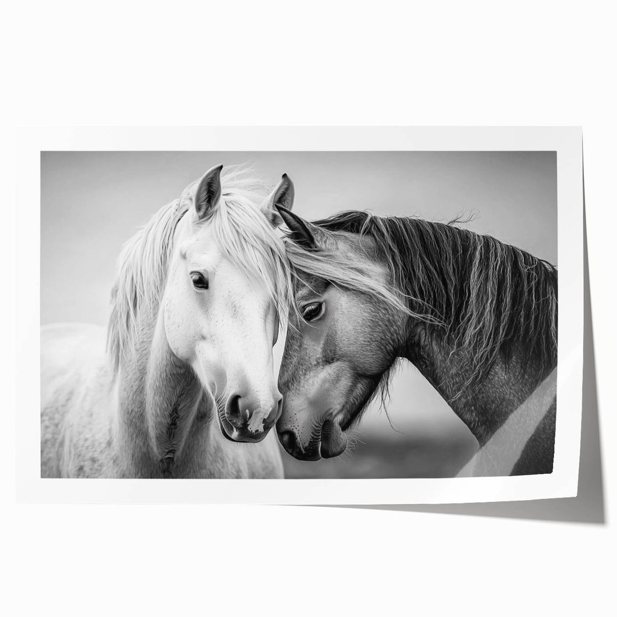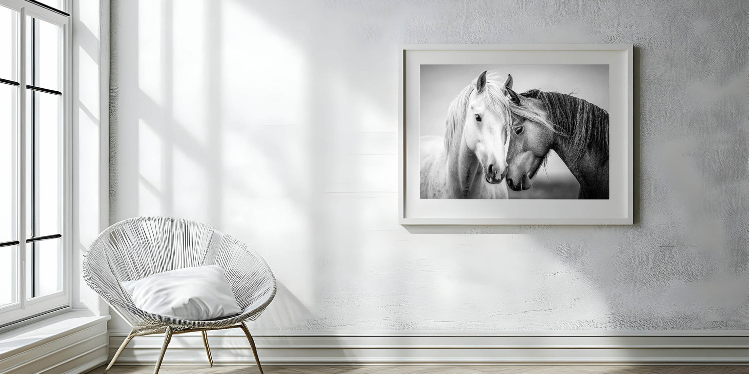Capture the beauty of emotion and grace with this stunning black and white horse photography artwork. Featuring two horses in a tender and affectionate moment, this piece radiates a sense of connection and tranquility. The monochrome tones emphasize the intricate details of the horses' manes and expressions, making this a powerful and elegant centerpiece for any room. Perfect for animal lovers and fans of minimalist decor, this art adds timeless charm to your space.