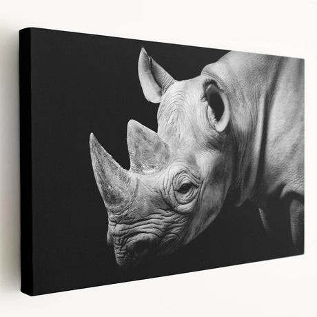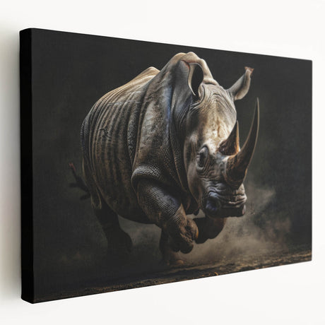 • Stretched canvas wall art featuring a side view of a majestic rhinoceros, showcasing intricate details and natural colors, perfect for wildlife enthusiasts and home decor.