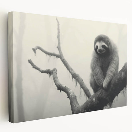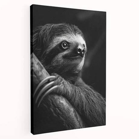 • Sloth-themed wall art printed on stretched canvas, showcasing a vivid design with a side view of a sloth hanging from a branch, perfect for animal lovers' decor.