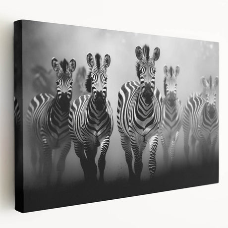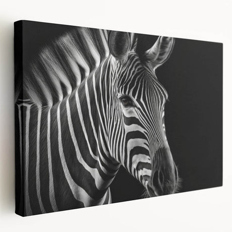 • Stretched canvas wall art featuring a striking zebra design in a side view, highlighting its bold black and white stripes, perfect for animal lovers and home decor enthusiasts.