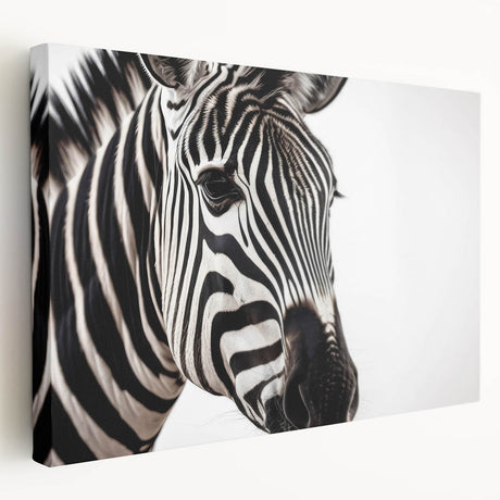 • Side view of a stretched canvas wall art featuring a striking zebra design, showcasing intricate black and white stripes, ideal for wildlife-themed decor.