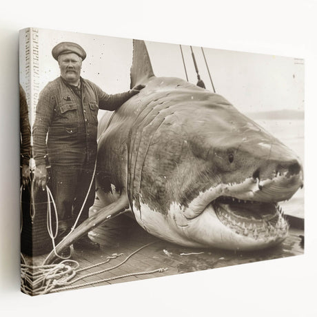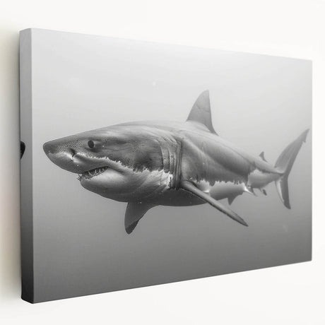 • Vibrant stretched canvas wall art showcasing a detailed shark design, featuring shades of blue and gray, ideal for marine-themed decor in homes or offices.