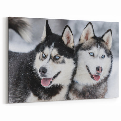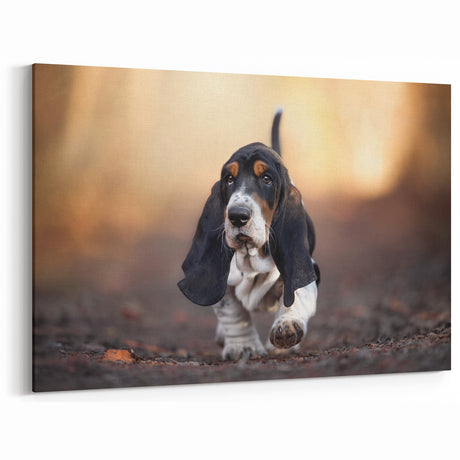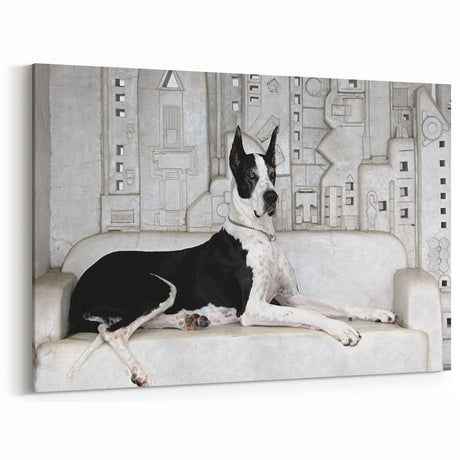 • Stretched canvas wall art featuring a colorful design of various dog breeds in a playful arrangement, perfect for pet lovers and home decor enthusiasts.
