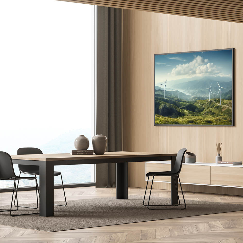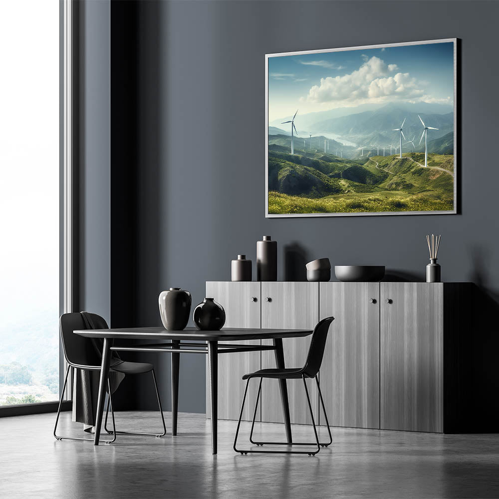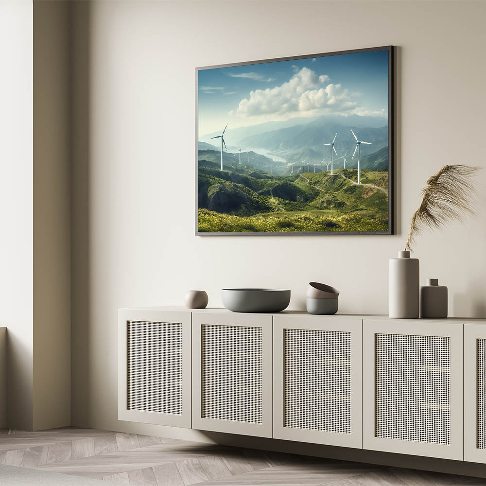 Experience the serene beauty of rolling hills and majestic windmills with this breathtaking wall art. This piece perfectly captures the harmony between nature and technology, making it a stunning addition to any space. The expansive landscape, with its rich green hills and towering windmills, invites a sense of calm and tranquility, ideal for transforming your living room, bedroom, or office into a peaceful retreat.