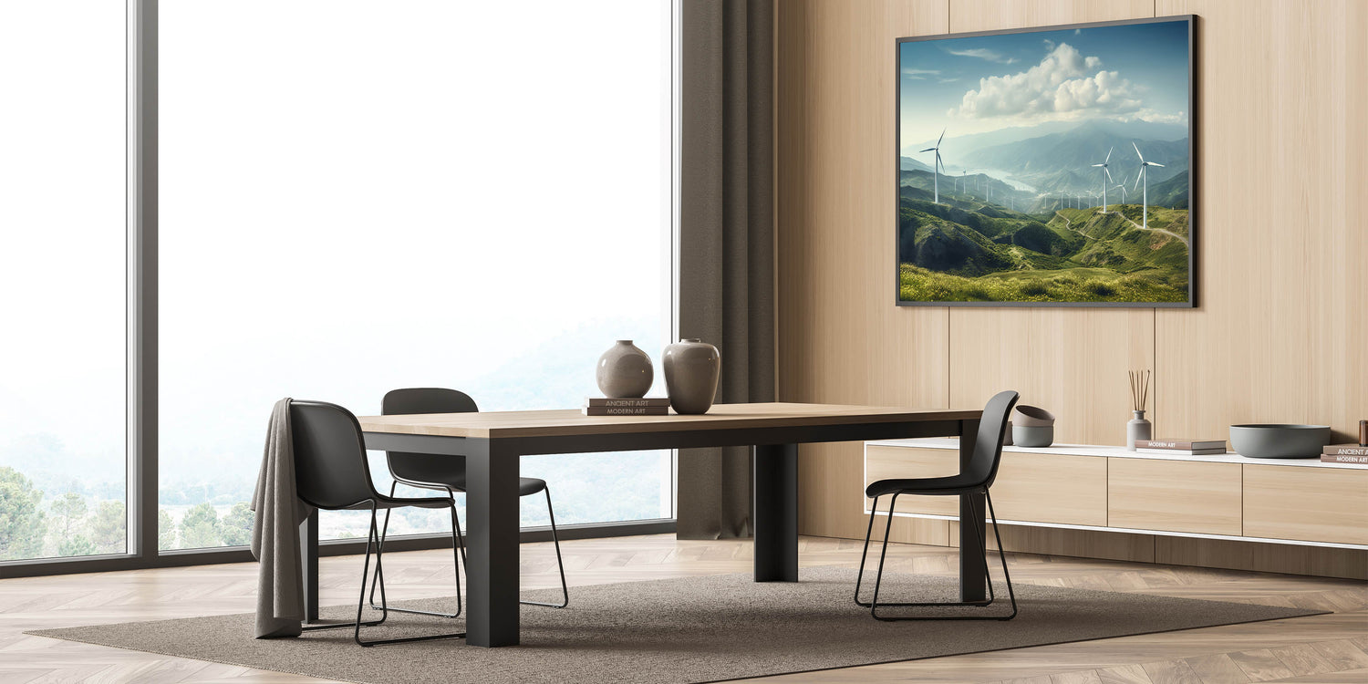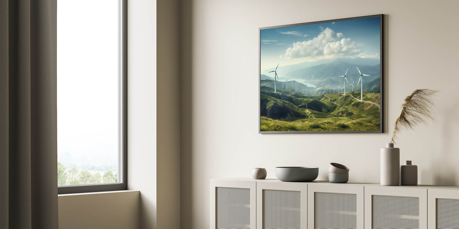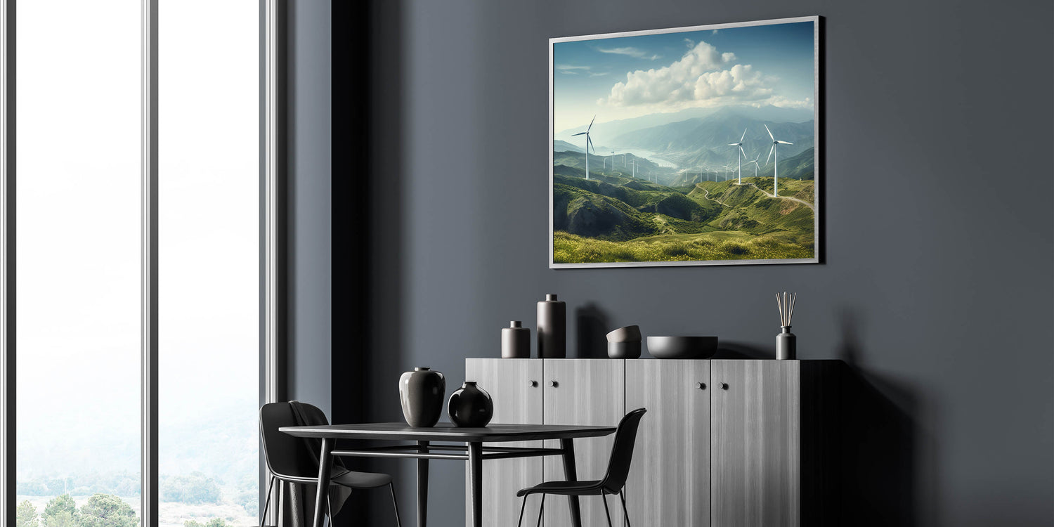 Experience the serene beauty of rolling hills and majestic windmills with this breathtaking wall art. This piece perfectly captures the harmony between nature and technology, making it a stunning addition to any space. The expansive landscape, with its rich green hills and towering windmills, invites a sense of calm and tranquility, ideal for transforming your living room, bedroom, or office into a peaceful retreat.