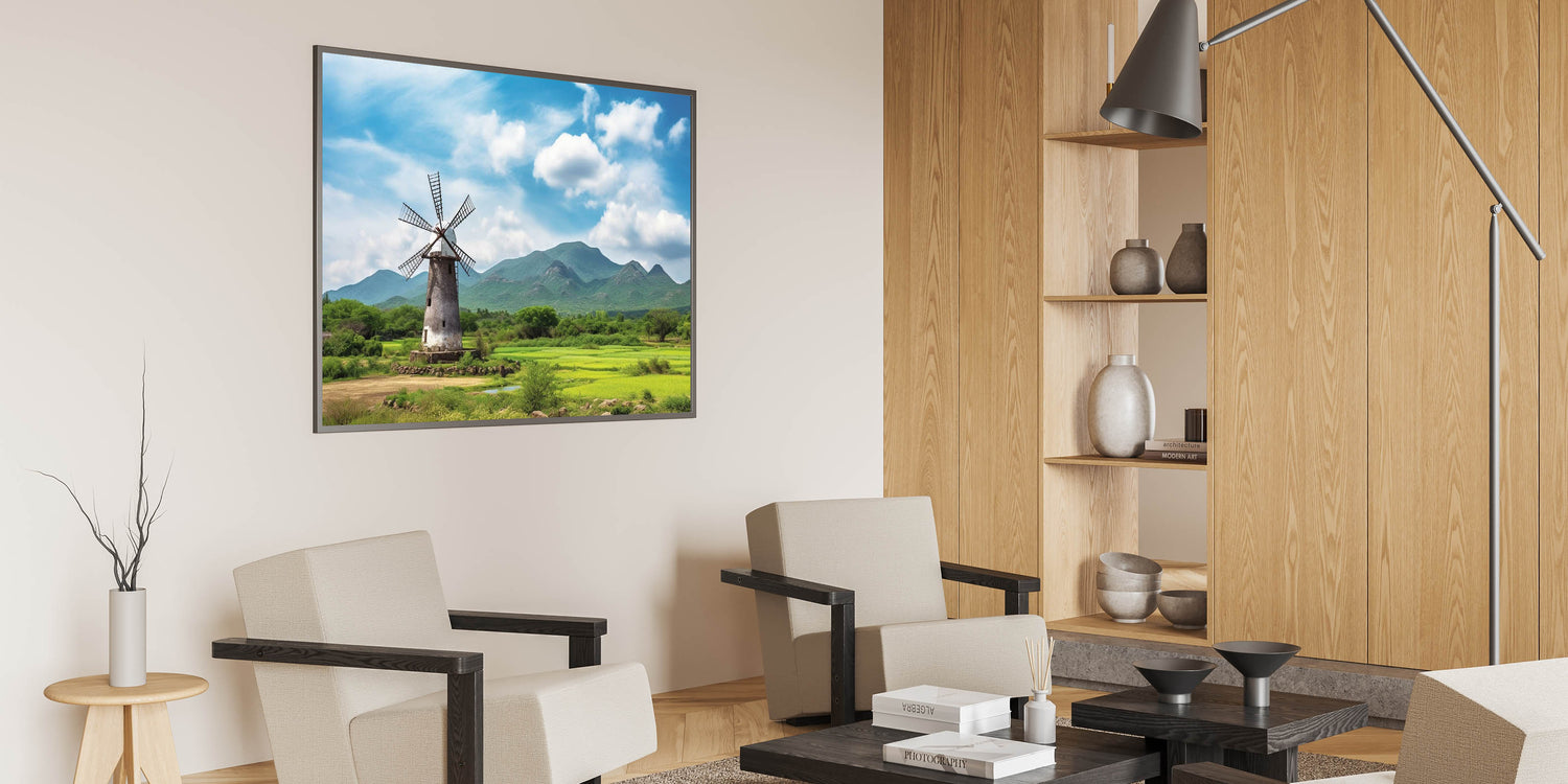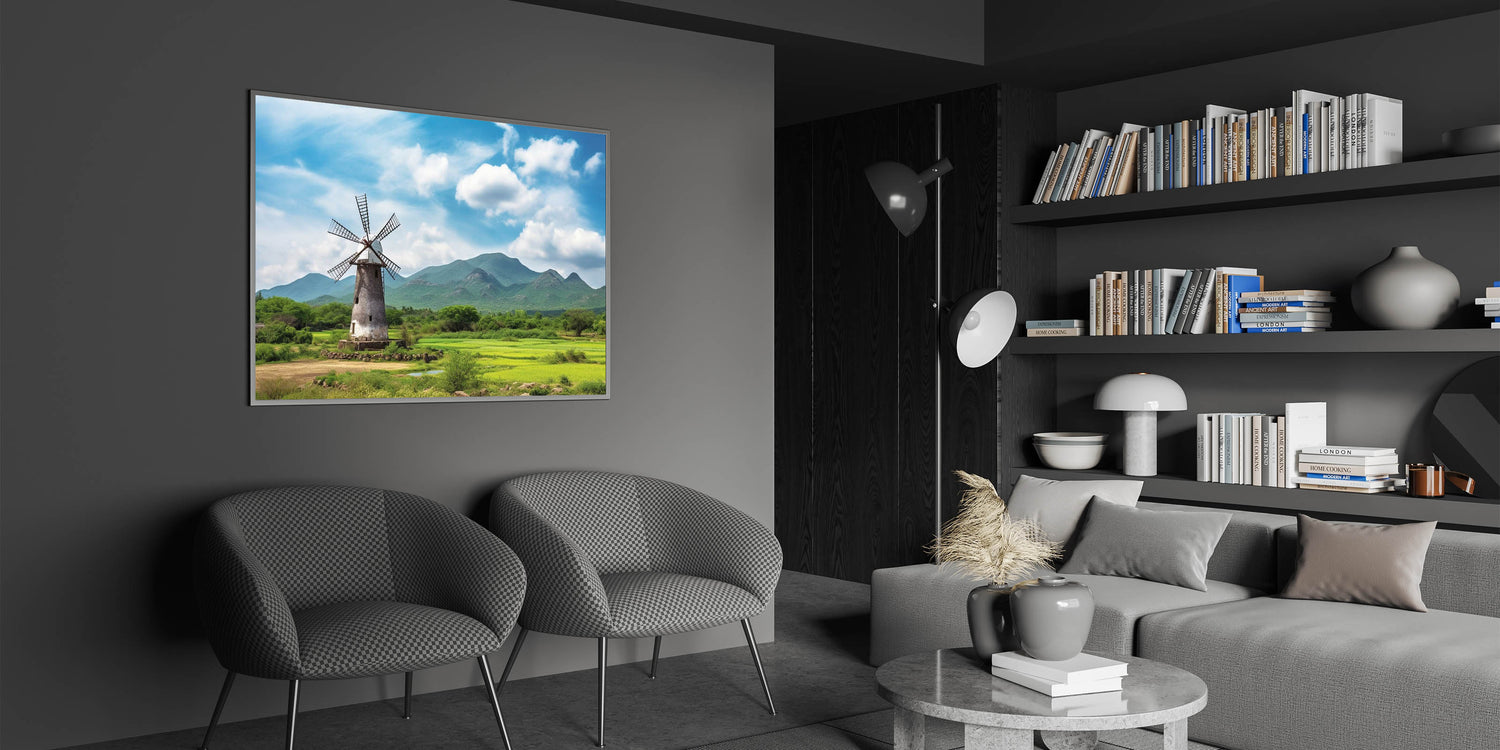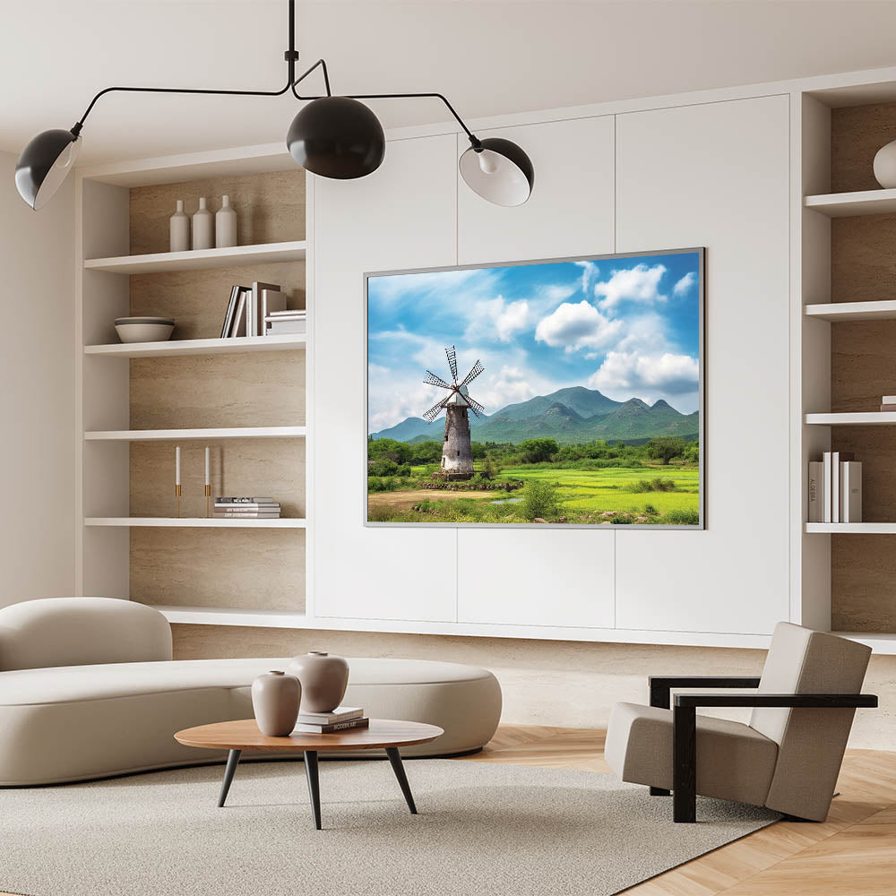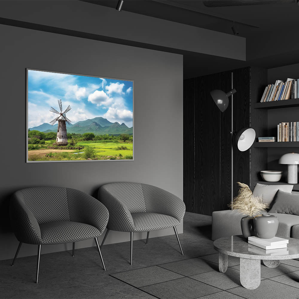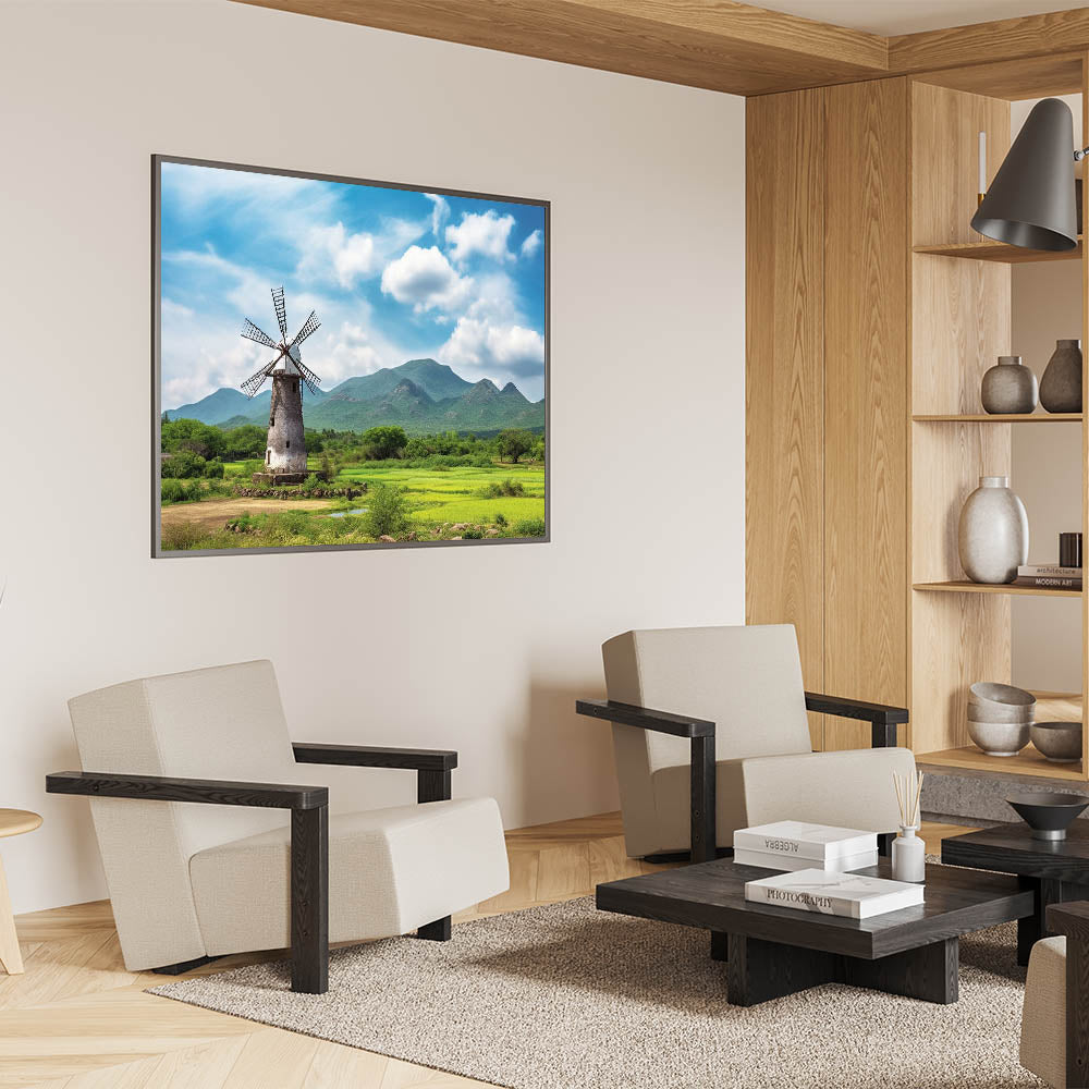 Immerse yourself in the serene beauty of the countryside with this rustic windmill wall art, set against a backdrop of majestic mountains. The vivid greenery and the towering windmill create a scene of peaceful solitude, making this artwork a perfect addition to any room that seeks to capture the essence of nature. The bright blue sky and lush landscape bring a calming atmosphere to your living room, bedroom, or office, offering a touch of tranquility to your space.