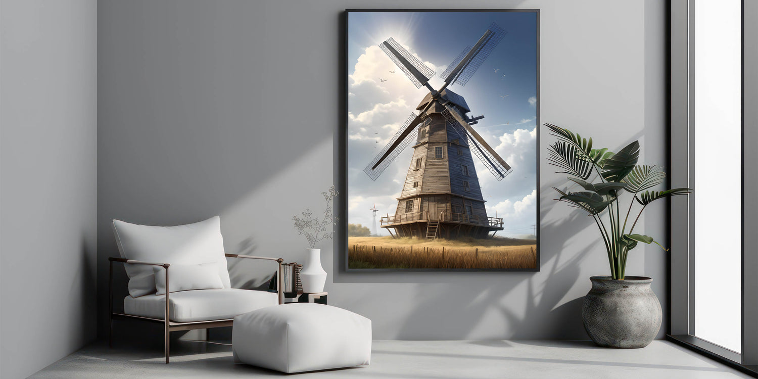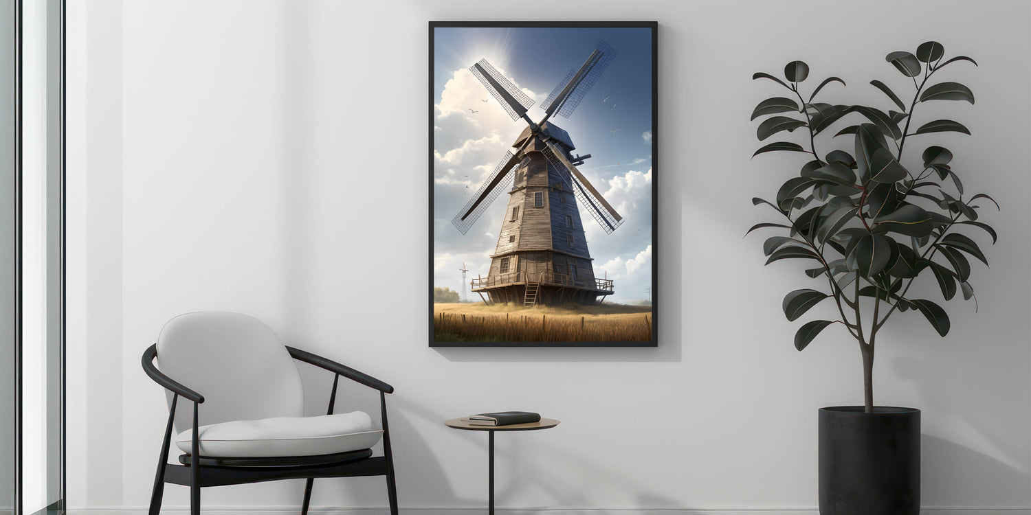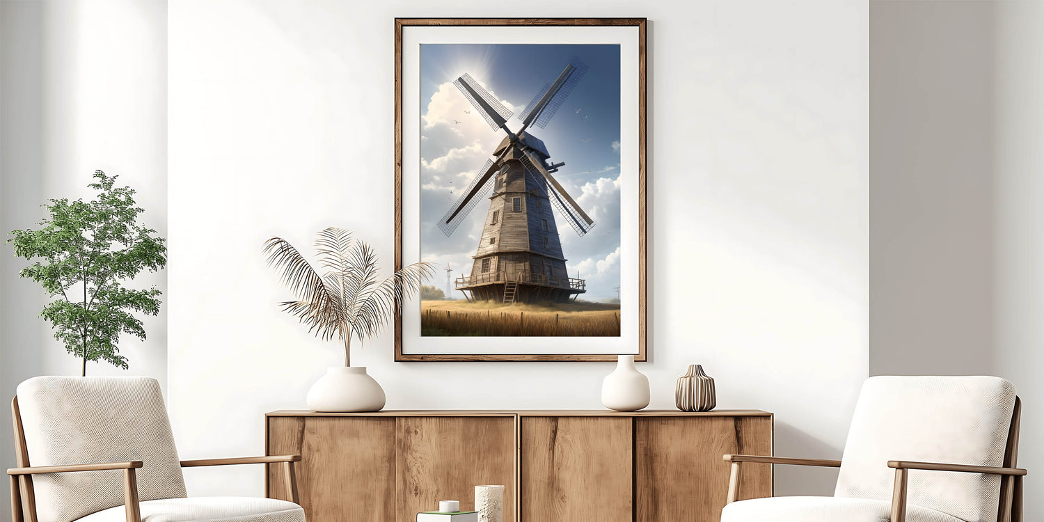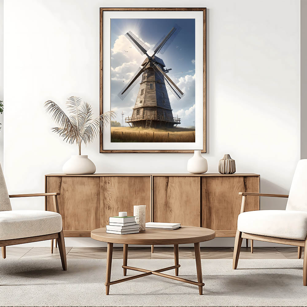 Whether you're decorating a cozy cottage or a modern space with a touch of rustic charm, this windmill art print will bring a sense of serenity and warmth to your surroundings. Enhance your home with this beautiful representation of countryside tranquility.