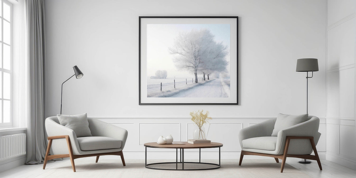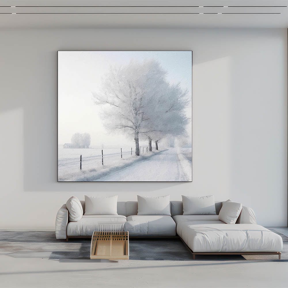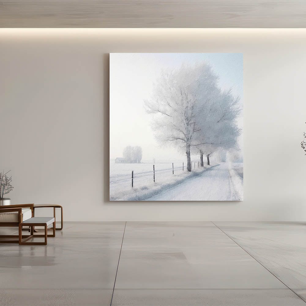 Capture the quiet elegance of winter with the Frosty Winter Road wall art. This stunning piece showcases a snow-covered path lined with frosted trees, their branches shimmering in the soft morning light. The pale blue sky and muted tones of white and gray evoke a sense of calm, making this artwork a perfect choice for winter decor. The minimalist composition highlights the beauty of the season, transporting you to a serene winter landscape.