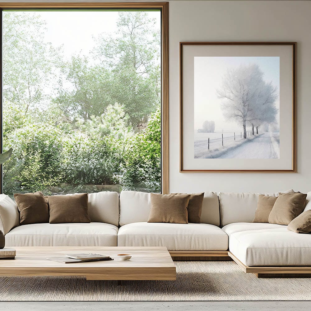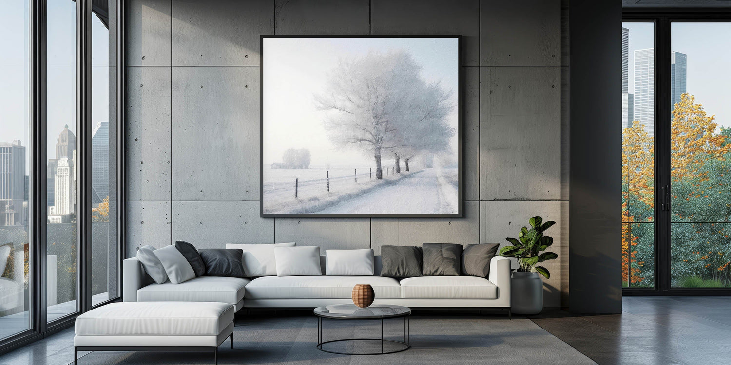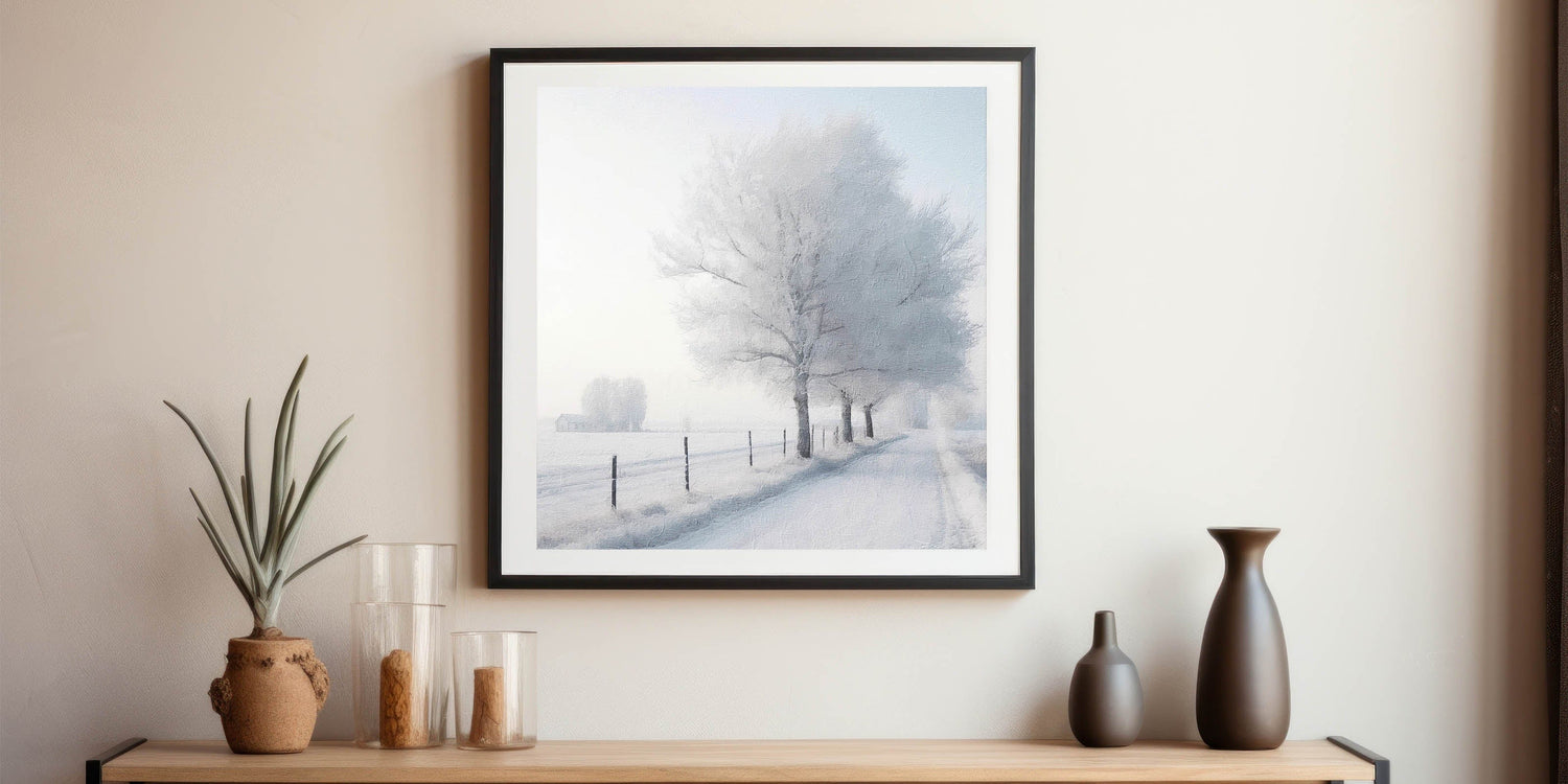 Capture the quiet elegance of winter with the Frosty Winter Road wall art. This stunning piece showcases a snow-covered path lined with frosted trees, their branches shimmering in the soft morning light. The pale blue sky and muted tones of white and gray evoke a sense of calm, making this artwork a perfect choice for winter decor. The minimalist composition highlights the beauty of the season, transporting you to a serene winter landscape.
